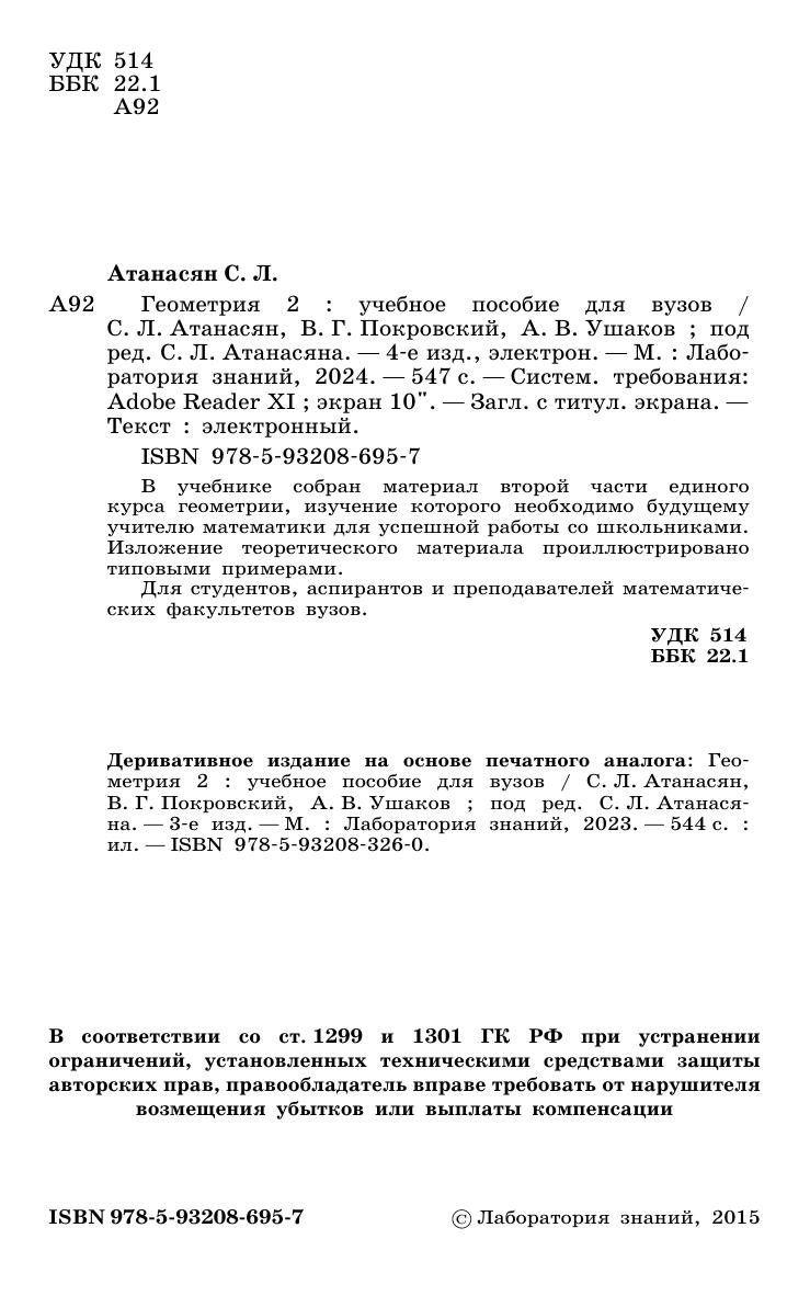 В учебнике собран материал второй части единого курса геометрии, изучение которого необходимо будущему учителю математики для успешной работы со школьниками. Изложение теоретического материала проиллюстрировано типовыми примерами. Для студентов, аспирантов и преподавателей математических факультетов вузов.