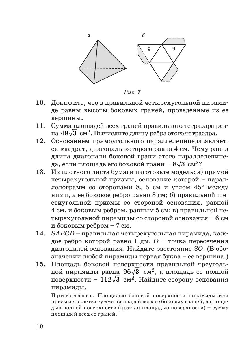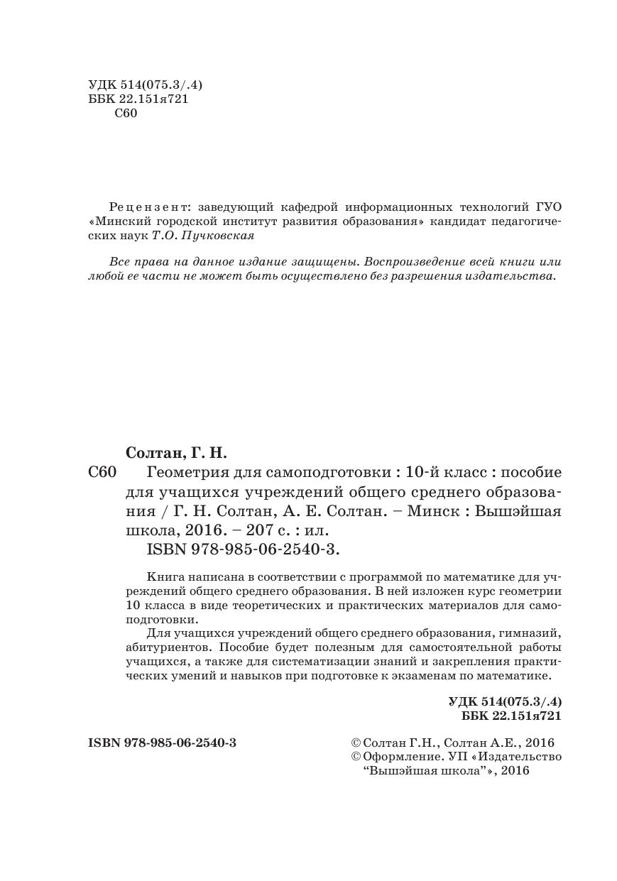 Kнига написана в соответствии с программой по математике для учреждений общего среднего образования. В ней изложен курс гео метрии 10 класса в виде теоретических и практических материалов для самоподготовки. Для учащихся учреждений общего среднего образования, гимназий, абитуриентов. Пособие будет полезным для самостоятельной работы учащихся, а также для систематизации знаний и закрепления практических умений и навыков при подготовке к экзаменам по математике.