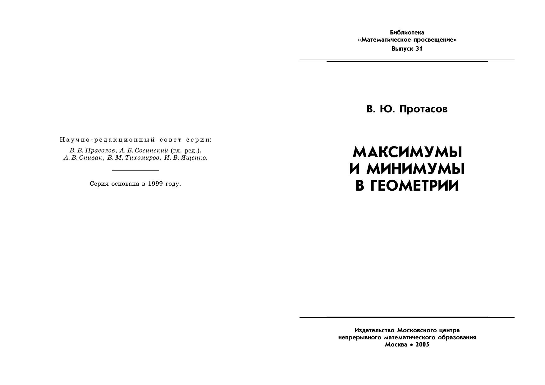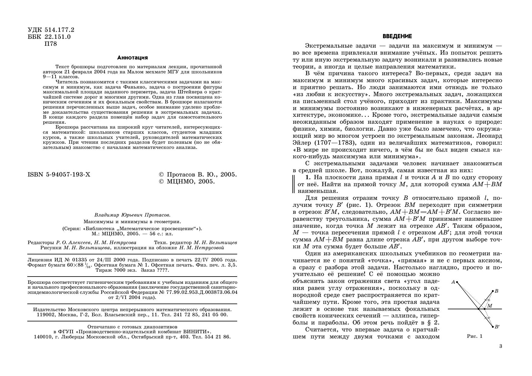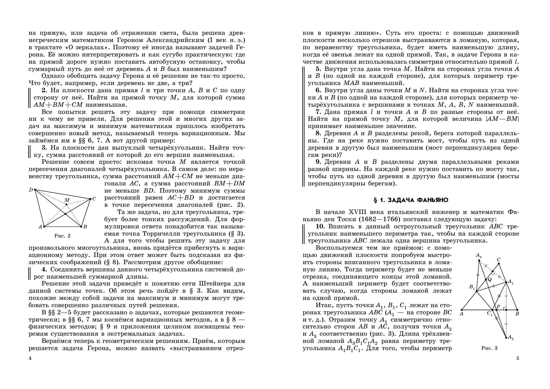 Текст брошюры подготовлен по материалам лекции, прочитанной ав- тором 21 февраля 2004 года на Малом мехмате МГУ для кольников 9—11 классов.Читатель познакомится с такими классическими задачами на максимум и минимум, как задача Фаньяно, задача о построении фигуры максимальной площади заданного периметра, задача Штейнера о кратчайшей системе дорог и многими другими. Одна из глав посвящена коническим сечениям и их фокальным свойствам. В брошюре излагаются решения перечисленных выше задач, особое внимание уделено проблеме доказательства существования решения в экстремальных задачах. В конце каждого раздела помещён набор задач для самостоятельного решения.Брошюра рассчитана на широкий круг читателей, интересующихся математикой: школьников старших классов, студентов младших курсов, а также школьных учителей, руководителей математических кружков. При чтении последних разделов будет полезным (но не обязательным) знакомство с началами математического анализа.