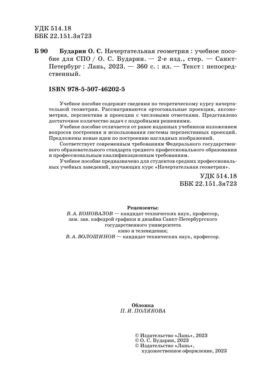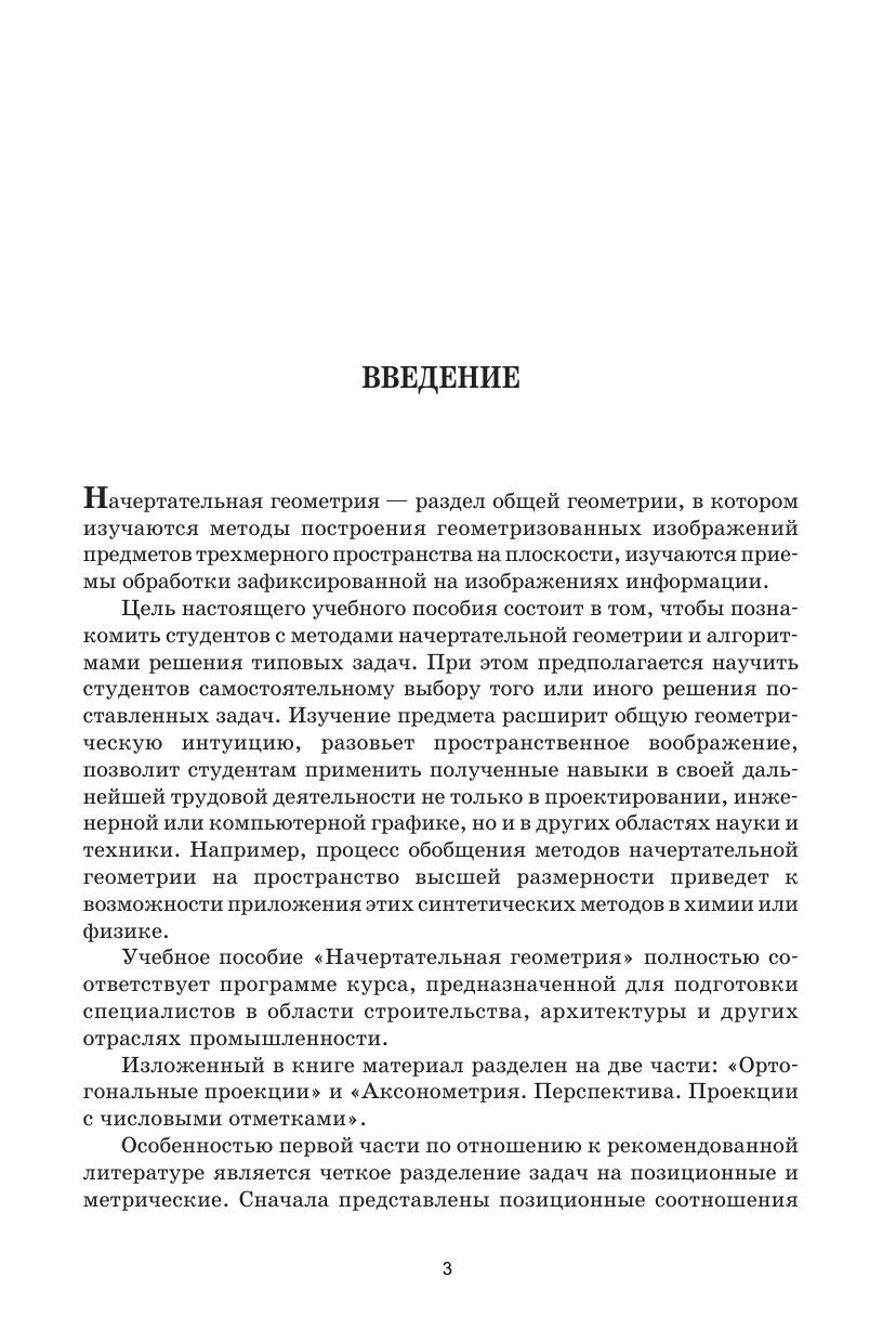 Учебное пособие содержит сведения по теоретическому курсу начертательной геометрии. Рассматриваются ортогональные проекции, аксонометрия, перспектива и проекции с числовыми отметками. Представлено достаточное количество задач с подробными решениями. Учебное пособие отличается от ранее изданных учебников изложением вопросов построения и использования системы перспективных проекций. Предложены новые идеи по построению наглядных изображений. Соответствует современным требованиям Федерального государственного образовательного стандарта среднего профессионального образования и профессиональным квалификационным требованиям. Учебное пособие предназначено для студентов средних профессиональных учебных заведений, изучающих курс «Начертательная геометрия».