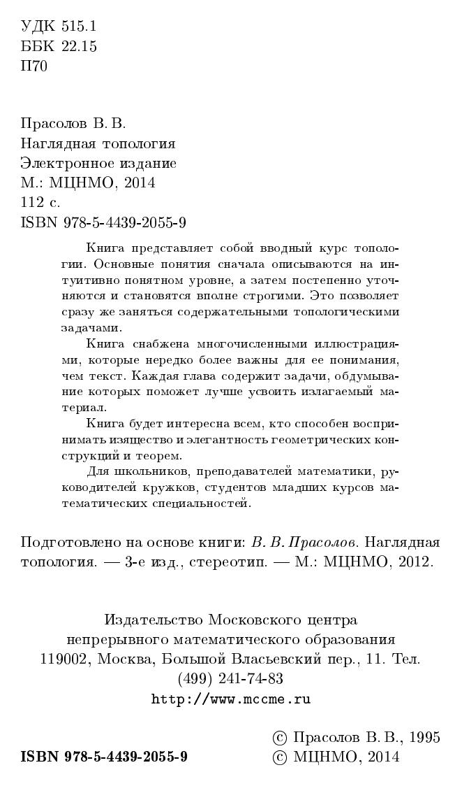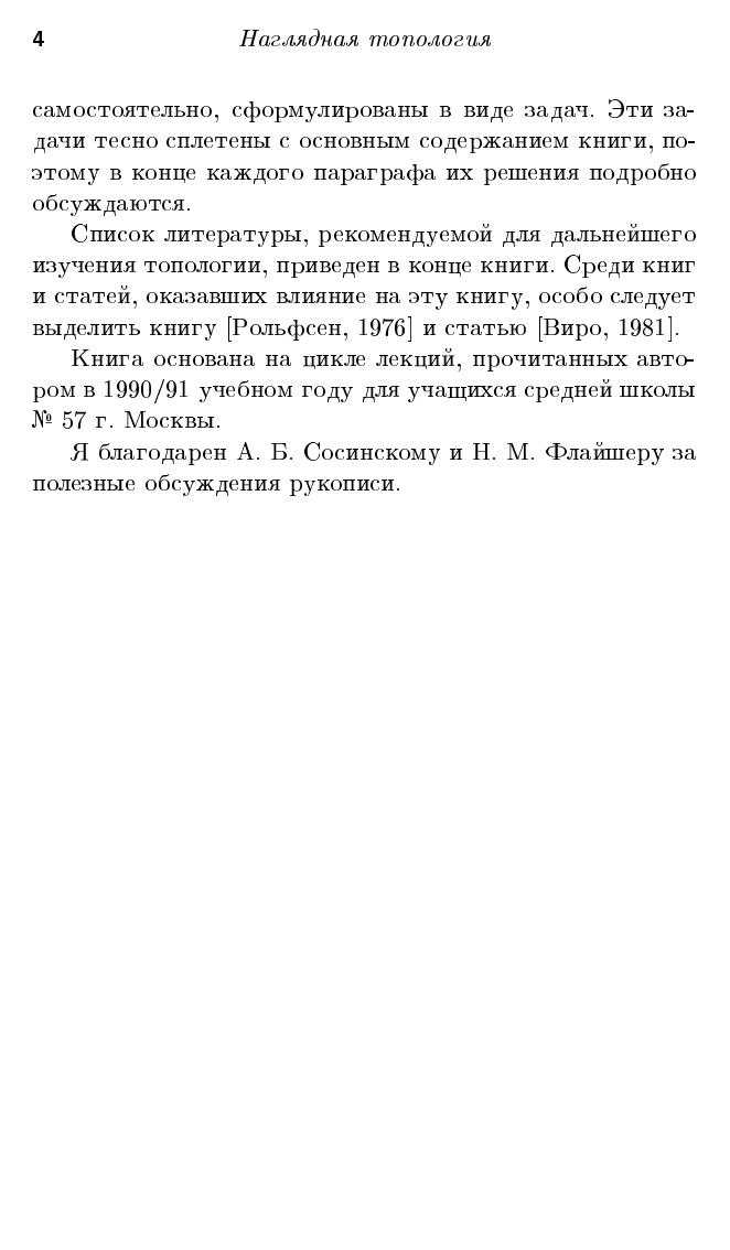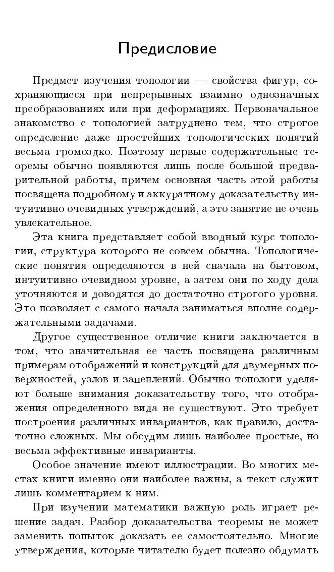 Книга представляет собой вводный курс топологии. Основные понятия сначала описываются на интуитивно понятном уровне, а затем постепенно уточняются и становятся вполне строгими. Это позволяет сразу же заняться содержательными топологическими задачами. Книга снабжена многочисленными иллюстрациями, которые нередко более важны для ее понимания, чем текст. Каждая глава содержит задачи, обдумывание которых поможет лучше усвоить излагаемый материал.Книга будет интересна всем, кто способен воспринимать изящество и элегантность геометрических конструкций и теорем. Для школьников, преподавателей математики, руководителей кружков, студентов младших курсов математических специальностей.