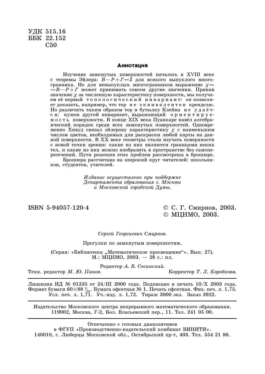 Изучение замкнутых поверхностей началось в XVIII веке с теоремы Эйлера для всякого выпуклого многогранника. Но для невыпуклых многогранников эйлерова характеристика может принимать совсем другие значения. Приняв ее значение за численную характеристику поверхности, мы получаем её первый топологический инвариант: он позволяет доказать, например, что тор не эквивалентен кренделю. Но различить таким образом тор и бутылку Клейна не удаётся: нужен другой инвариант, выражающий ориентируемость поверхности. В конце XIX века Пуанкаре навёл алгебраический порядок среди всех замкнутых поверхностей. Одновременно Хивуд связал эйлерову характеристику с наименьшим числом цветов, необходимых для раскраски любой карты на данной поверхности. В XX веке геометры стали изучать поверхности с новой точки зрения: какие из них являются границами неких тел, и какие из них можно изобразить в пространстве без самопересечений. Пути решения этих проблем рассмотрены в брошюре.Брошюра рассчитана на широкий круг читателей: школьников, студентов, учителей.