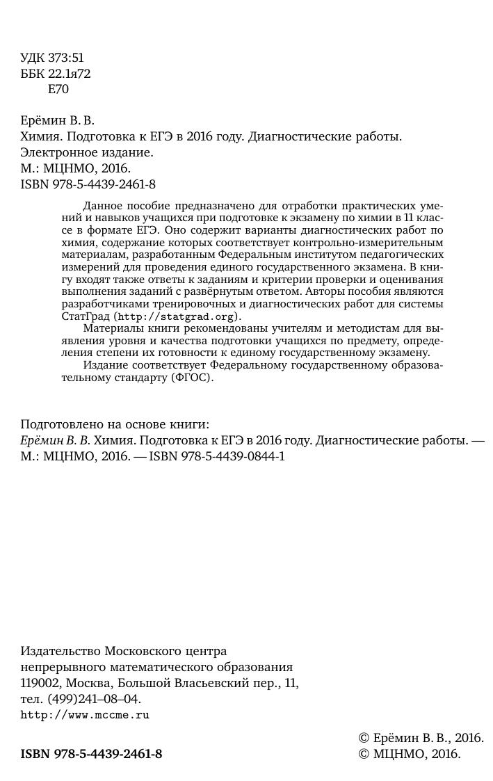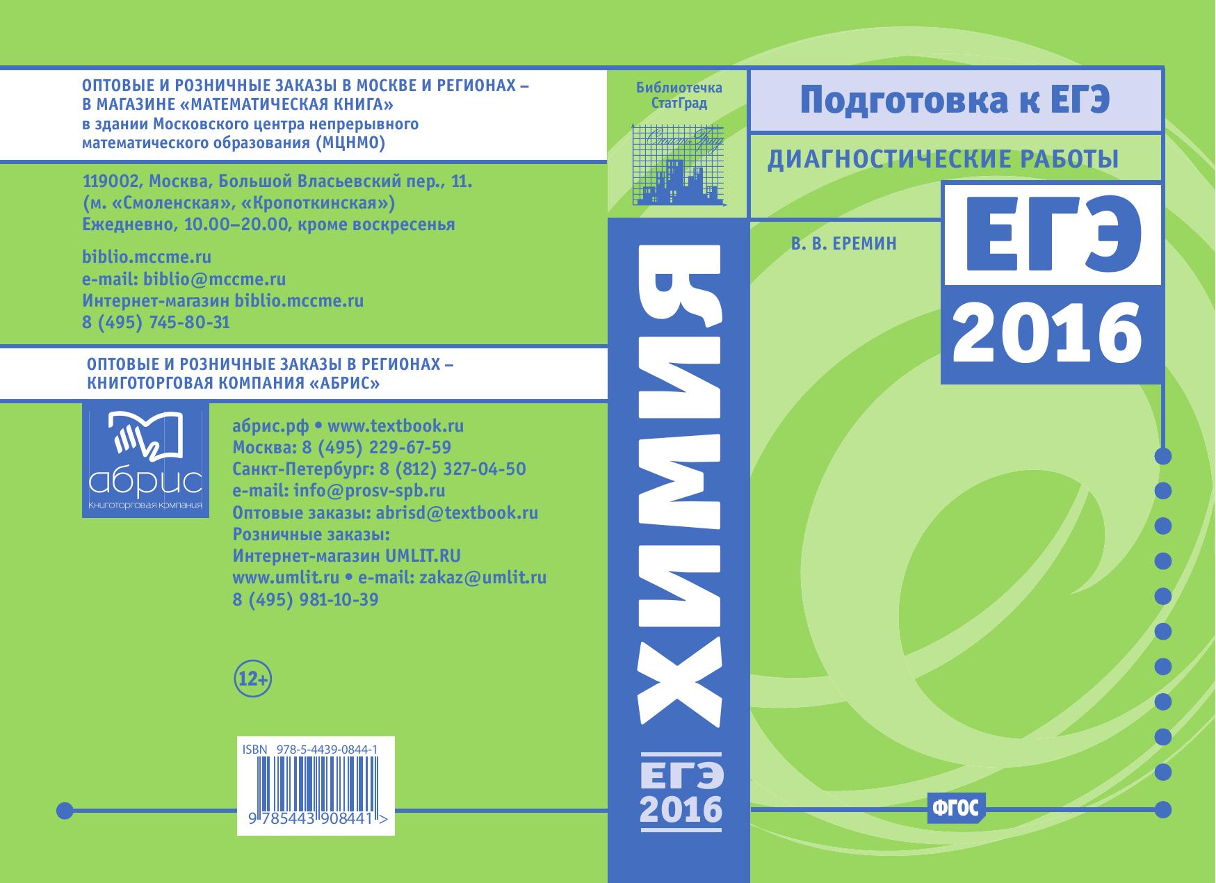 Данное пособие предназначено для отработки практических умений и навыков учащихся при подготовке к экзамену по химии в 11 классе в формате ЕГЭ. Оно содержит варианты диагностических работ по химии, содержание которых соответствует контрольно-измерительным материалам, разработанным Федеральным институтом педагогических измерений для проведения единого государственного экзамена. В книгу входят также ответы к заданиям и критерии проверки и оценивания выполнения заданий с развёрнутым ответом. Авторы пособия являются разработчиками тренировочных и диагностических работ для системы СтатГрад (http://statgrad.org). Материалы книги рекомендованы учителям и методистам для выявления уровня и качества подготовки учащихся по предмету, определения степени их готовности к единому государственному экзамену. Издание соответствует Федеральному государственному образовательному стандарту (ФГОС).