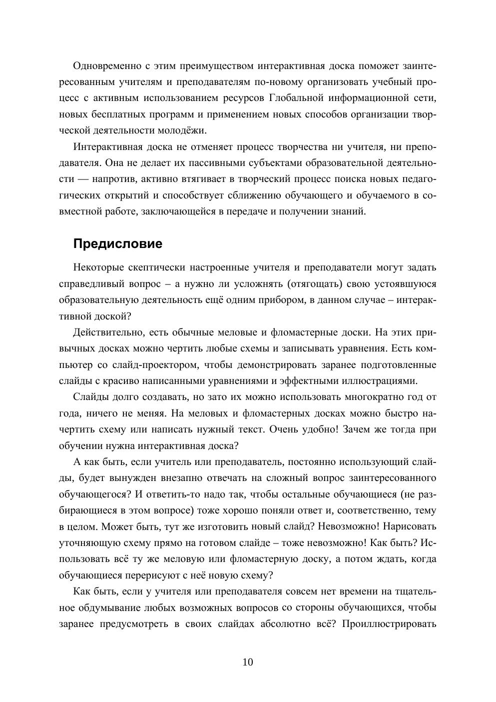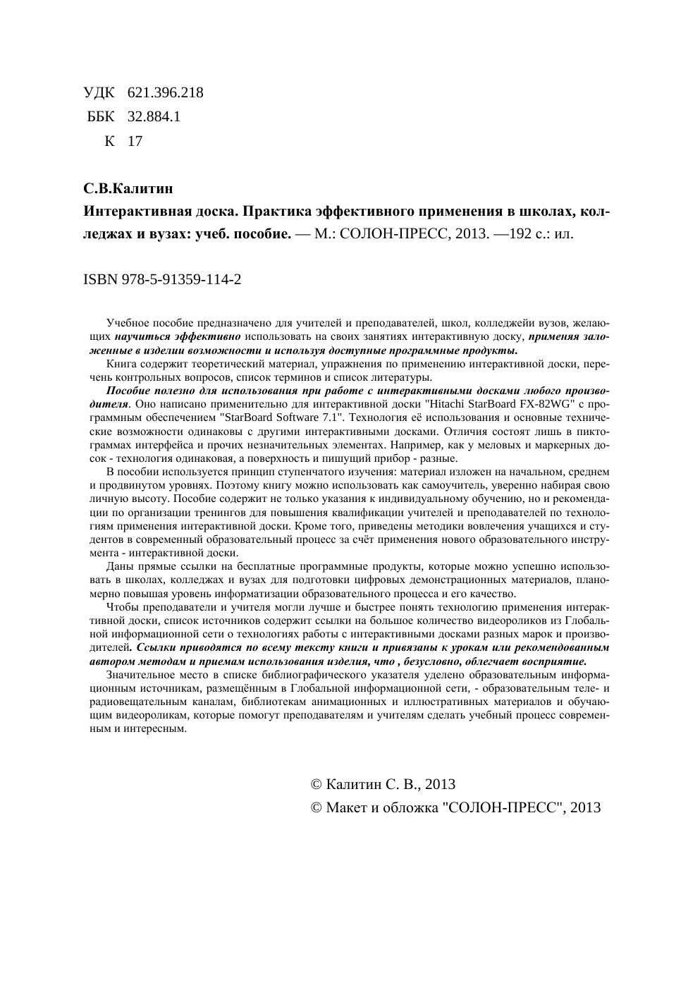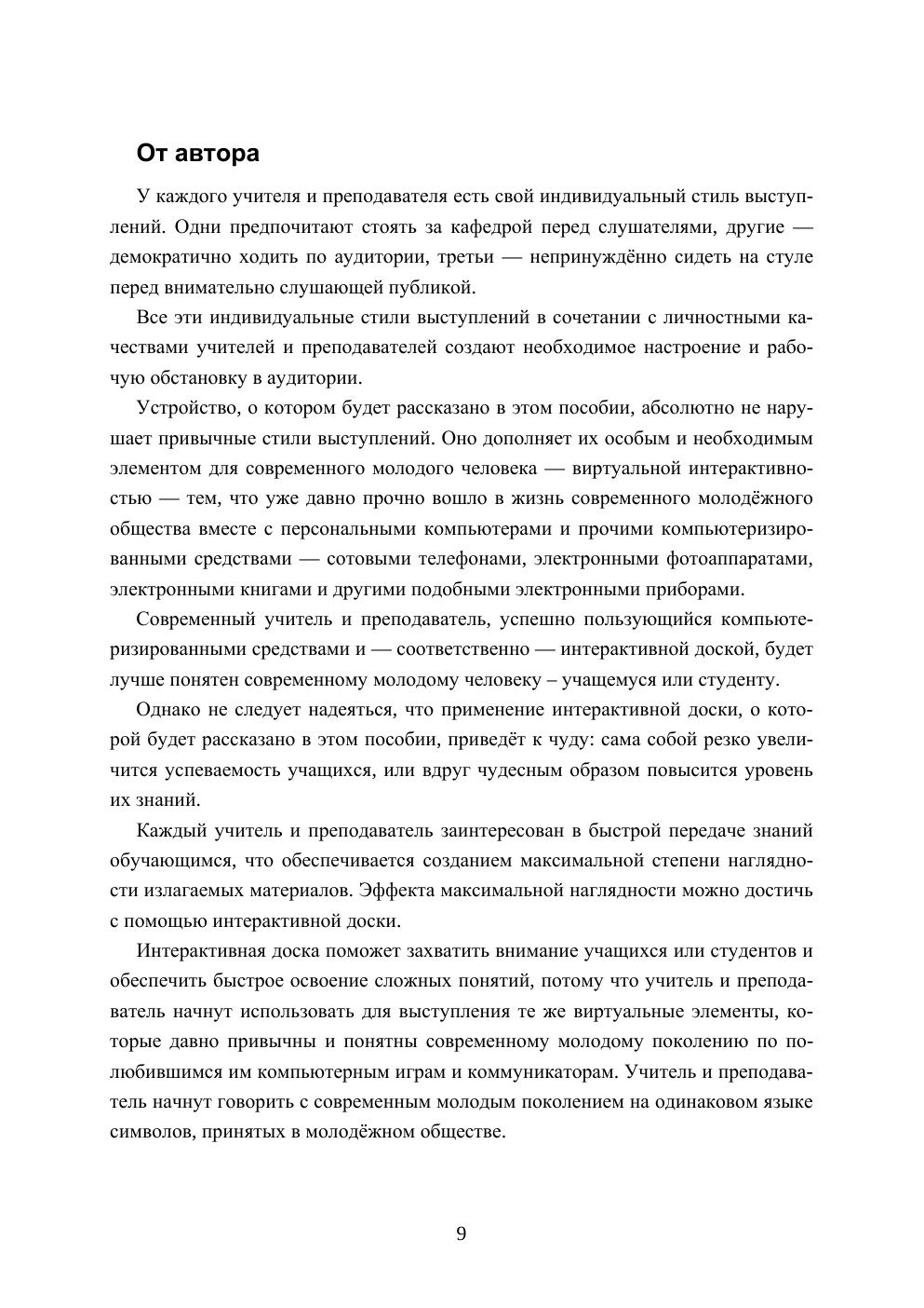 Учебное пособие предназначено для учителей и преподавателей, школ, колледжей и вузов, желающих научиться эффективно использовать на своих занятиях интерактивную доску, применяя заложенные в изделии возможности и используя доступные программные продукты. Книга содержит теоретический материал, упражнения по применению интерактивной доски, перечень контрольных вопросов, список терминов и список литературы. Пособие полезно для использования при работе с интерактивными досками любого производителя. Оно написано применительно для интерактивной доски "Hitachi StarBoard FX-82WG" с программным обеспечением "StarBoard Software 7.1". Технология её использования и основные технические возможности одинаковы с другими интерактивными досками. Отличия состоят лишь в пиктограммах интерфейса и прочих незначительных элементах. Например, как у меловых и маркерных досок - технология одинаковая, а поверхность и пишущий прибор - разные. В пособии используется принцип ступенчатого изучения: материал изложен на начальном, среднем и продвинутом уровнях. Поэтому книгу можно использовать как самоучитель, уверенно набирая свою личную высоту. Пособие содержит не только указания к индивидуальному обучению, но и рекомендации по организации тренингов для повышения квалификации учителей и преподавателей по технологиям применения интерактивной доски. Кроме того, приведены методики вовлечения учащихся и студентов в современный образовательный процесс за счёт применения нового образовательного инструмента - интерактивной доски. Даны прямые ссылки на бесплатные программные продукты, которые можно успешно использовать в школах, колледжах и вузах для подготовки цифровых демонстрационных материалов, планомерно повышая уровень информатизации образовательного процесса и его качество. Чтобы преподаватели и учителя могли лучше и быстрее понять технологию применения интерактивной доски, список источников содержит ссылки на большое количество видеороликов из Глобальной информационной сети о технологиях работы с интерактивными досками разных марок и производителей. Ссылки приводятся по всему тексту книги и привязаны к урокам или рекомендованным автором методам и приемам использования изделия, что , безусловно, облегчает восприятие. Значительное место в списке библиографического указателя уделено образовательным информационным источникам, размещённым в Глобальной информационной сети, - образовательным теле- и радиовещательным каналам, библиотекам анимационных и иллюстративных материалов и обучающим видеороликам, которые помогут преподавателям и учителям сделать учебный процесс современным и интересным.