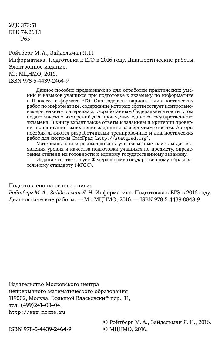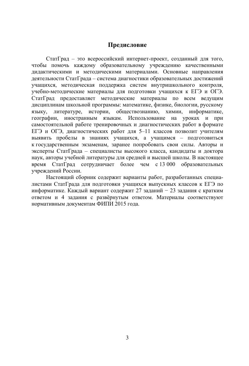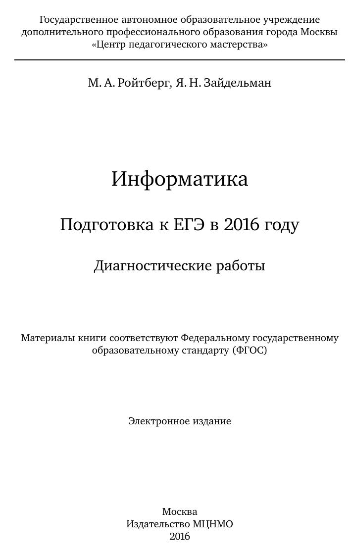 Данное пособие предназначено для отработки практических умений и навыков учащихся при подготовке к экзамену по информатике в 11 классе в формате ЕГЭ. Оно содержит варианты диагностических работ по информатике, содержание которых соответствует контрольно- измерительным материалам, разработанным Федеральным институтом педагогических измерений для проведения единого государственного экзамена. В книгу входят также ответы к заданиям и критерии проверки и оценивания выполнения заданий с развёрнутым ответом. Авторы пособия являются разработчиками тренировочных и диагностических работ для системы СтатГрад (http://statgrad.org). Материалы книги рекомендованы учителям и методистам для выявления уровня и качества подготовки учащихся по предмету, определения степени их готовности к единому государственному экзамену. Издание соответствует Федеральному государственному образовательному стандарту (ФГОС).