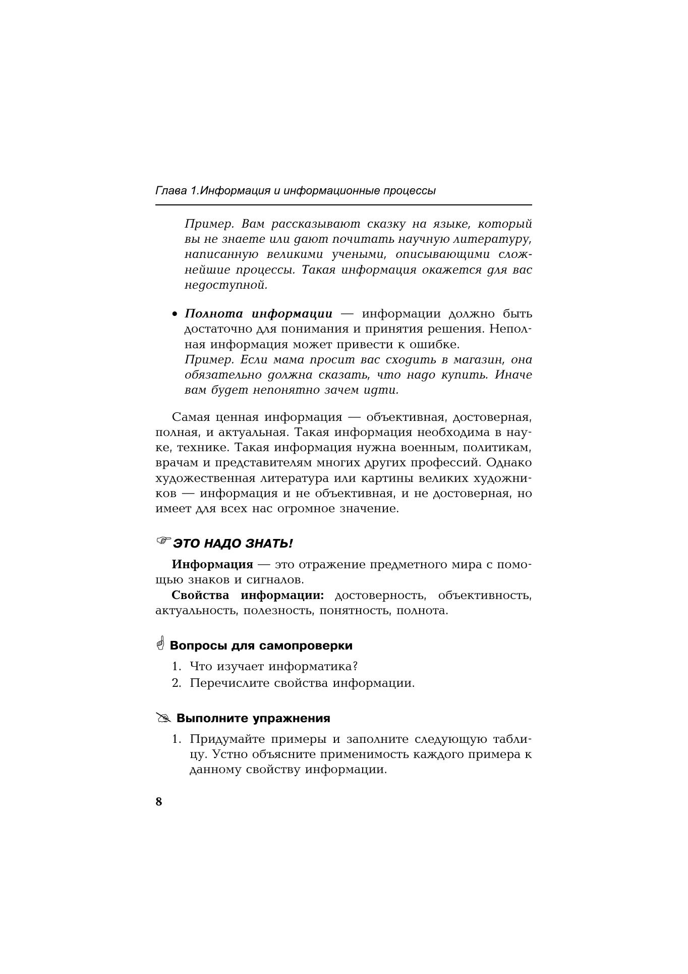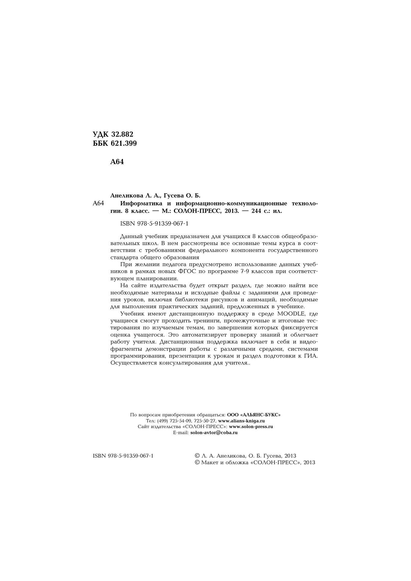 Данный учебник предназначен для учащихся 8 классов общеобразовательных школ. В нем рассмотрены все основные темы курса в соответствии с требованиями федерального компонента государственного стандарта общего образования. При желании педагога предусмотрено использование данных учебников в рамках новых ФГОС по программе 7-9 классов при соответствующем планировании. На сайте издательства будет открыт раздел, где можно найти все необходимые материалы и исходные файлы с заданиями для проведения уроков, включая библиотеки рисунков и анимаций, необходимые для выполнения практических заданий, предложенных в учебнике. Учебник имеют дистанционную поддержку в среде MOODLE, где учащиеся смогут проходить тренинги, промежуточные и итоговые тестирования по изучаемым темам, по завершении которых фиксируется оценка учащегося. Это автоматизирует проверку знаний и облегчает работу учителя. Дистанционная поддержка включает в себя и видеофрагменты демонстрации работы с различными средами, системами программирования, презентации к урокам и раздел подготовки к ГИА. Осуществляется консультирования для учителя..