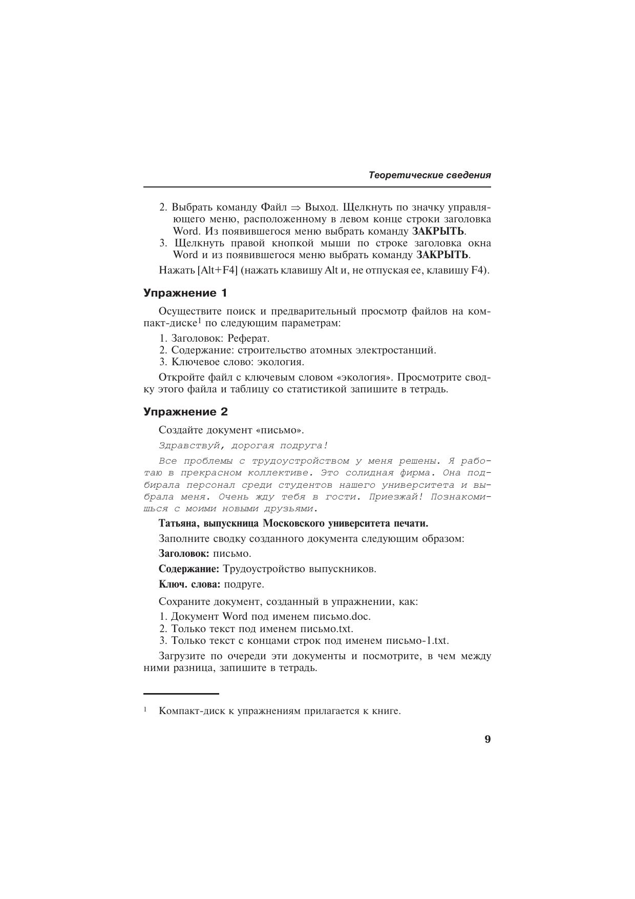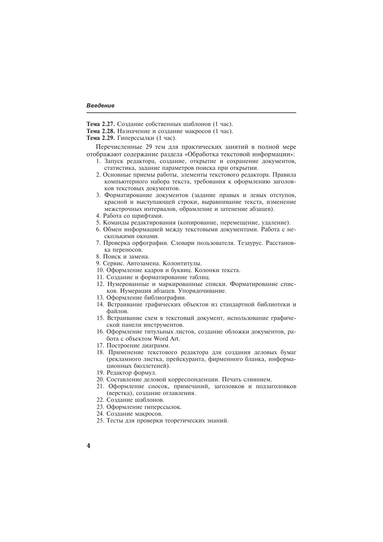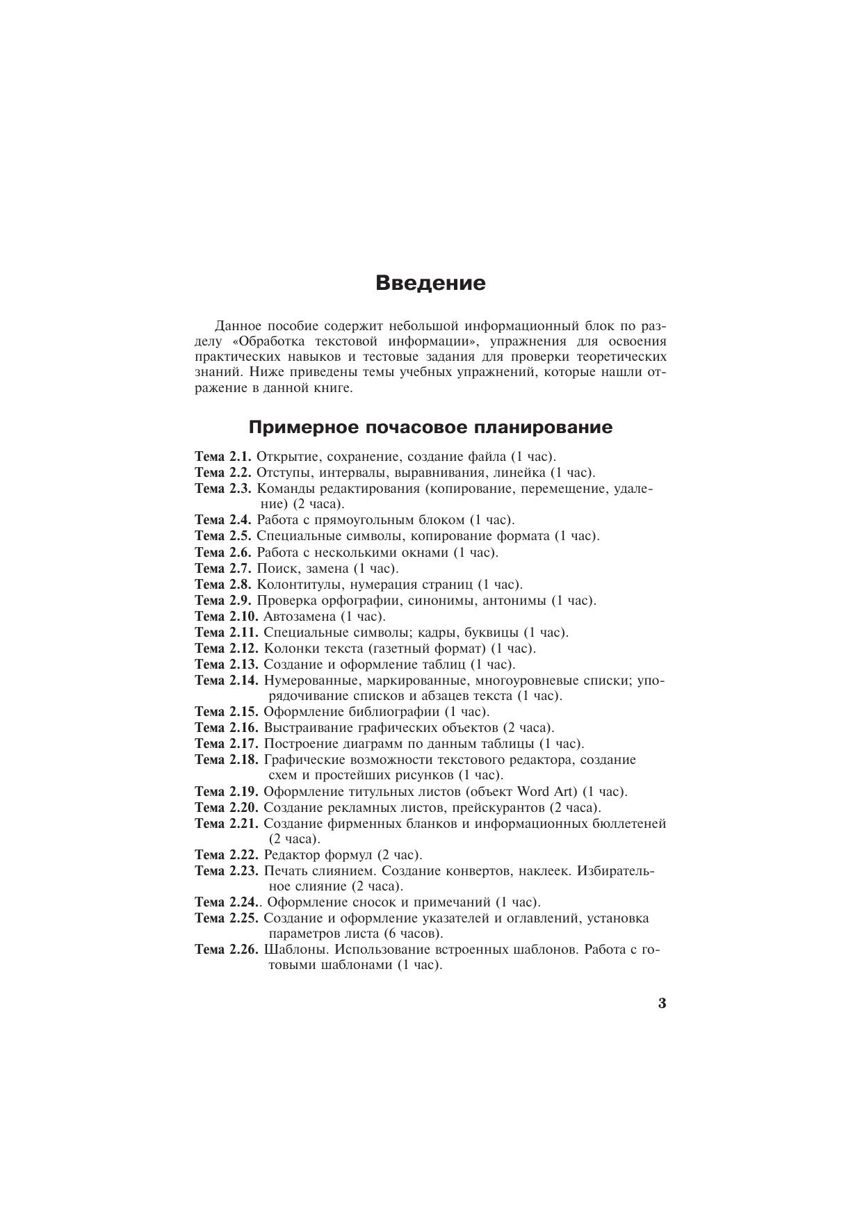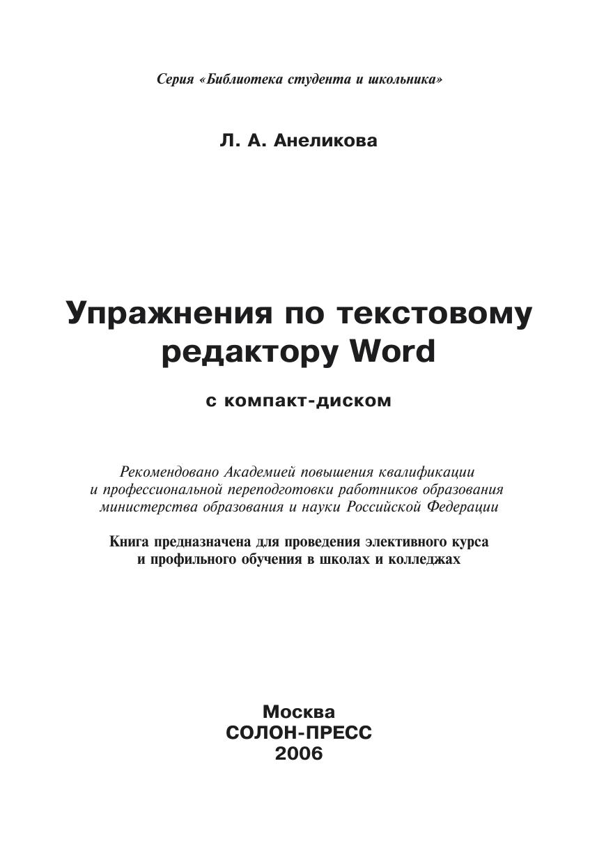 Сборник «Упражнения по Word» является учебным пособием предназначенным для проведения практических занятий при изучении раздела «Обработка текстовой информации» в элективных и профильных курсах информатики. Данное пособие может быть использовано как учителями и преподавателями в качестве дидактического материала, так и учащимися школ, колледжей, техникумов и студентами вузов. Количество упражнений по предложенным темам может быть адаптировано под количество часов, выделенных на изучение данной темы.