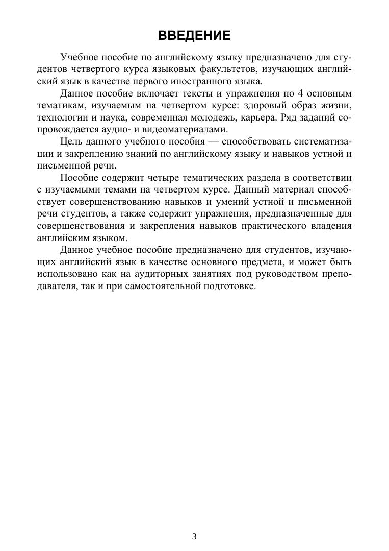 Данное учебное пособие ставит целью способствовать систематизации и закреплению знаний по английскому языку, а также навыков устной и письменной речи. Пособие включает тексты и упражнения по четырем основным тематикам, изучаемым на старших курсах: здоровый образ жизни, технологии и наука, современная молодежь, карьера. Ряд заданий сопровождается аудио- и видеоматериалами. Учебное пособие предназначено для студентов вузов, изучающих английский язык в качестве основного предмета, и может быть использовано как на аудиторных занятиях под руководством преподавателя, так и при самостоятельной подготовке.