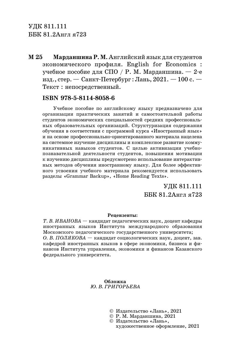 Учебное пособие по английскому языку предназначено для организации практических занятий и самостоятельной работы студентов экономических специальностей средних профессиональных образовательных организаций. Структуризация содержания обучения в соответствии с программой курса «Иностранный язык» и на основе профессионально-ориентированного материала нацелена на системное изучение дисциплины и комплексное развитие коммуникативных навыков студентов. С целью активизации учебно-познавательной деятельности студентов, повышения мотивации к изучению дисциплины предусмотрено использование интерактивных методов обучения иностранному языку. Для более эффективного усвоения учебного материала рекомендуется использовать разделы «Grammar Backup», «Home Reading Texts».