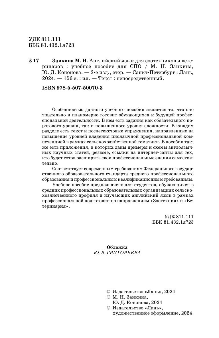 Особенностью данного учебного пособия является то, что оно тщательно и планомерно готовит обучающихся к будущей профессиональной деятельности. В нем есть задания как обязательного порогового уровня, так и повышенного уровня сложности. В каждом разделе есть текст и послетекстовые упражения, направленные на повышение уровней владения иноязычной профессиональной компетенцией в рамках сельскохозяйственной тематики. В пособии также есть приложения, в которых даны примеры и схемы англоязычных научных статей, резюме, ссылки на интернетсайты для тех, кто будет готов расширять свои профессиональные знания самостоятельно. Соответствует современным требованиям Федерального государственного образовательного стандарта среднего профессионального образования и профессиональным квалификационным требованиям. Учебное пособие предназначено для студентов, обучающихся в средних профессиональных образовательных организациях сельскохозяйственного профиля и изучающих английский язык в рамках профессиональной подготовки по направлениям «Зоотехния» и «Ветеринария».