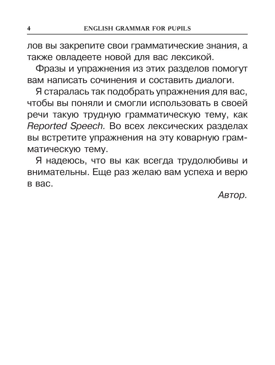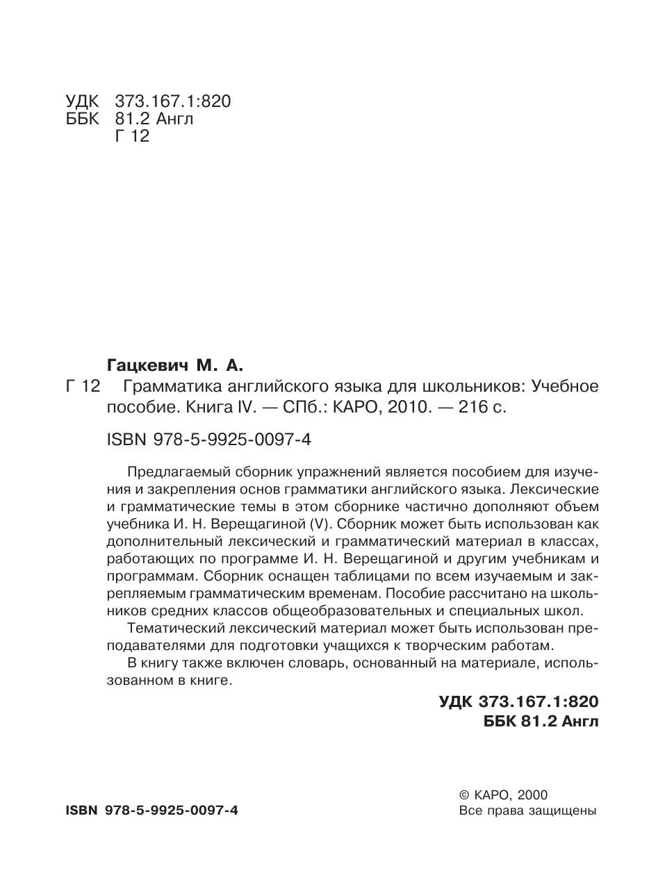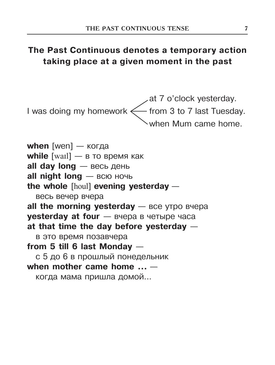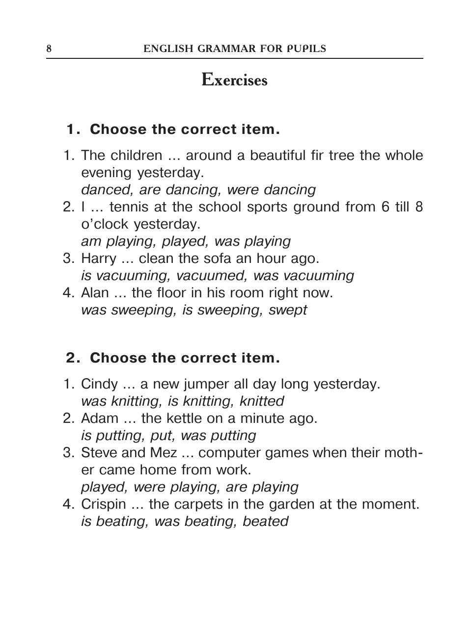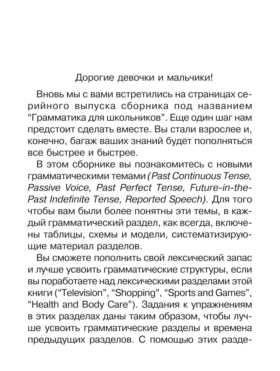 Предлагаемый сборник упражнений является пособием для изучения и закрепления основ грамматики английского языка. Лексические и грамматические темы в этом сборнике частично дополняют объем учебника И. Н. Верещагиной (V). Сборник может быть использован как дополнительный лексический и грамматический материал в классах, работающих по программе И. Н. Верещагиной и другим учебникам и программам. Сборник оснащен таблицами по всем изучаемым и закрепляемым грамматическим временам. Пособие рассчитано на школьников средних классов общеобразовательных и специальных школ. Тематический лексический материал может быть использован преподавателями для подготовки учащихся к творческим работам. В книгу также включен словарь, основанный на материале, использованном в книге.