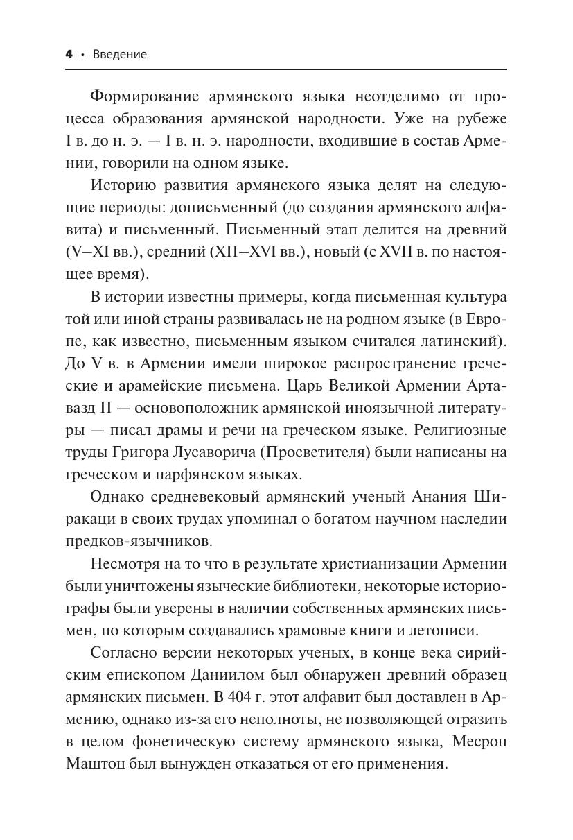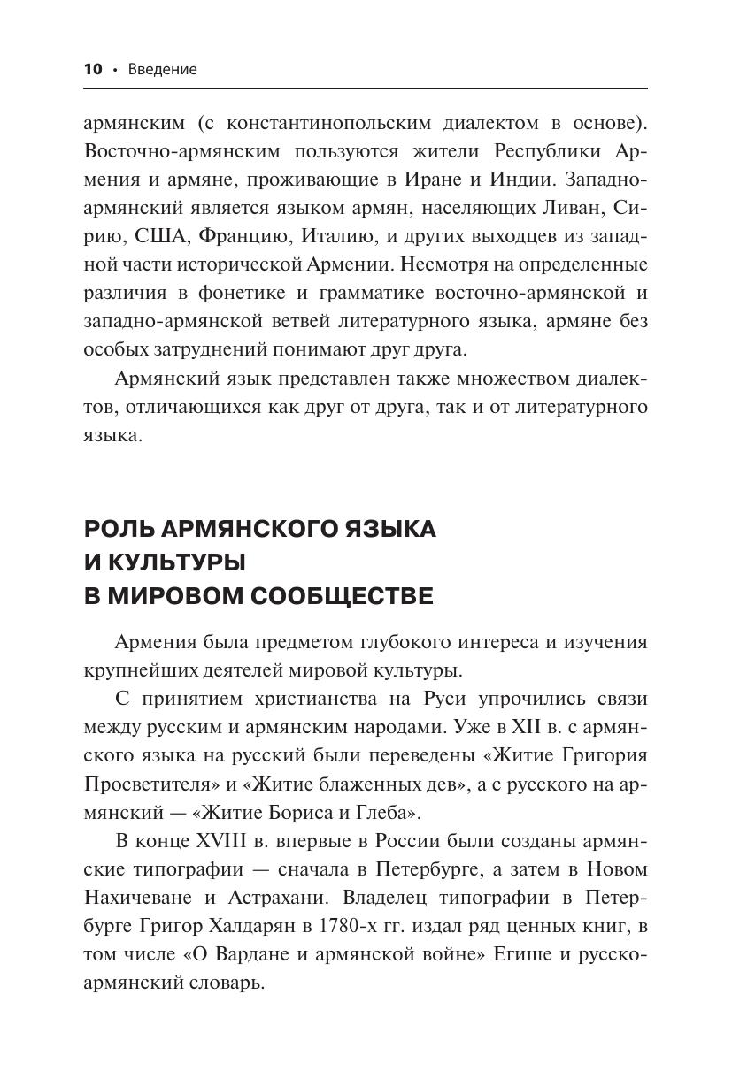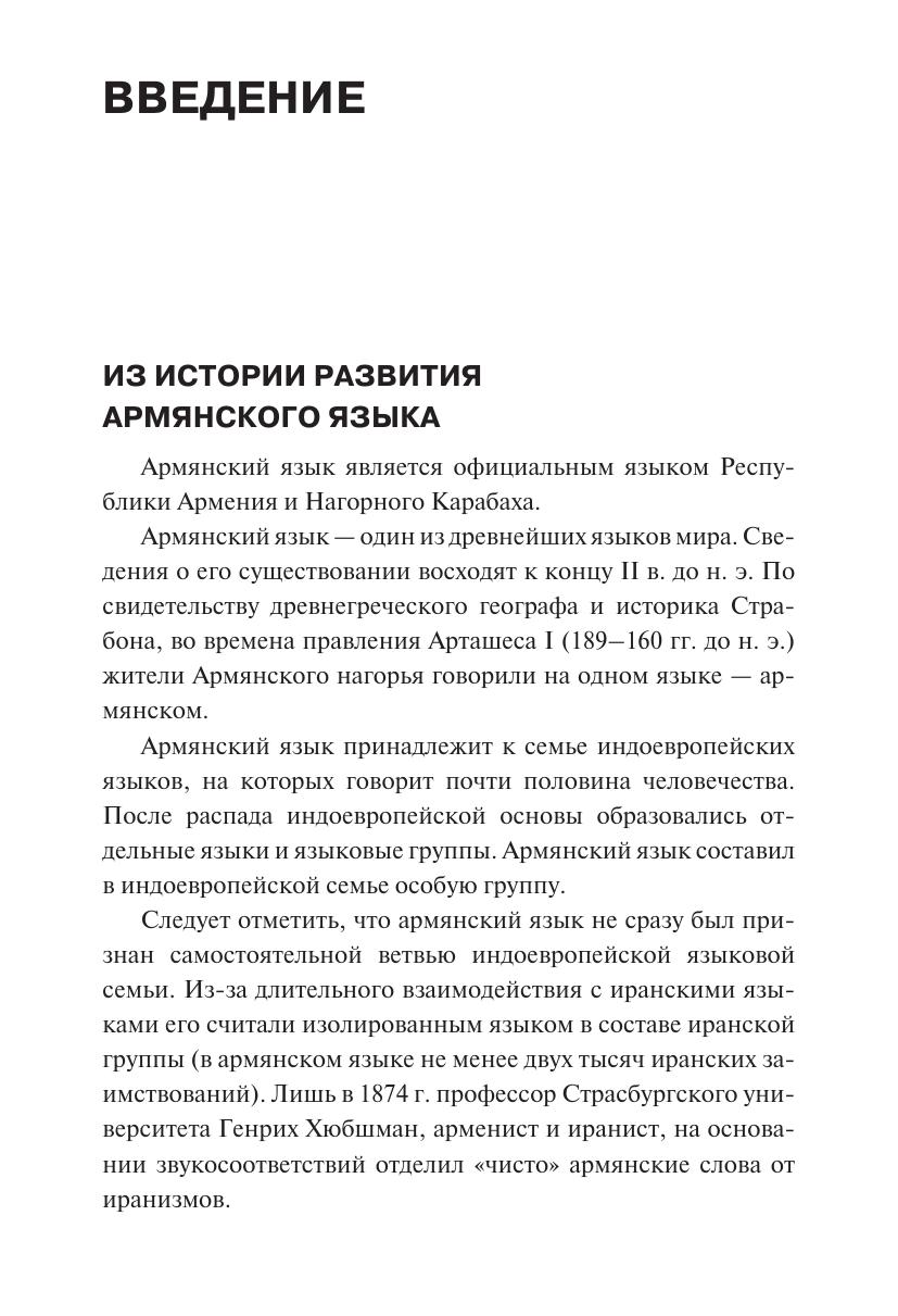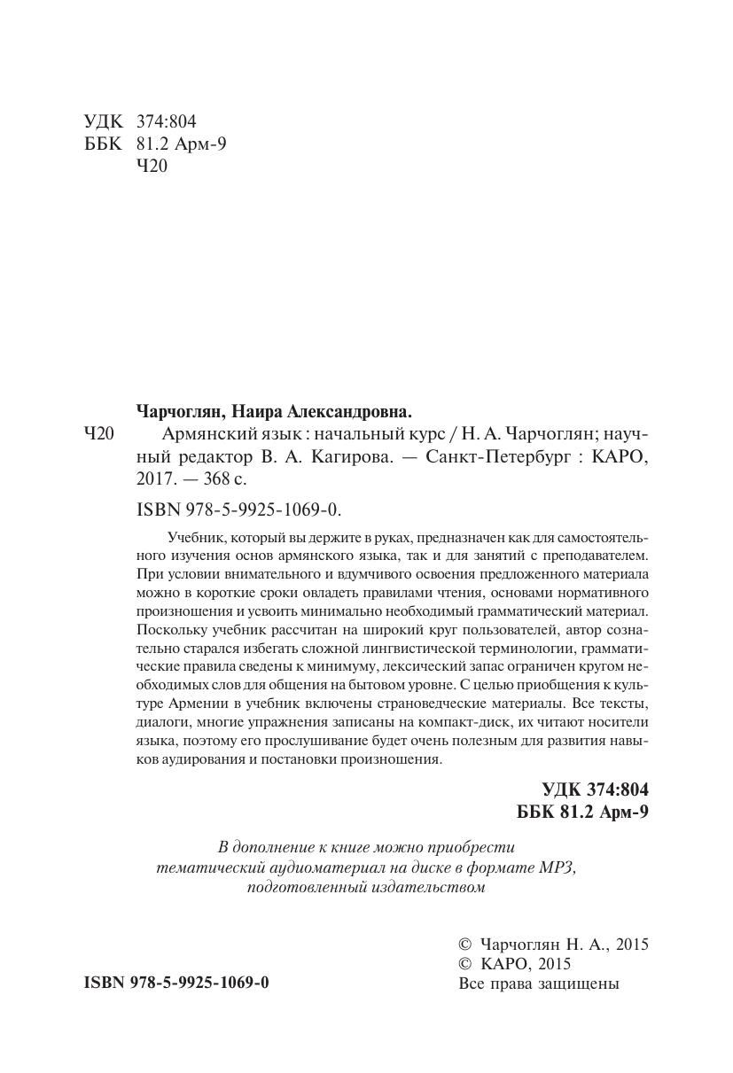 Учебник, который вы держите в руках, предназначен как для самостоятельного изучения основ армянского языка, так и для занятий с преподавателем. При условии внимательного и вдумчивого освоения предложенного материала можно в короткие сроки овладеть правилами чтения, основами нормативного произношения и усвоить минимально необходимый грамматический материал. Поскольку учебник рассчитан на широкий круг пользователей, автор сознательно старался избегать сложной лингвистической терминологии, грамматические правила сведены к минимуму, лексический запас ограничен кругом необходимых слов для общения на бытовом уровне. С целью приобщения к культуре Армении в учебник включены страноведческие материалы. Все тексты, диалоги, многие упражнения записаны на компакт-диск, их читают носители языка, поэтому его прослушивание будет очень полезным для развития навыков аудирования и постановки произношения.