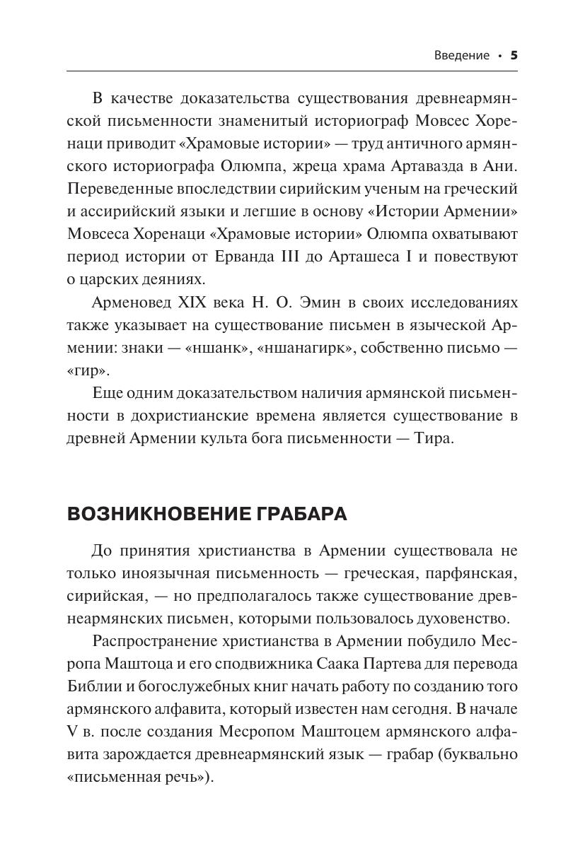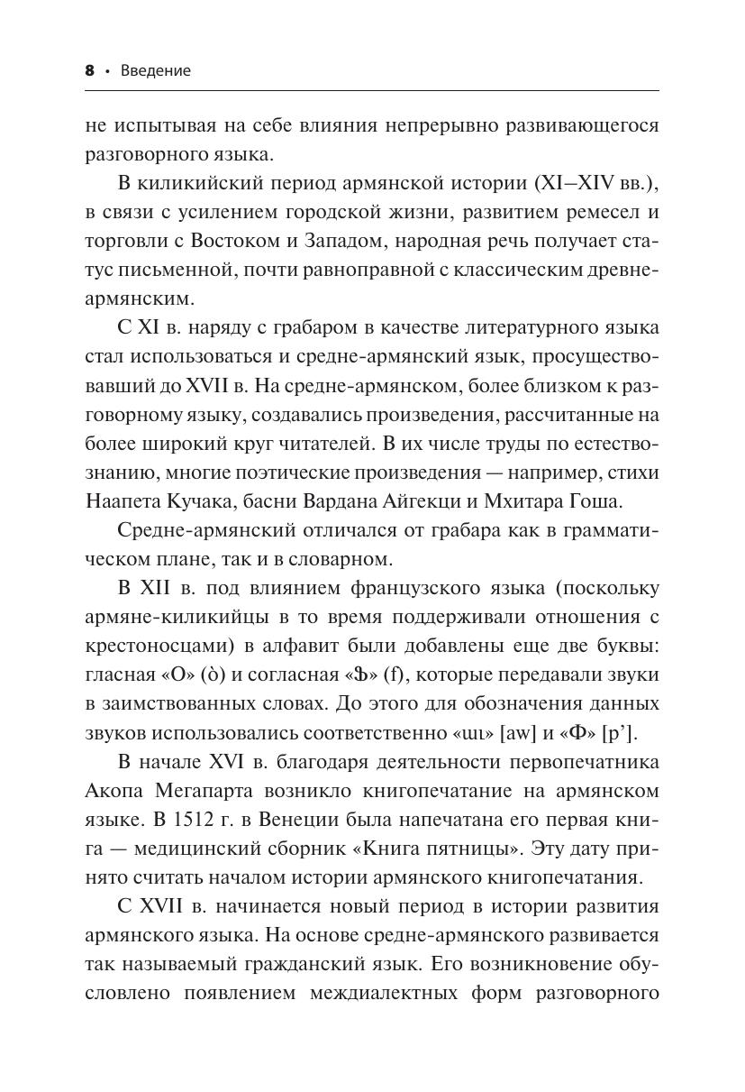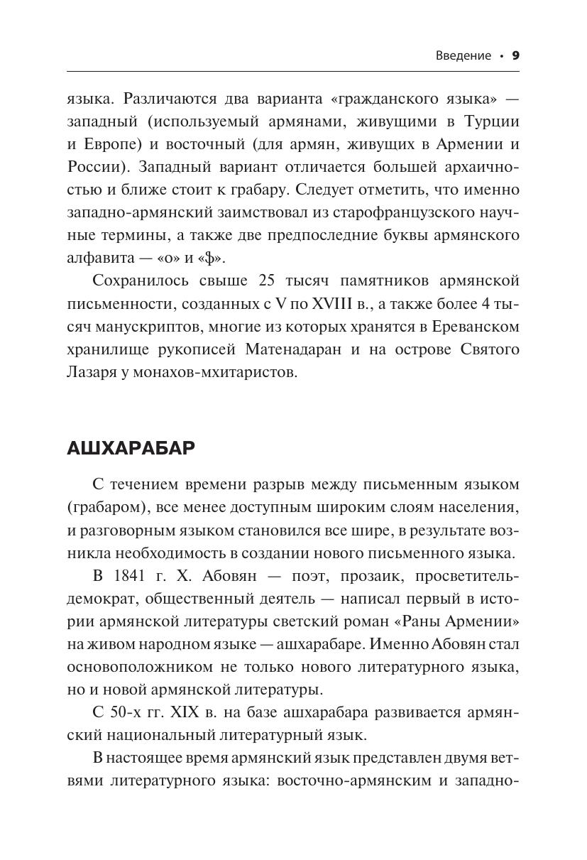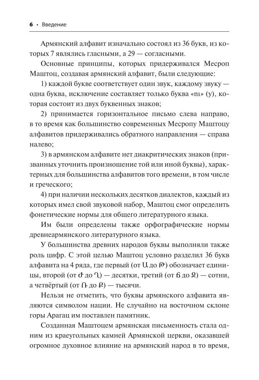 Учебник, который вы держите в руках, предназначен как для самостоятельного изучения основ армянского языка, так и для занятий с преподавателем. При условии внимательного и вдумчивого освоения предложенного материала можно в короткие сроки овладеть правилами чтения, основами нормативного произношения и усвоить минимально необходимый грамматический материал. Поскольку учебник рассчитан на широкий круг пользователей, автор сознательно старался избегать сложной лингвистической терминологии, грамматические правила сведены к минимуму, лексический запас ограничен кругом необходимых слов для общения на бытовом уровне. С целью приобщения к культуре Армении в учебник включены страноведческие материалы. Все тексты, диалоги, многие упражнения записаны на компакт-диск, их читают носители языка, поэтому его прослушивание будет очень полезным для развития навыков аудирования и постановки произношения.