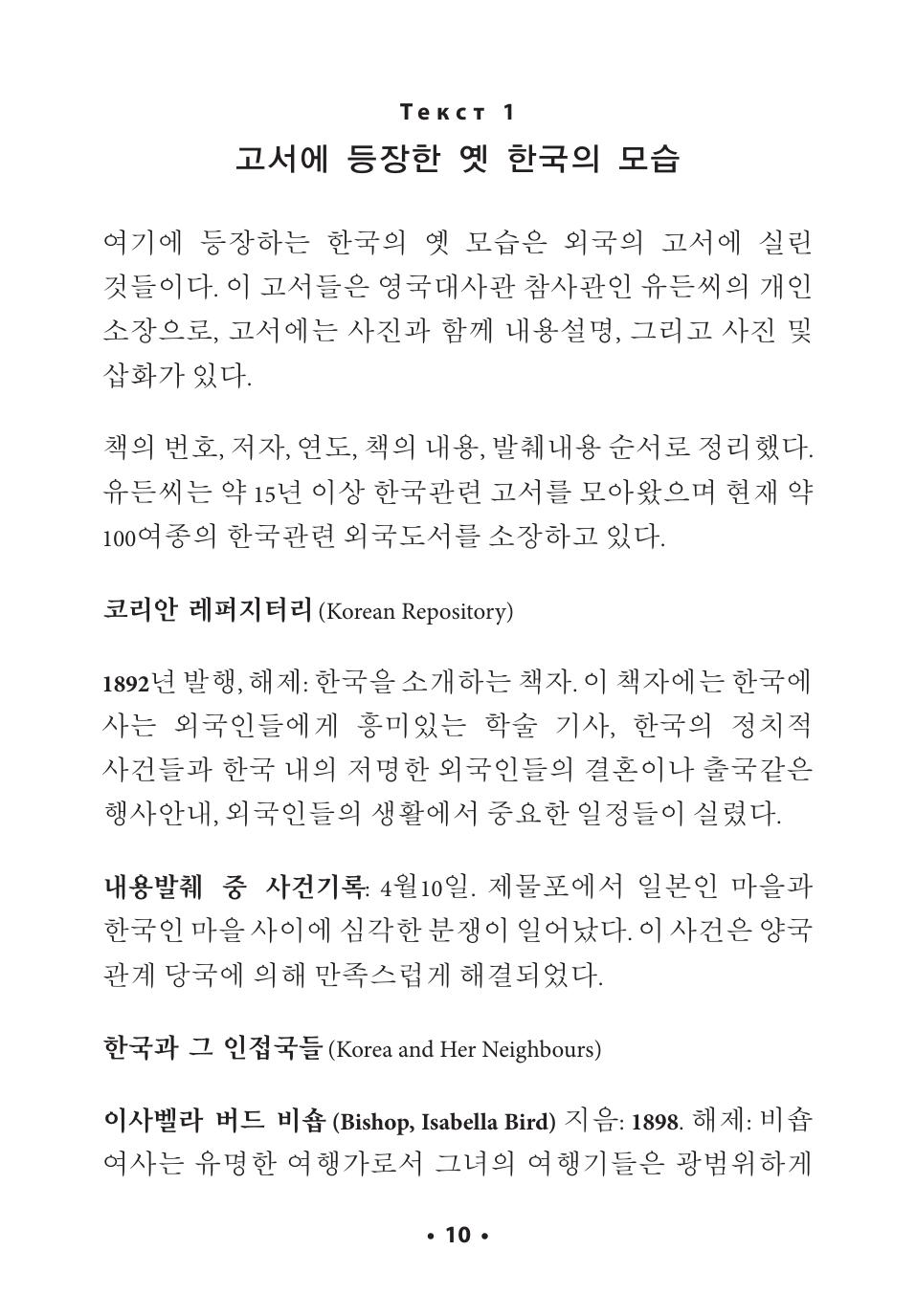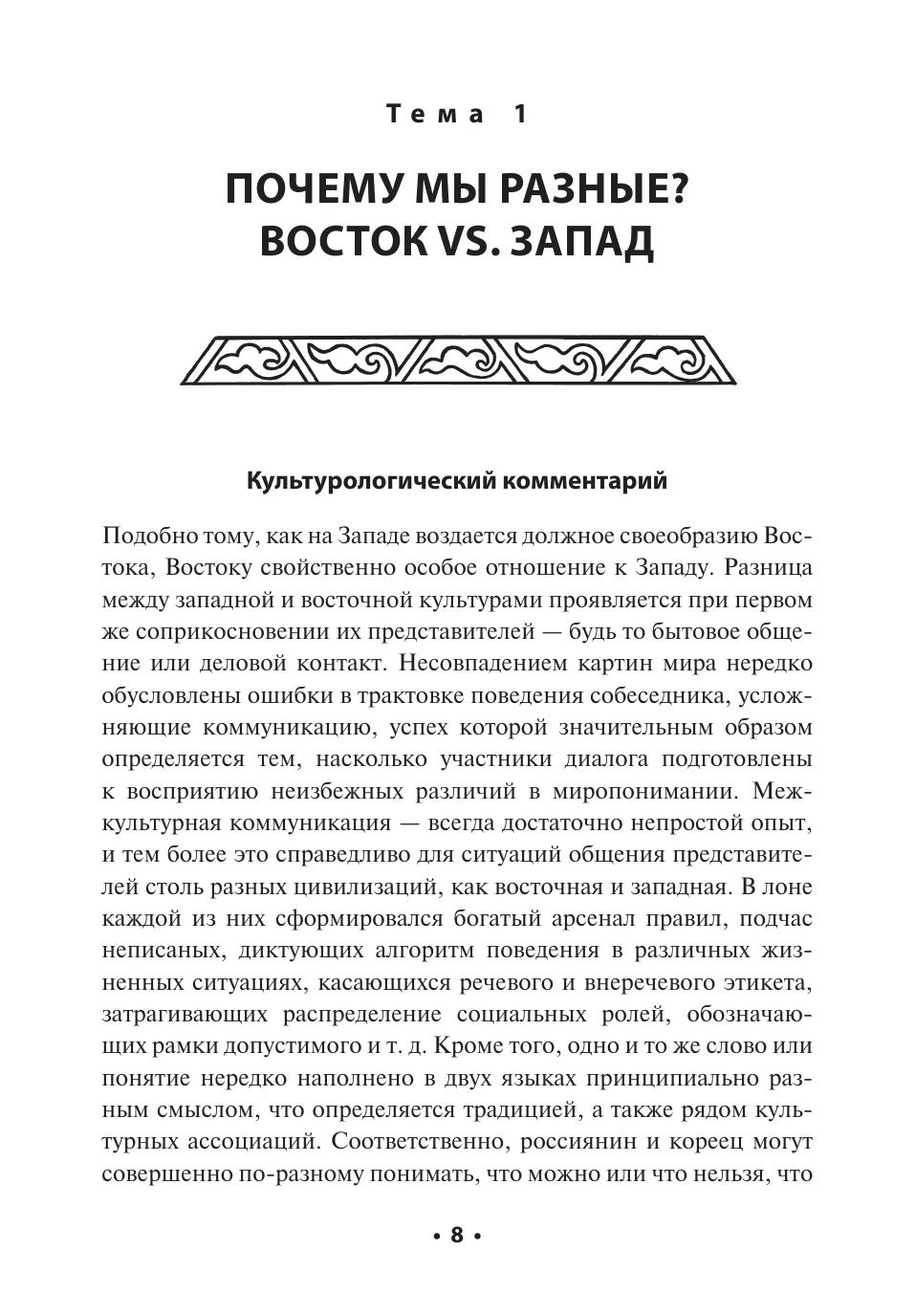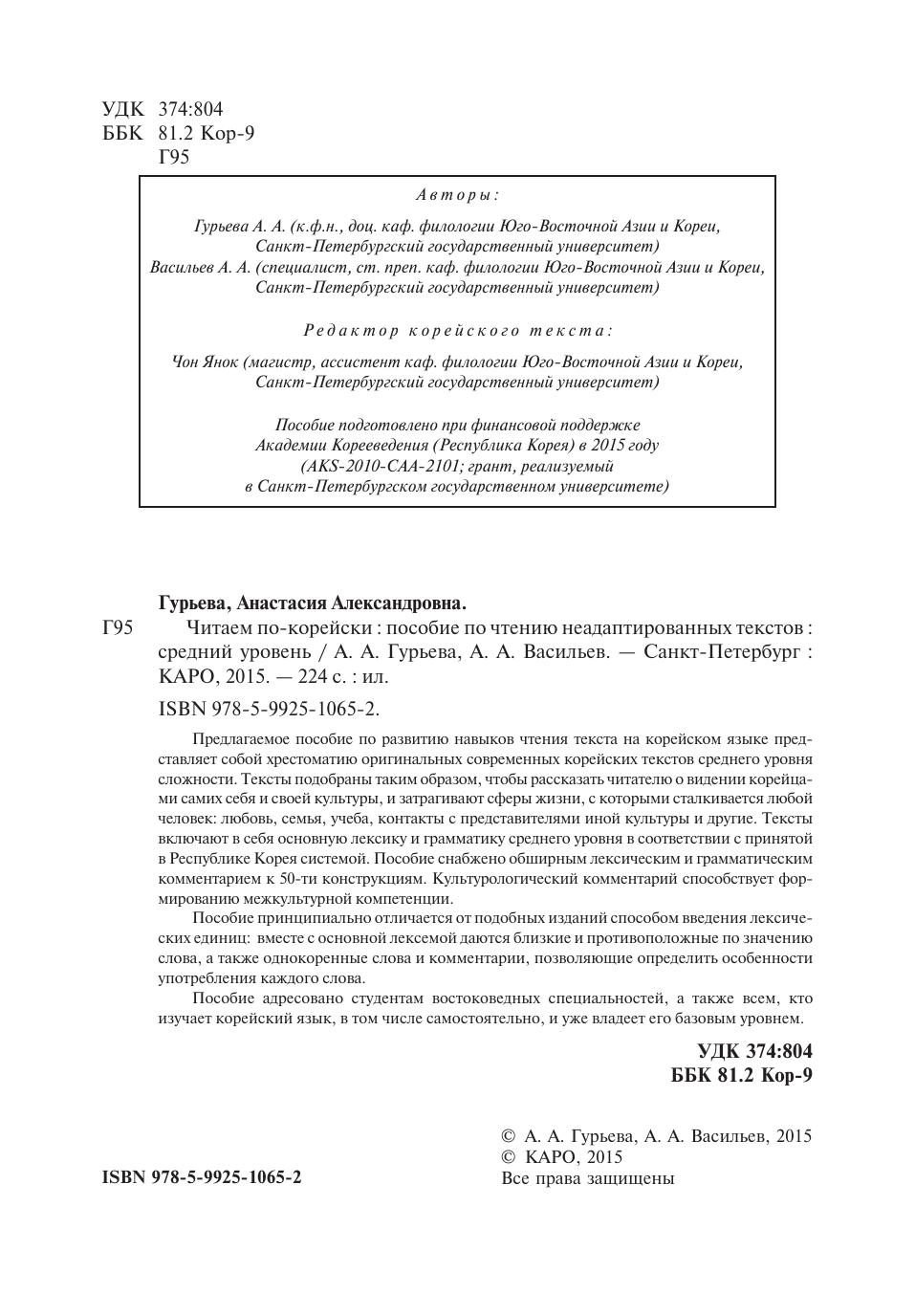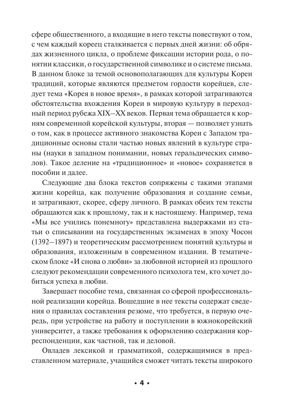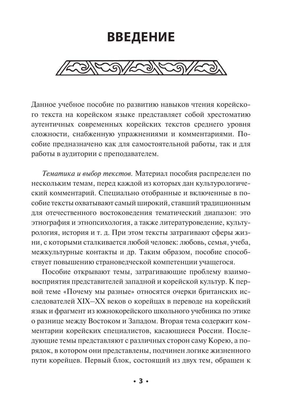 Предлагаемое пособие по развитию навыков чтения текста на корейском языке представляет собой хрестоматию оригинальных современных корейских текстов среднего уровня сложности. Тексты подобраны таким образом, чтобы рассказать читателю о видении корейцами самих себя и своей культуры, и затрагивают сферы жизни, с которыми сталкивается любой человек: любовь, семья, учеба, контакты с представителями иной культуры и другие. Тексты включают в себя основную лексику и грамматику среднего уровня в соответствии с принятой в Республике Корея системой. Пособие снабжено обширным лексическим и грамматическим комментарием к 50-ти конструкциям. Культурологический комментарий способствует формированию межкультурной компетенции.
