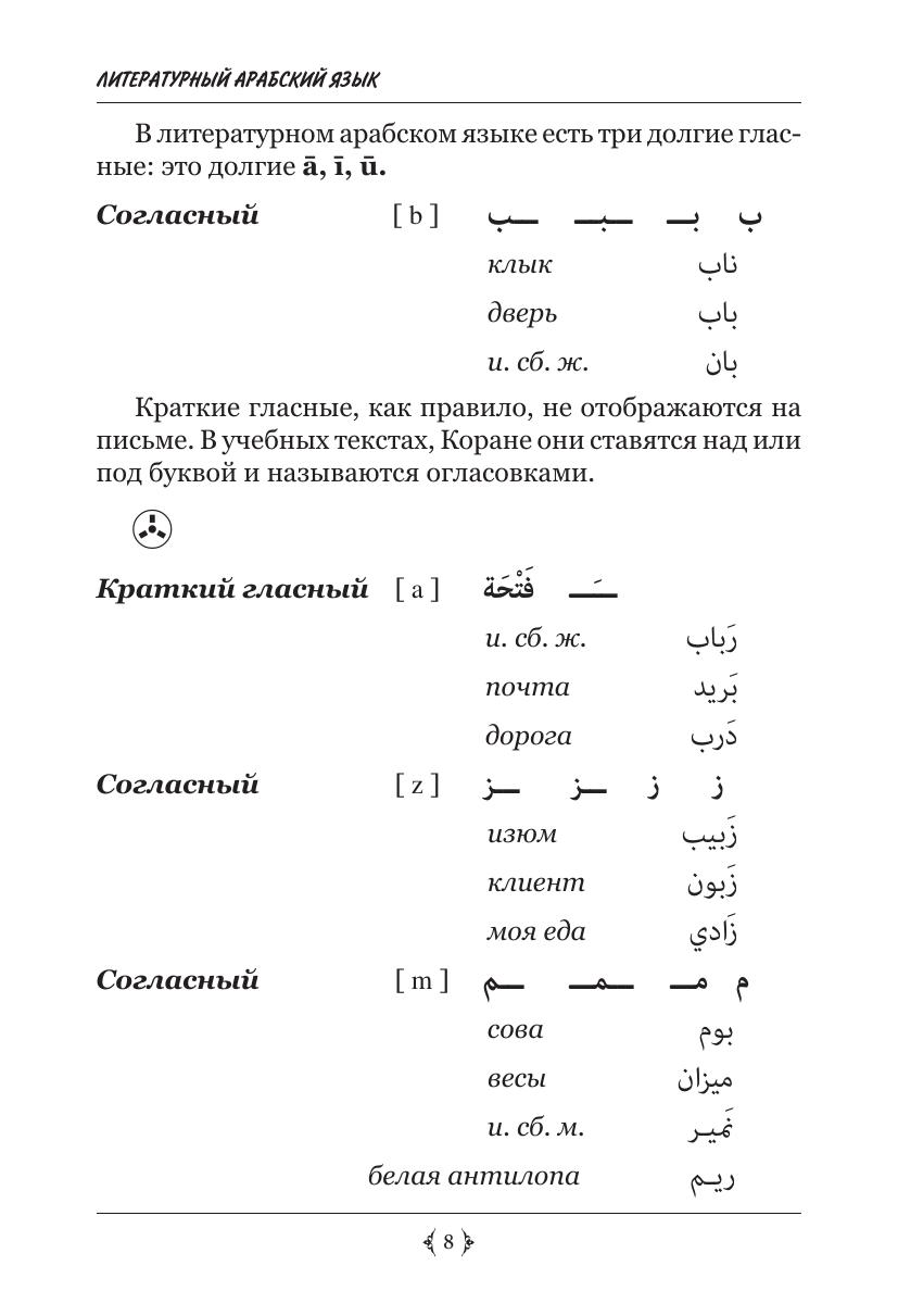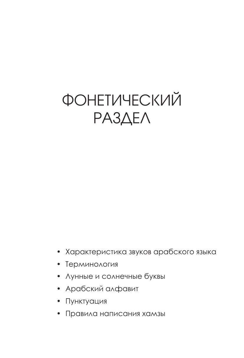 Учебное пособие построено на материале современного арабского языка и состоит из трёх частей: основы грамматики, учебные тексты и приложения. В первой части рассматриваются правила написания арабских букв, правильное произношение соответствующих звуков, их латинская транскрипция. Во второй части представлены 36 огласованных текстов, а также разговорные фразы и диалоги, написанные на современном литературном арабском языке. В приложениях