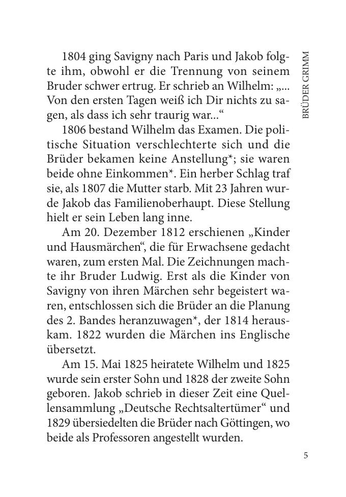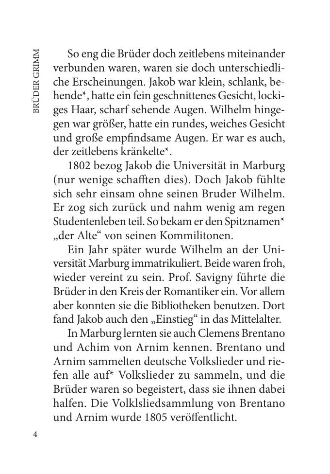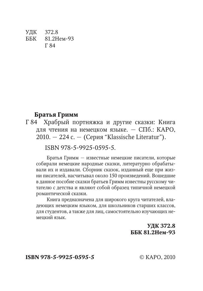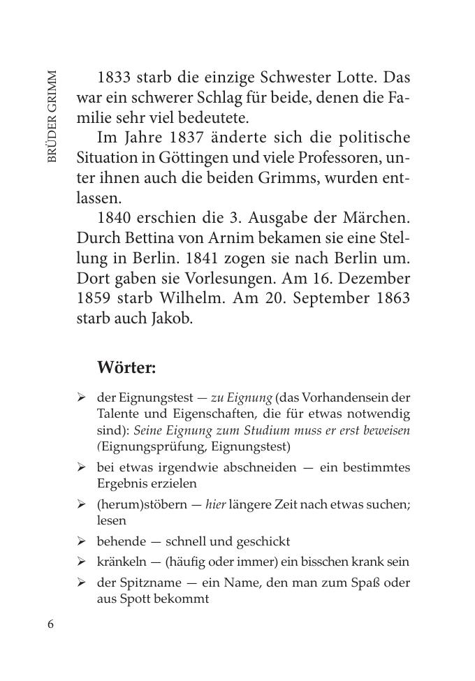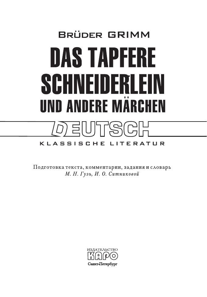 Братья Гримм — известные немецкие писатели, которые собирали немецкие народные сказки, литературно обрабатывали их и издавали. Сборник сказок, изданный еще при жизни писателей, насчитывал около 150 произведений. Вошедшие в данное пособие сказки братьев Гримм известны русскому читателю с детства и являют собой образец типичной немецкой романтической сказки. Книга предназначена для широкого круга читателей, владеющих немецким языком, для школьников старших классов, для студентов, а также для лиц, самостоятельно изучающих немецкий язык.