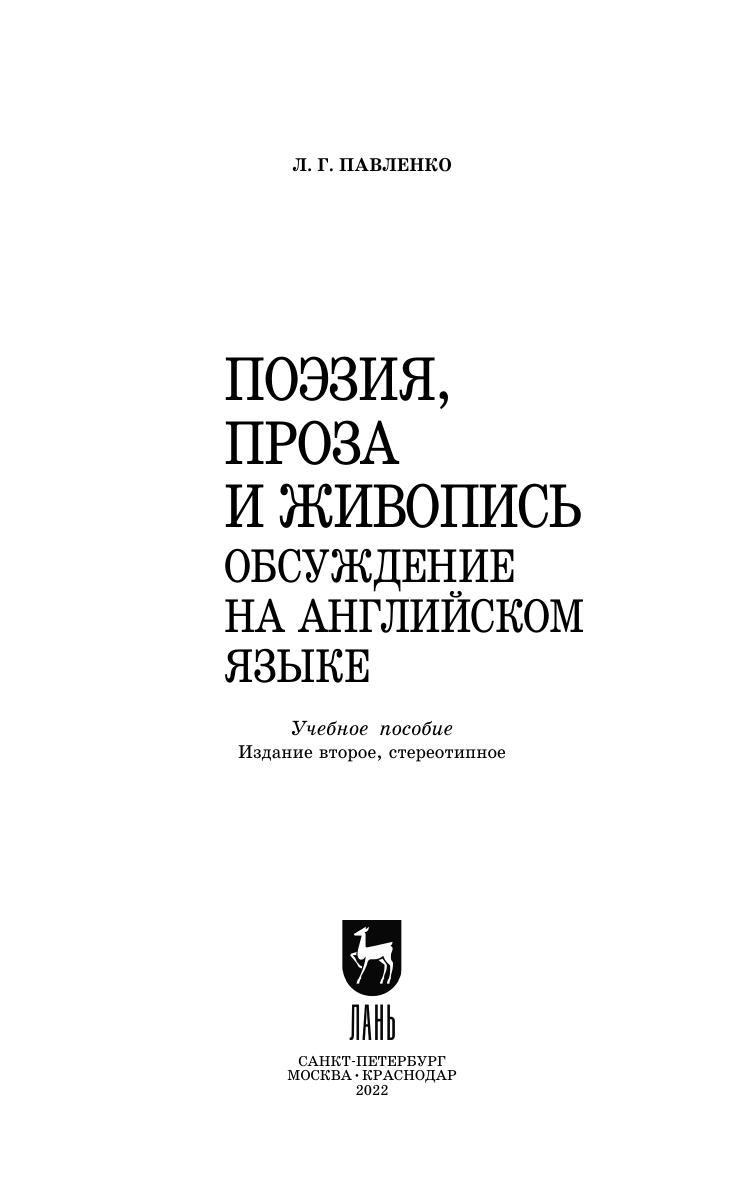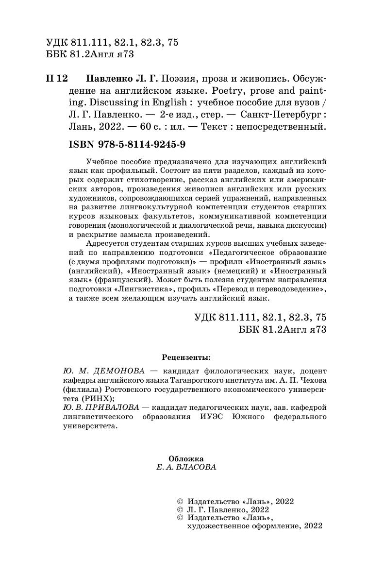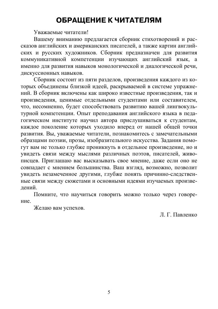 Учебное пособие предназначено для изучающих английский язык как профильный. Состоит из пяти разделов, каждый из которых содержит стихотворение, рассказ английских или американских авторов, произведения живописи английских или русских художников, сопровождающихся серией упражнений, направленных на развитие лингвокультурной компетенции студентов старших курсов языковых факультетов, коммуникативной компетенции говорения (монологической и диалогической речи, навыка дискуссии) и раскрытие замысла произведений.