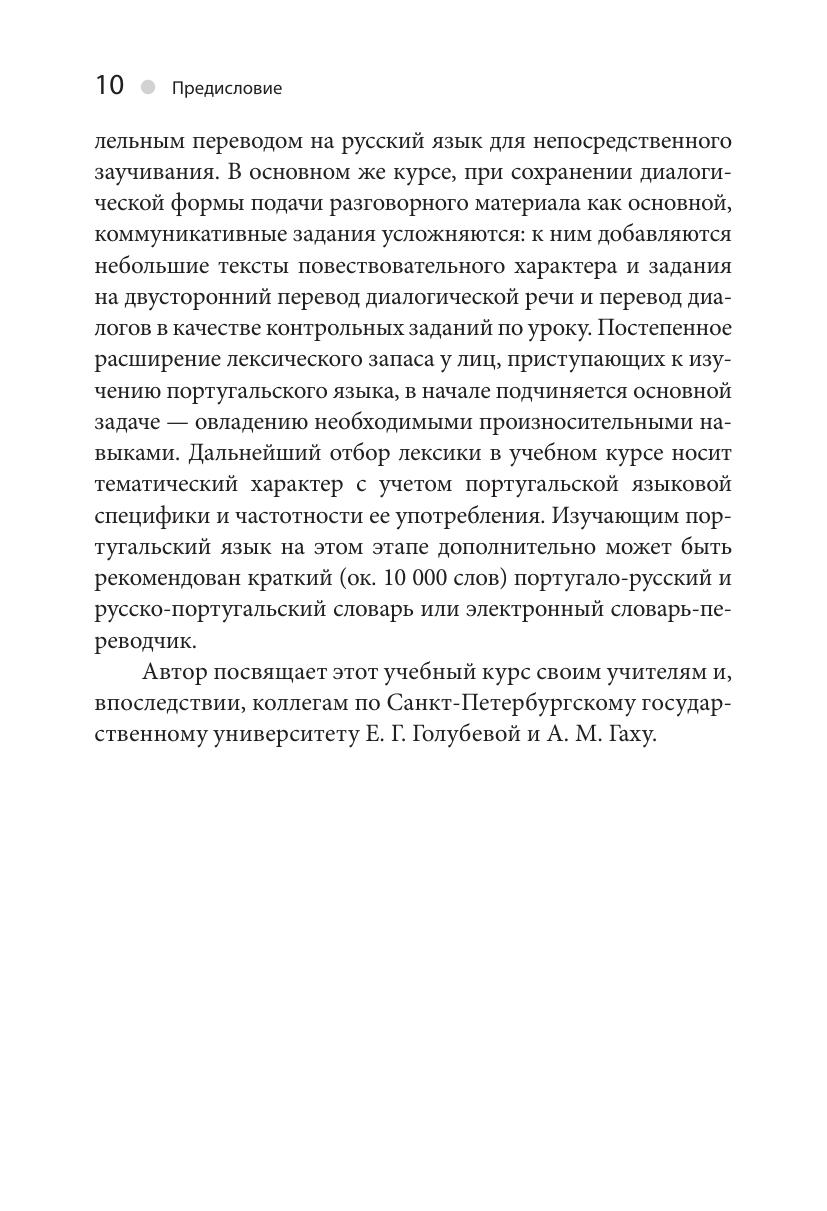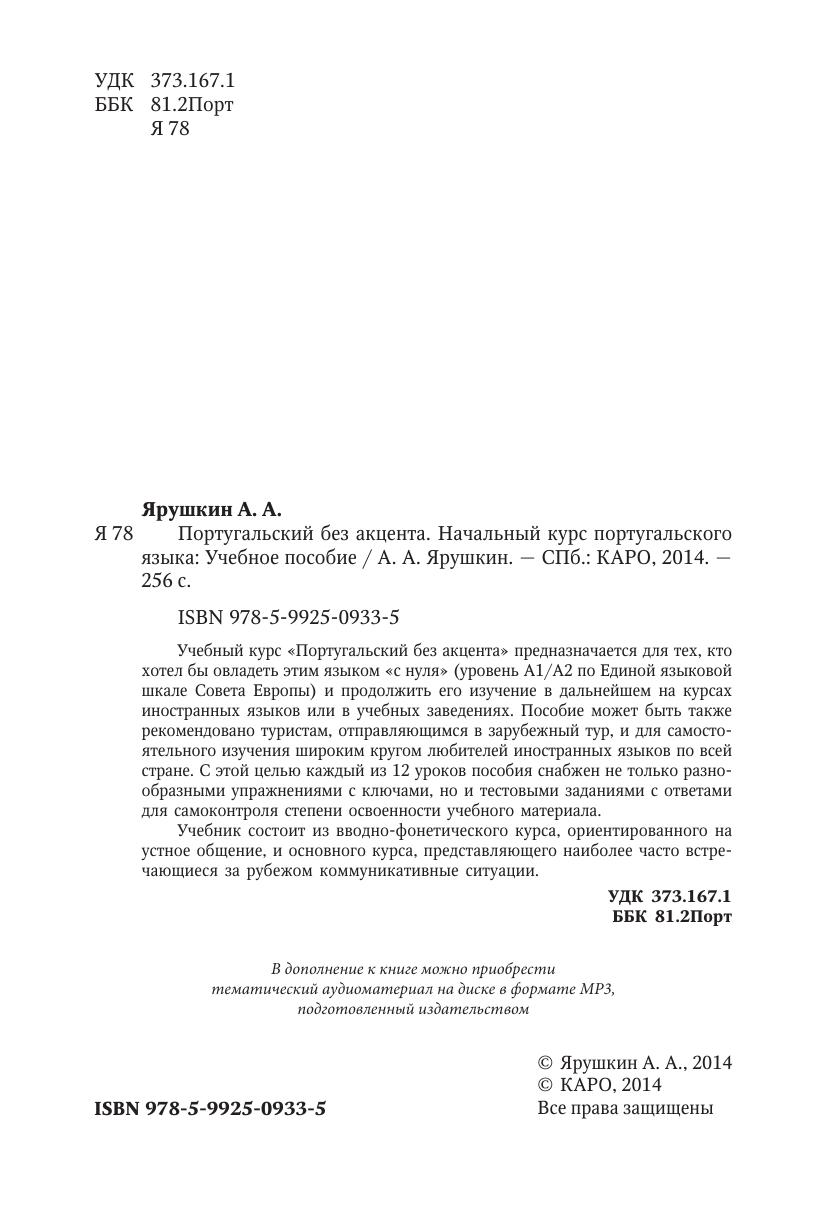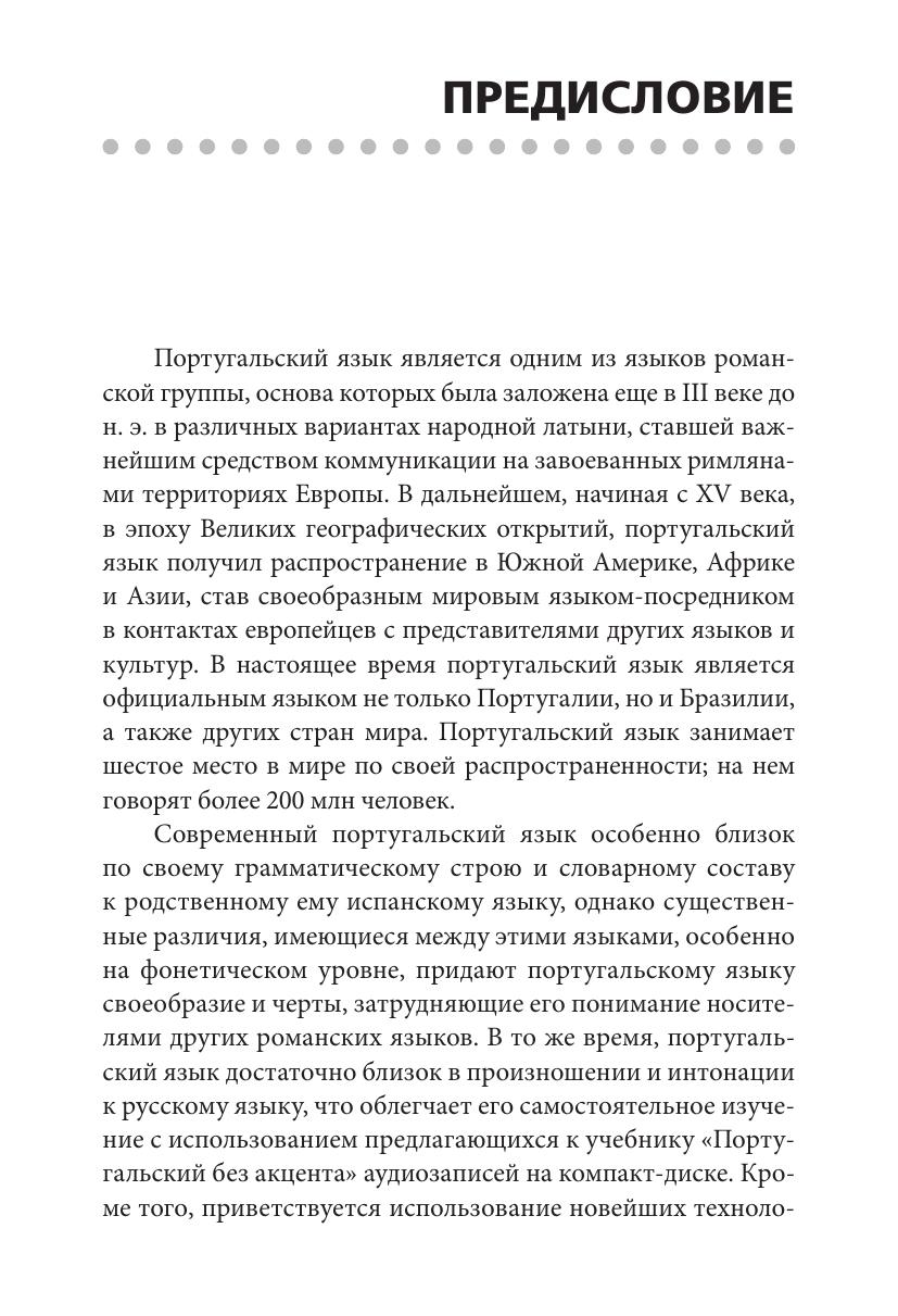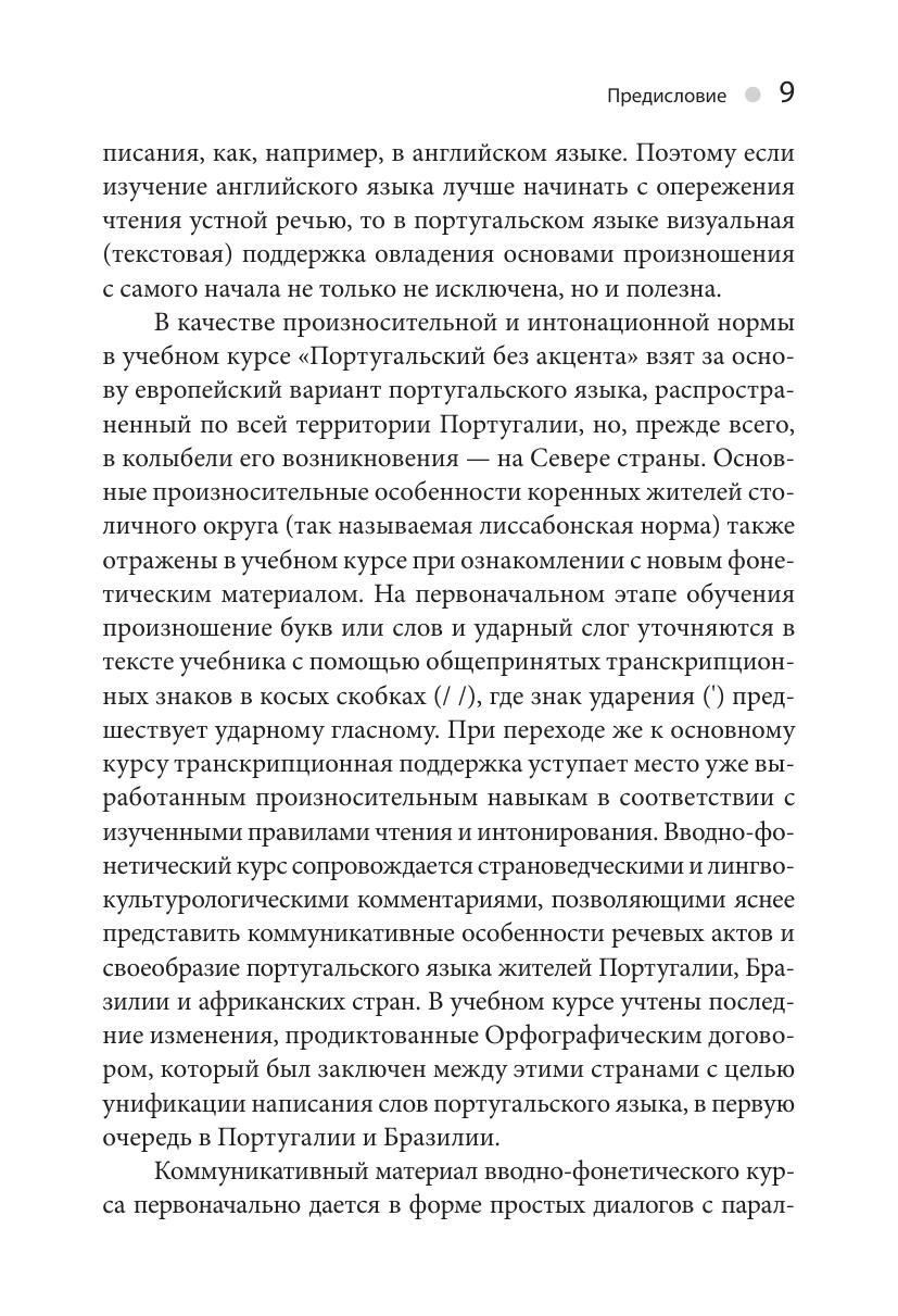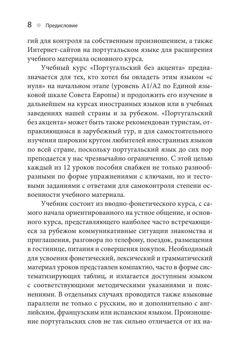 Учебный курс «Португальский без акцента» предназначается для тех, кто хотел бы овладеть этим языком «с нуля» (уровень А1/А2 по Единой языковой шкале Совета Европы) и продолжить его изучение в дальнейшем на курсах иностранных языков или в учебных заведениях. Пособие может быть также рекомендовано туристам, отправляющимся в зарубежный тур, и для самостоятельного изучения широким кругом любителей иностранных языков по всей стране. С этой целью каждый из 12 уроков пособия снабжен не только разнообразными упражнениями с ключами, но и тестовыми заданиями с ответами для самоконтроля степени освоенности учебного материала.