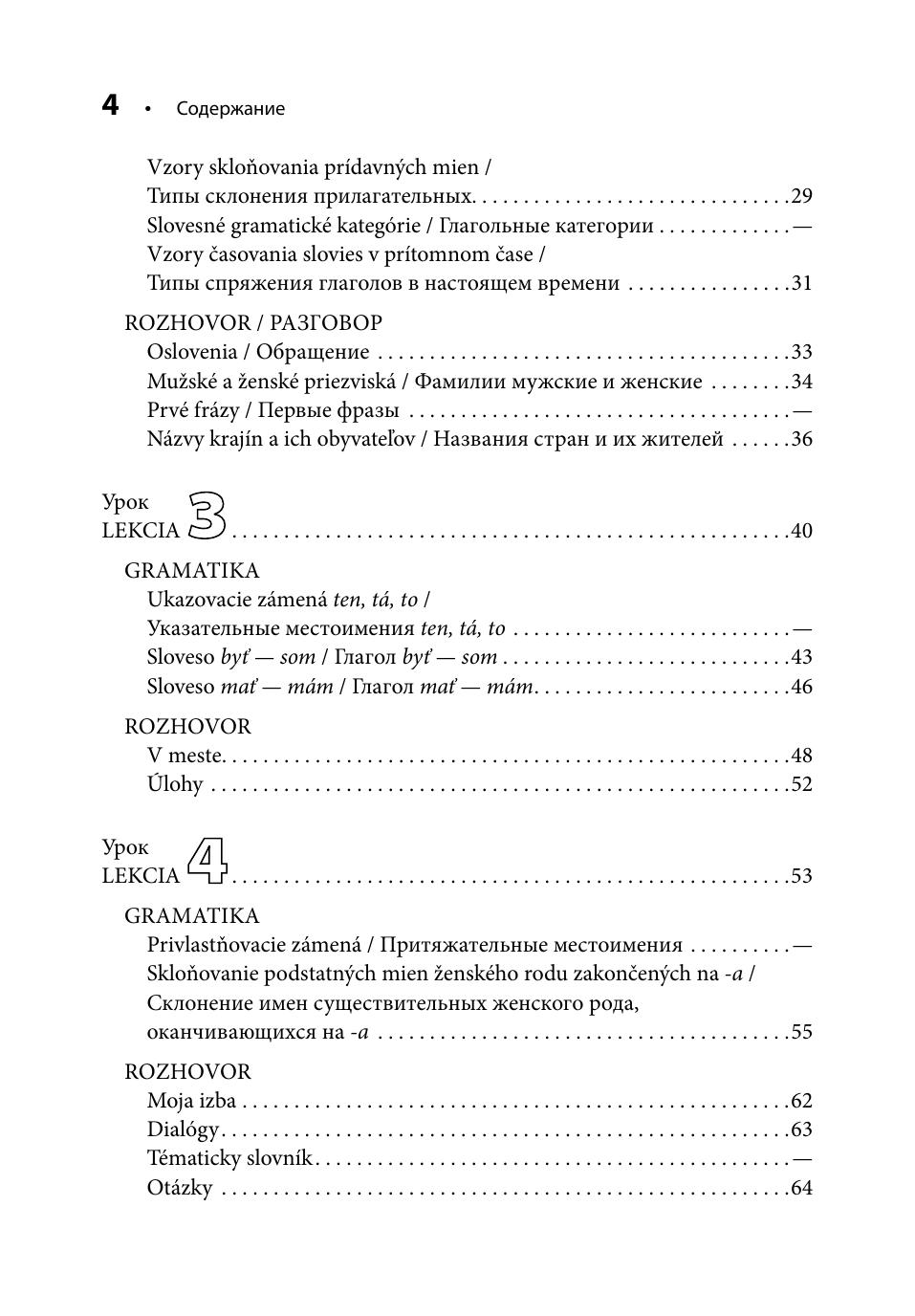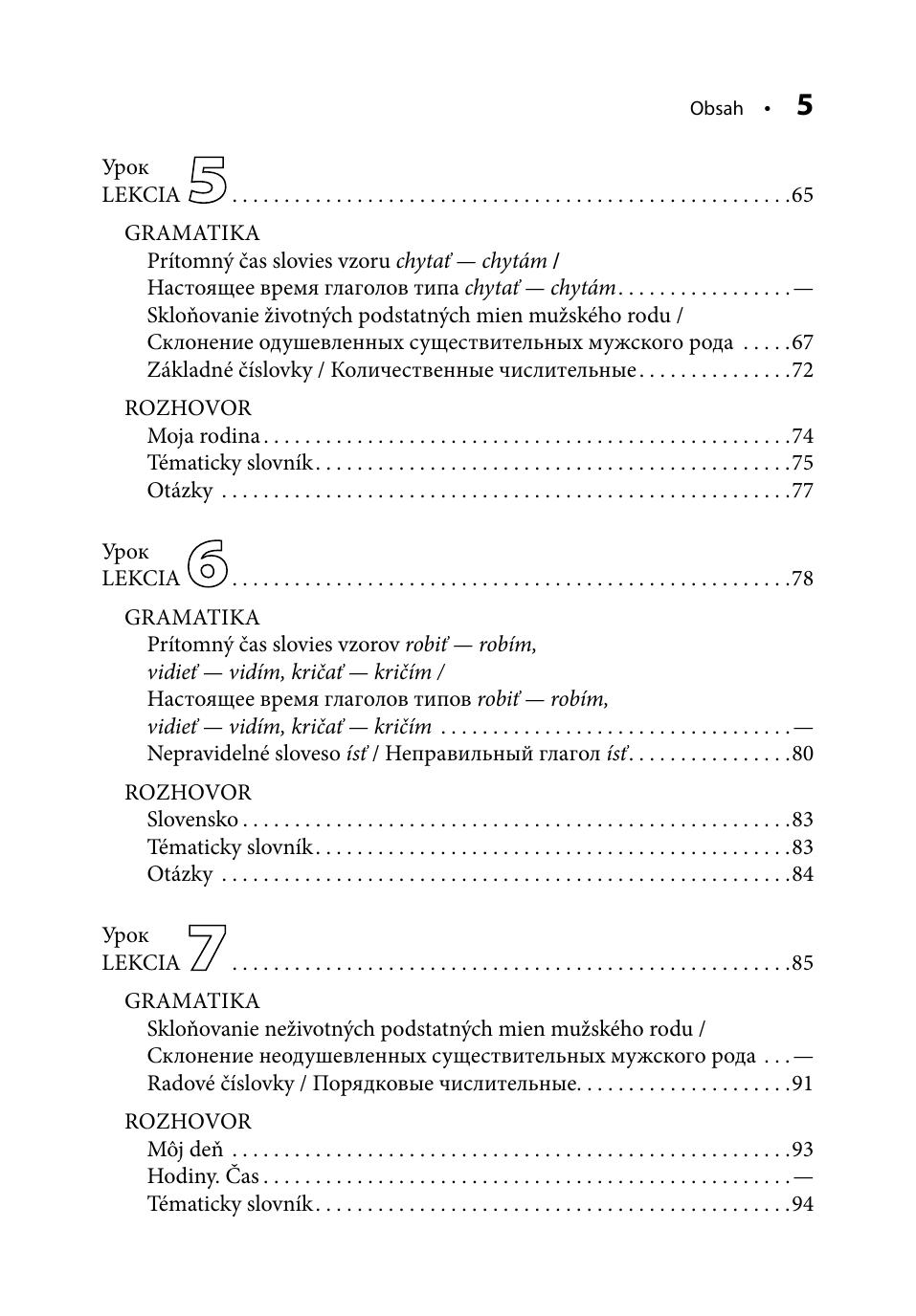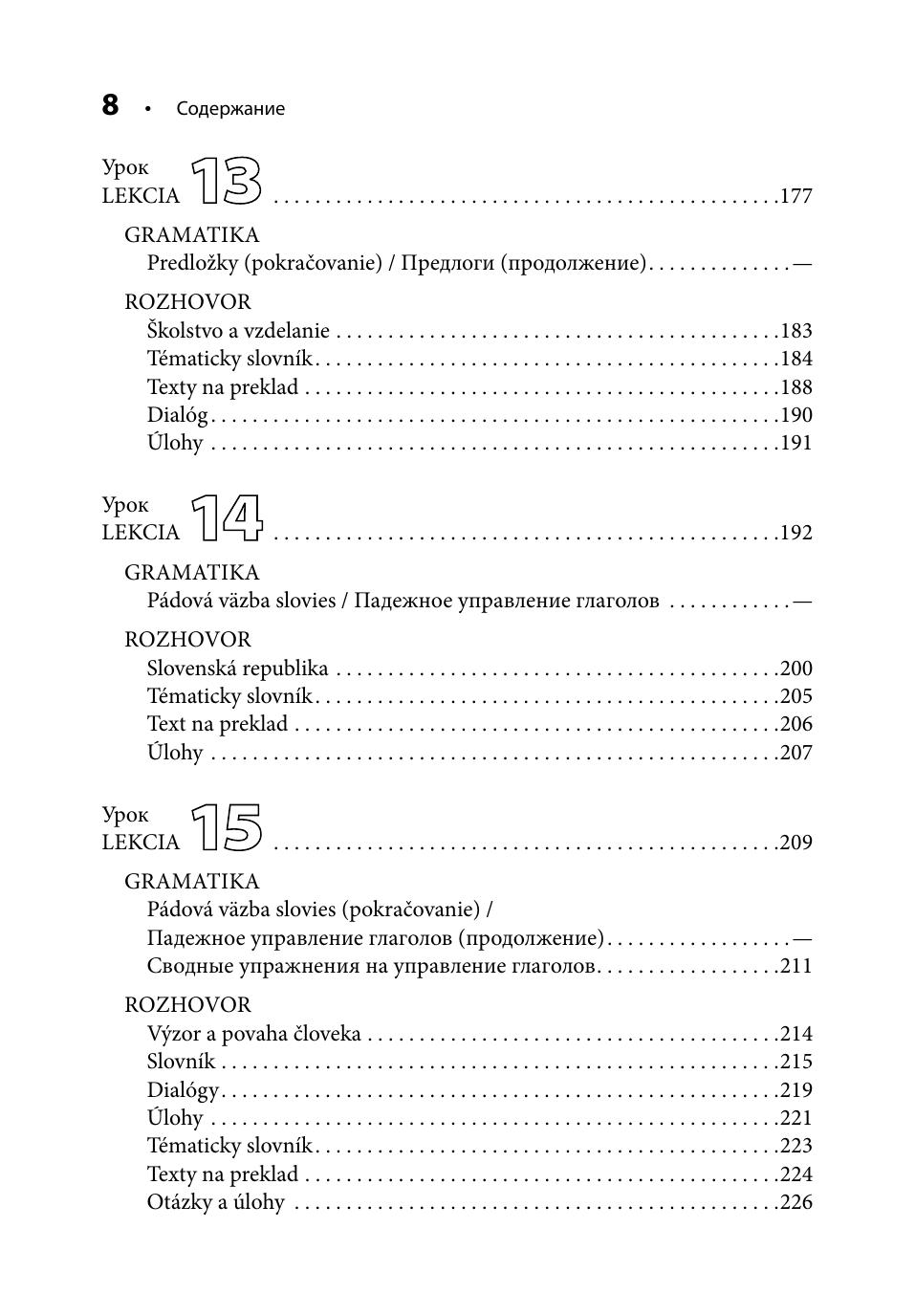 Круг разговорных тем, представленных в учебнике, достаточно широк — знакомство, ориентация в городе, путешествия, погода, еда, праздники, образование, профессия, внешность и характер, здоровье и болезни, интересы и любимые занятия. Кроме того, приводится страноведческий материал о Словакии.