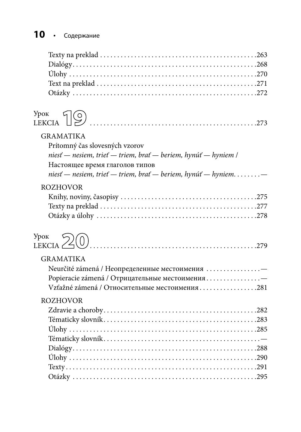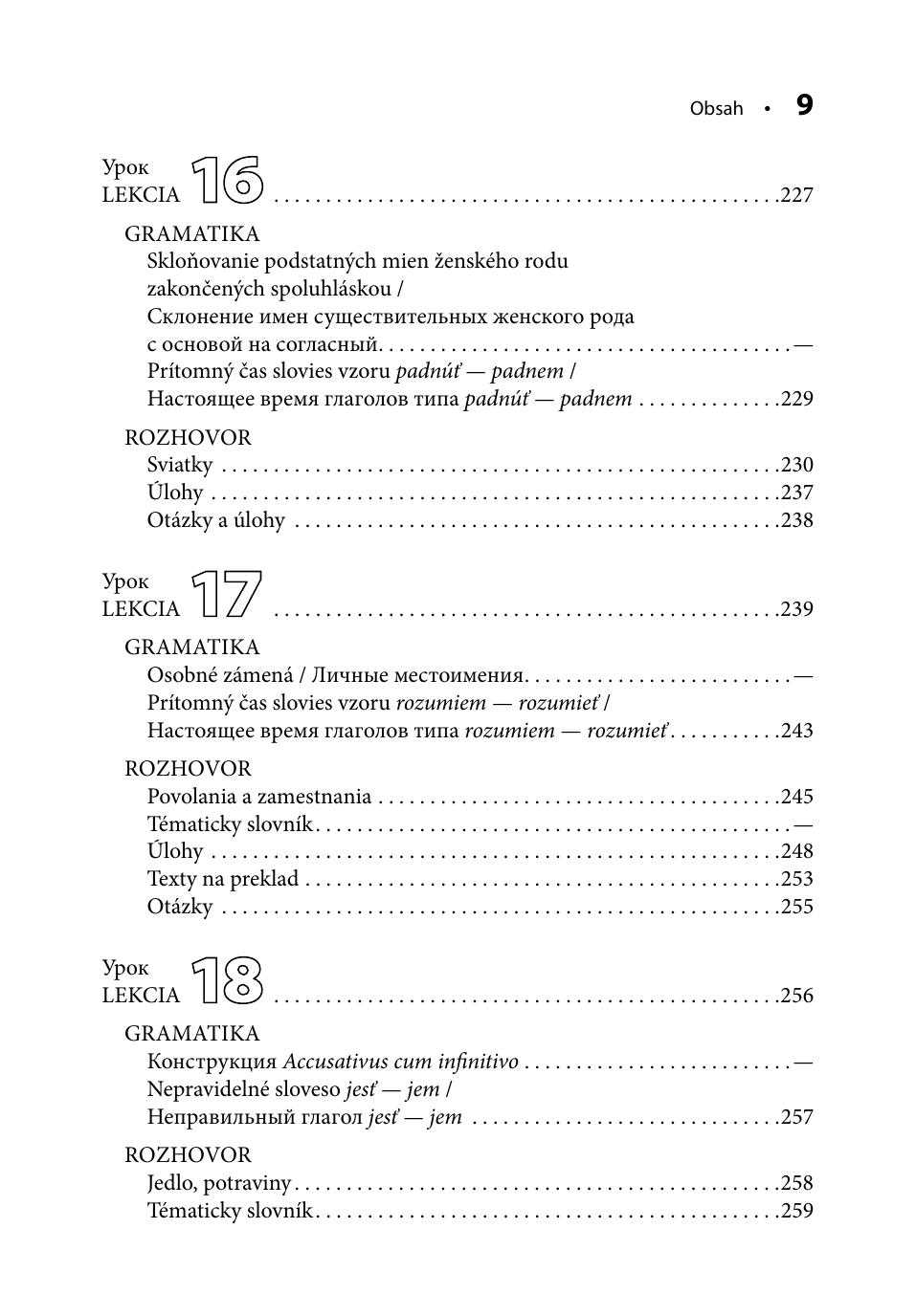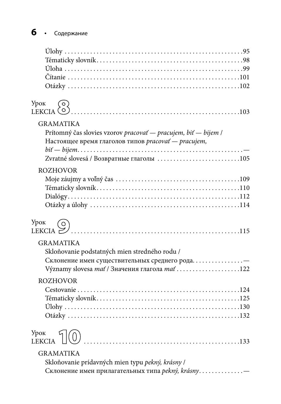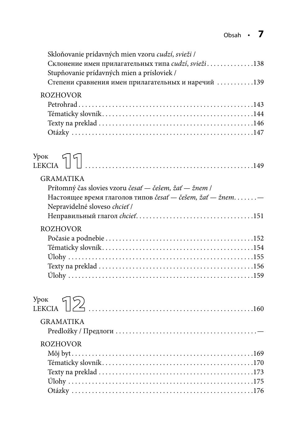 Круг разговорных тем, представленных в учебнике, достаточно широк — знакомство, ориентация в городе, путешествия, погода, еда, праздники, образование, профессия, внешность и характер, здоровье и болезни, интересы и любимые занятия. Кроме того, приводится страноведческий материал о Словакии.