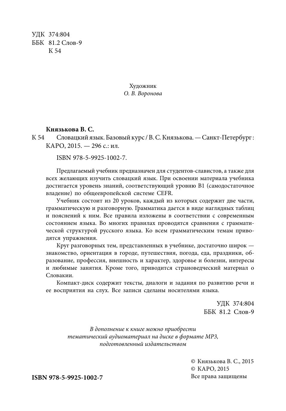 Предлагаемый учебник предназначен для студентов-славистов, а также для всех желающих изучить словацкий язык. При освоении материала учебника достигается уровень знаний, соответствующий уровню В1 (самодостаточное