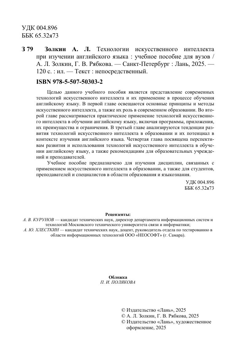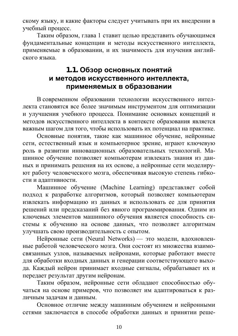 Целью данного учебного пособия является представление современных технологий искусственного интеллекта и их применение в процессе обучения английскому языку. В первой главе освещаются основные принципы и методы искусственного интеллекта, а также их роль в современном образовании. Во второй главе рассматривается практическое применение технологий искусственного интеллекта в обучении английскому языку, включая программы, приложения, их преимущества и ограничения. В третьей главе анализируются тенденции развития технологий искусственного интеллекта в образовании и их потенциал в контексте изучения английского языка. Четвертая глава посвящена перспективам развития и использования технологий искусственного интеллекта в обучении английскому языку, а также рекомендациям для образовательных учреждений и преподавателей. Учебное пособие предназначено для изучения дисциплин, связанных с применением искусственного интеллекта в образовании, а также для студентов, преподавателей и специалистов в области образования и языкознания.