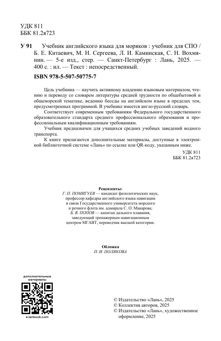 Цель учебника — научить активному владению языковым материалом, чтению и переводу со словарем литературы средней трудности по общебытовой и общеморской тематике, ведению беседы на английском языке в пределах тем, предусмотренных программой. В учебнике имеется англо-русский словарь. Соответствует современным требованиям Федерального государственного образовательного стандарта среднего профессионального образования и профессиональным квалификационным требованиям. Учебник предназначен для учащихся средних учебных заведений водного транспорта. К книге прилагаются дополнительные материалы, доступные в электронной библиотечной системе «Лань» по ссылке или QR-коду, указанным ниже.