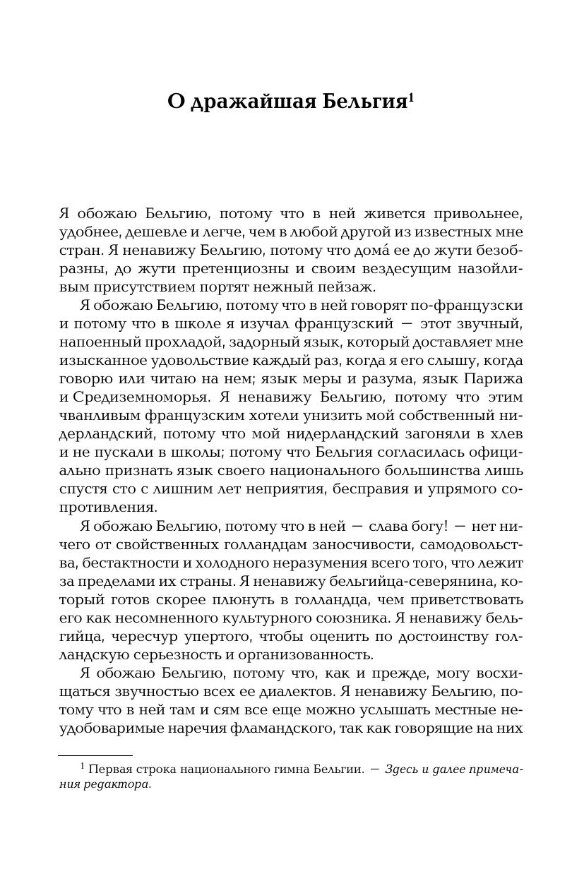 Книга бельгийского прозаика, поэта и журналиста Герта ван Истендала рассказывает о прошлом и настоящем Королевства Бельгия. В ней представлен краткий, но чрезвычайно емкий очерк истории этой страны с особым упором на ее острые проблемы: фламандский и валлонский национализм, Сопротивление и коллаборационизм в годы Второй мировой войны, межнациональные и межъязыковые отношения. Книга написана ярким языком публициста. Специальные главы посвящены столице Бельгии Брюсселю как символу сосуществования культур, структуре государственной власти, роли церкви в жизни общества, политическим партиям. Читатель с удивлением обнаружит, что некоторые проблемы и национальные черты характера, которые у нас принято считать сугубо российскими, в равной степени присущи бельгийцам. Для историков, языковедов, культурологов, а также для всех тех, кто, собираясь в туристическую поездку по Бельгии, хочет составить себе представление об этой стране.