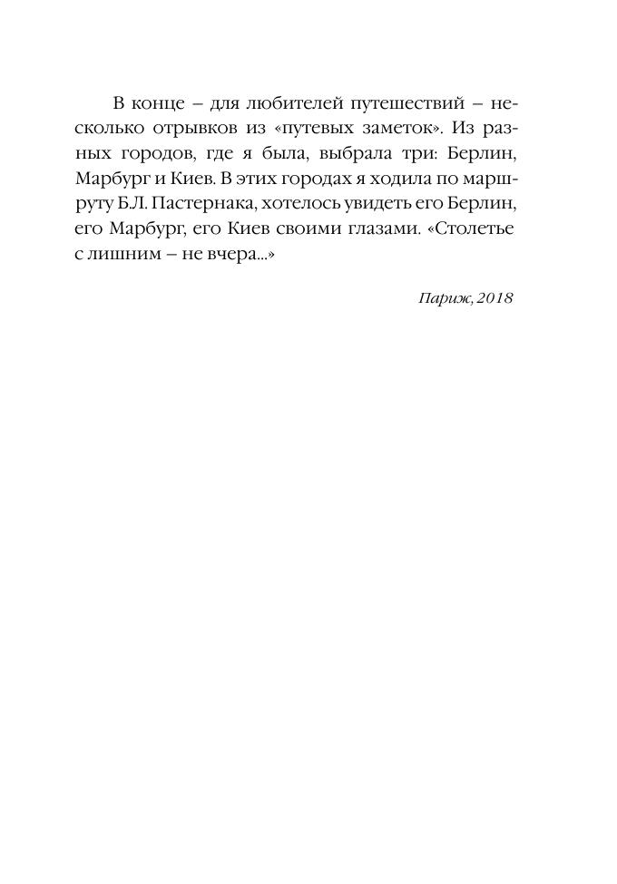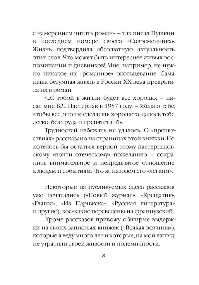 Это не портретная галерея, а «сцены частной жизни», складывающиеся в характерную и живую картину ушедшей эпохи. Своего рода «роман воспитания». В книгу входят и дневниковые записи автора, размышления по поводу прочитанных книг («Всякая всячина»), а также путевые заметки-впечатления от путешествий по местам, связанным с Б.Л. Пастернаком – Берлин, Марбург, Киев