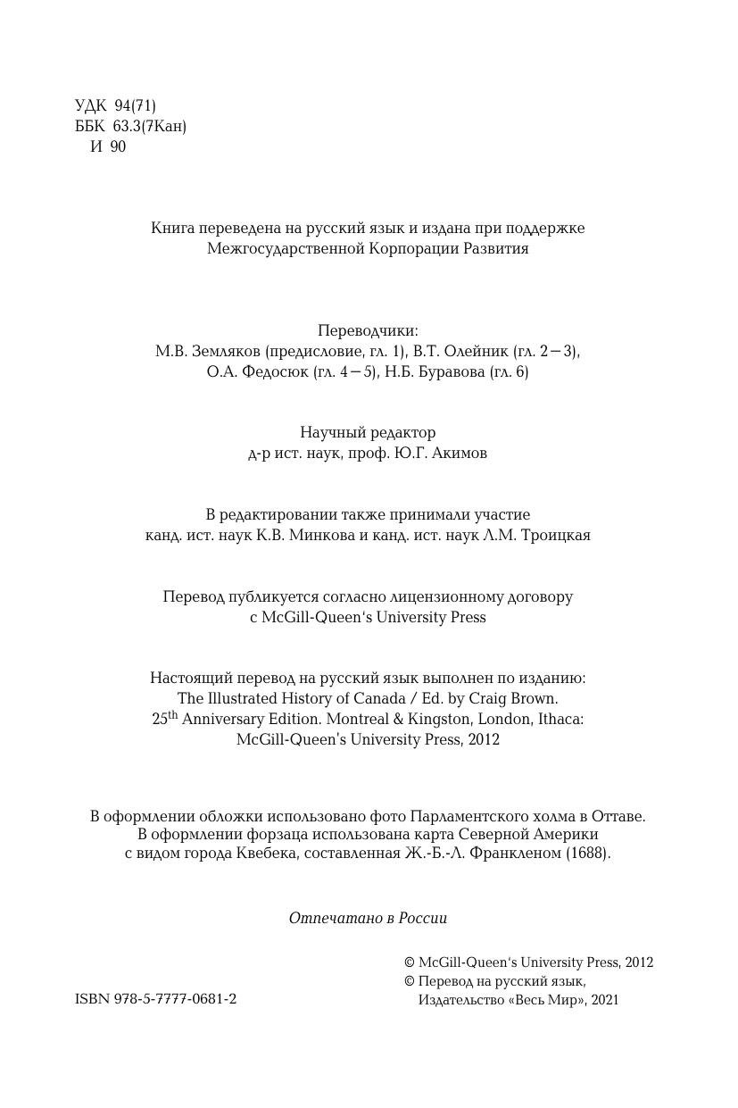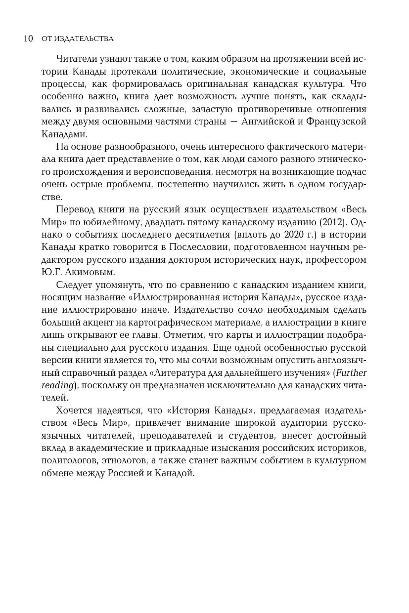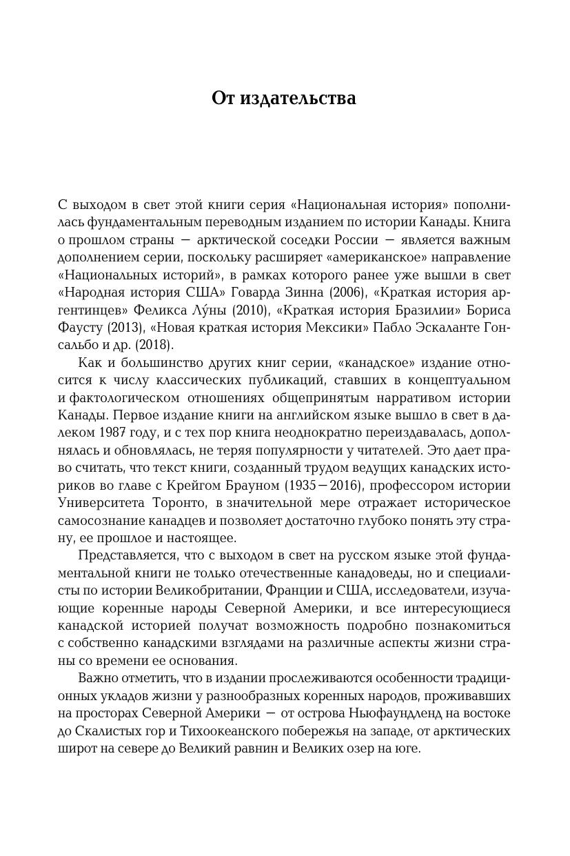 В книге, написанной коллективом ведущих канадских историков, рассматривается история страны с древнейших времен до начала XXI в. Показана специфика развития аборигенных сообществ до начала контактной эпохи, вскрыты особенности колонизации территории страны французами и англичанами, прослежены основные этапы становления канадской государственности, освоения и заселения территории страны, формирования современного полиэтничного состава населения, подчеркнут мирный, эволюционный характер развития канадского общества. Книга содержит обширный и тщательно подобранный фактический материал, сочетающийся с глубоким и взвешенным анализом описываемых событий. До настоящего времени книга выдержала 25 изданий в Канаде и является одной из наиболее известных общих работ по истории этой страны. Для специалистов и студентов различных социально-экономических и гуманитарных специальностей, а также широкого круга читателей, интересующихся канадской проблематикой, историей Франции, Англии, США и международных отношений.
