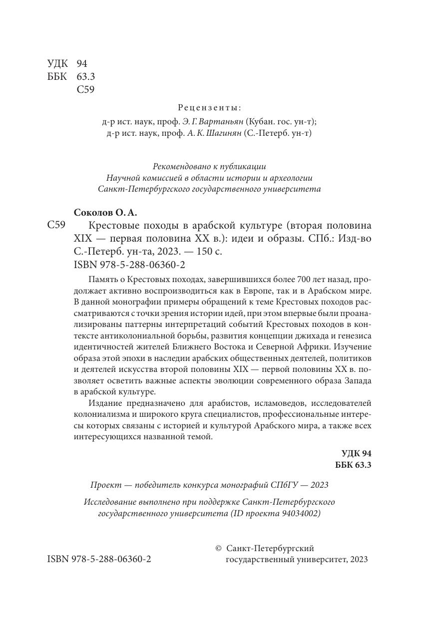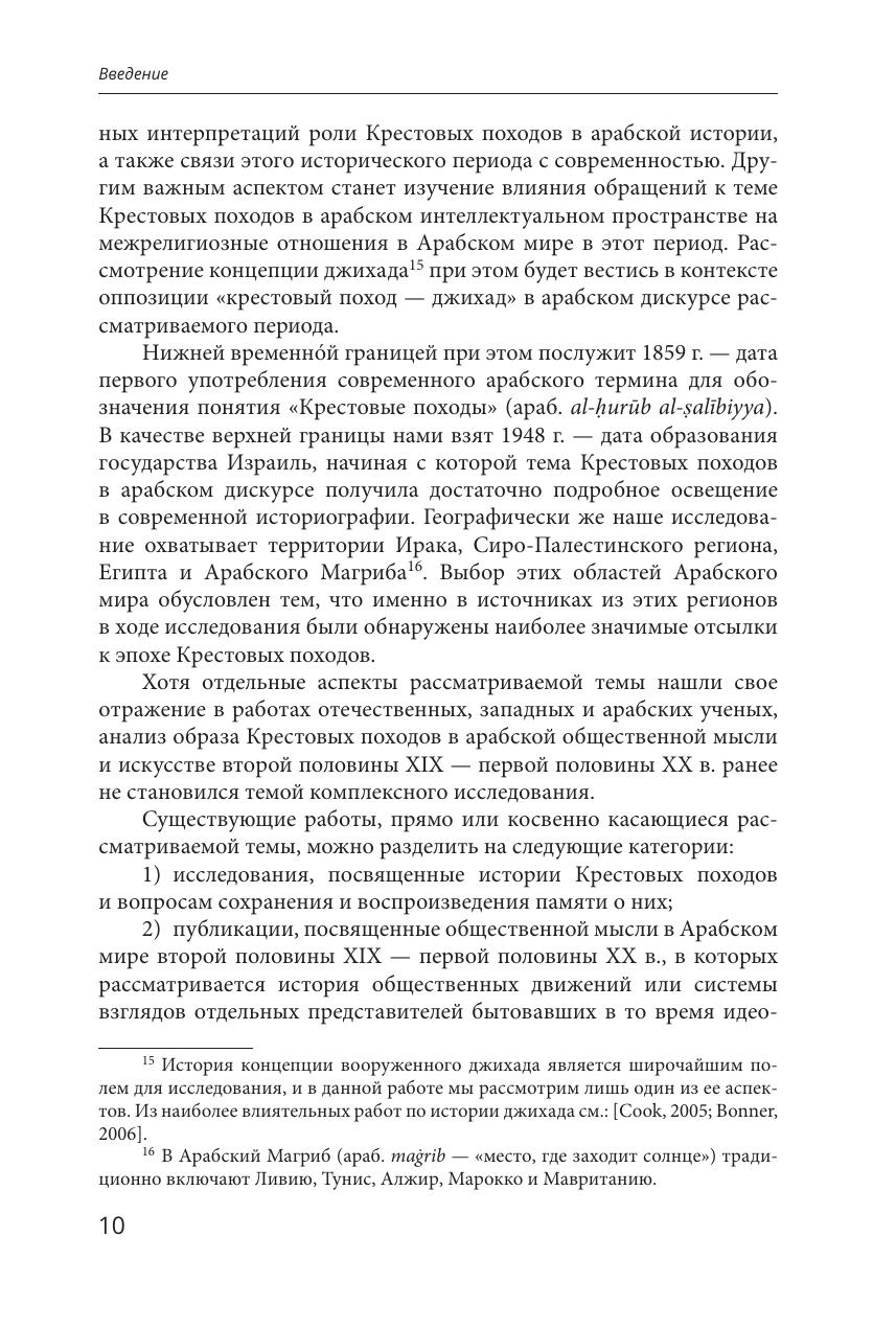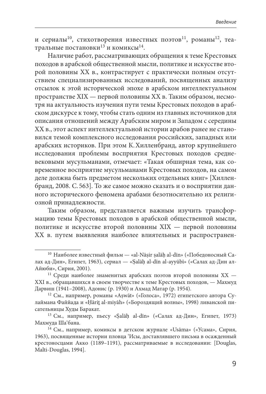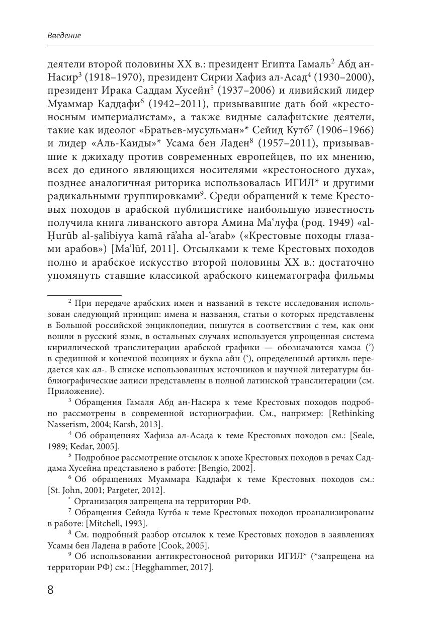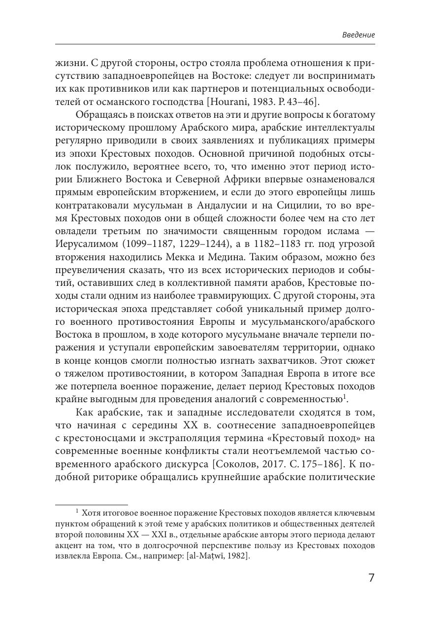 Память о крестовых походах, завершившихся более 700 лет назад, продолжает активно воспроизводиться как в Европе, так и в Арабском мире. В данной монографии примеры обращений к теме Крестовых походов рассматриваются с точки зрения истории идей, при этом впервые были проанализированы паттерны интерпретаций событий Крестовых походов в контексте антиколониальной борьбы, развития концепции джихада и генезиса идентичностей жителей Ближнего Востока и Северной Африки. Изучение образа этой эпохи в наследии арабских общественных деятелей, политиков и деятелей искусства второй половины XIX - первой половины ХХ в. позволяет осветить важные аспекты эволюции современного образа Запада в арабской культуре. Издание предназначено для арабистов, исламоведов, исследователей колониализма и широкого круга специалистов, профессиональные интересы которых связаны с историей и культурой Арабского мира, а также всех интересующихся названной темой.