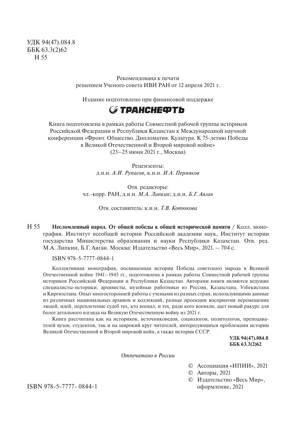 Коллективная монография, посвященная истории Победы советского народа в Великой Отечественной войне 1941–1945 гг., подготовлена в рамках работы Совместной рабочей группы историков Российской Федерации и Республики Казахстан. Авторами книги являются ведущие специалисты-историки, архивисты, музейные работники из России, Казахстана, Узбекистана и Киргизстана. Опыт многосторонней работы с учеными из разных стран, использующими данные из различных национальных архивов и коллекций, разные проекции восприятия перемещения людей, идей, переплетение судеб тех, кто воевал, и тех, ради кого воевали, дает новый ракурс для более детального взгляда на Великую Отечественную войну из 2021 г. Книга рассчитана как на историков, источниковедов, социологов, политологов, преподавателей вузов, студентов, так и на широкий круг читателей, интересующихся проблемами истории Великой Отечественной и Второй мировой войн, а также истории СССР.