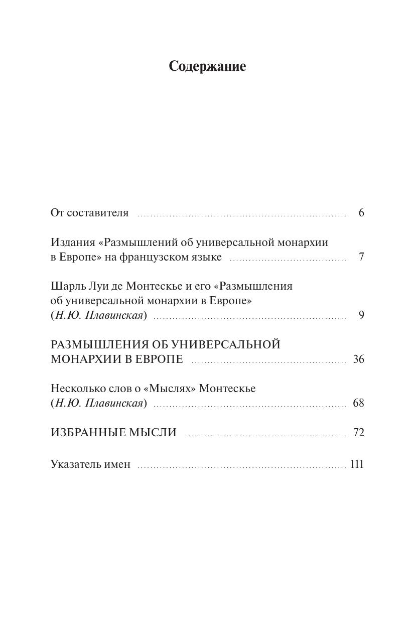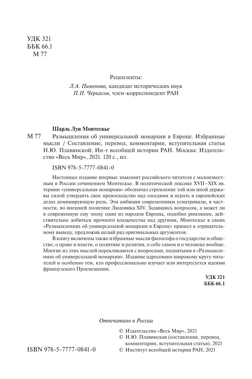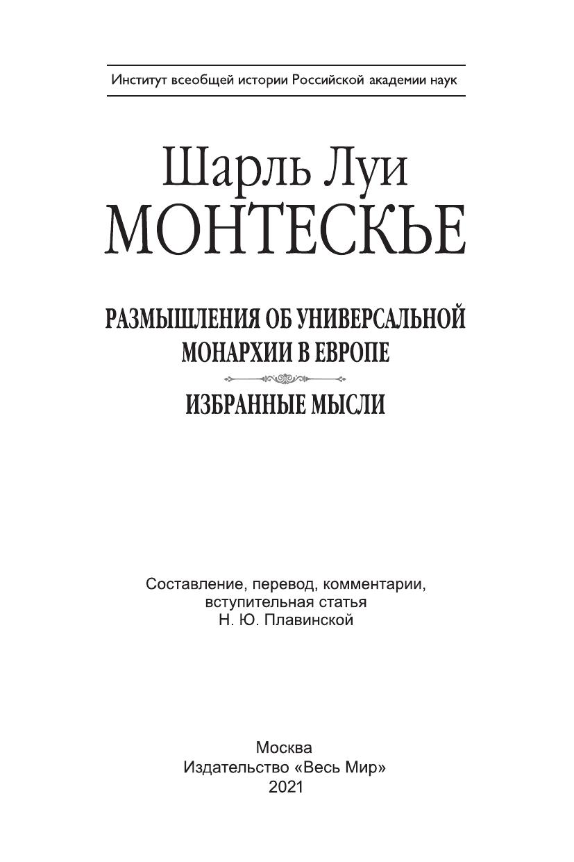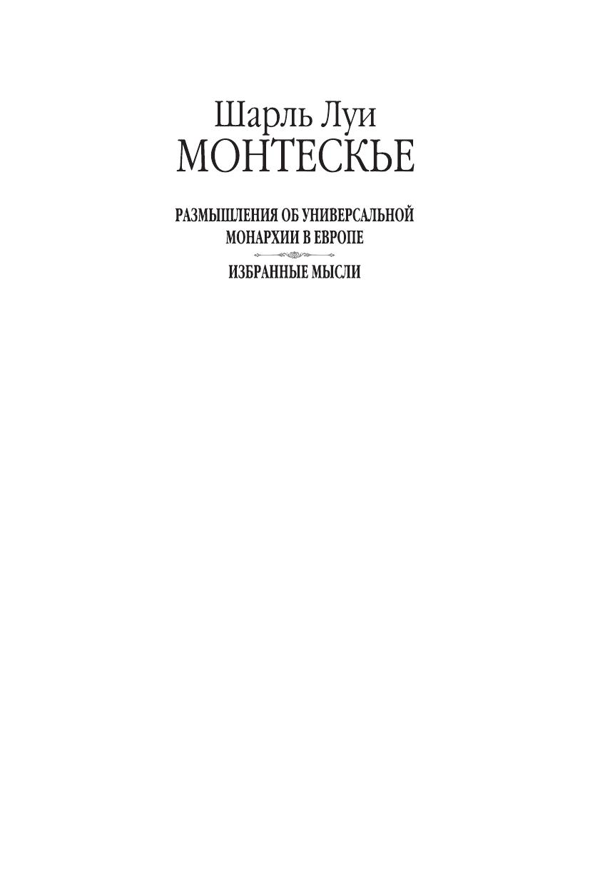 Настоящее издание впервые знакомит российского читателя с малоизвестным в России сочинением Монтескье. В политической лексике XVII–XIX вв. термин «универсальная монархия» обозначал стремление той или иной держа- вы силой утвердить свое превосходство над соседями и играть в европейских делах доминирующую роль. Эти амбиции современники усматривали, в частности, во внешней политике Людовика XIV. Задавшись вопросом, а может ли в современную ему эпоху один из народов Европы, подобно римлянам, действительно добиться прочного владычества над другими, Монтескье в своих «Размышлениях об универсальной монархии в Европе» пришел к отрицательному выводу, предложив целый ряд оригинальных аргументов. В книгу включены также избранные мысли философа о государстве и обществе, о праве и власти, о политике и религии, о себе самом и о человеке вообще. Многие из этих мыслей перекликаются с вопросами, поднятыми в «Размышлениях об универсальной монархии». Издание адресовано широкому кругу читателей и особенно тем, кто профессионально изучает или интересуется идеями французского Просвещения.