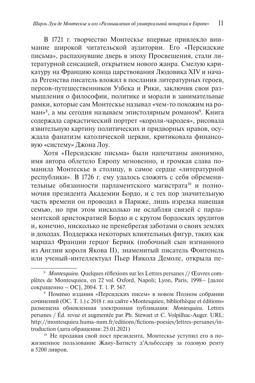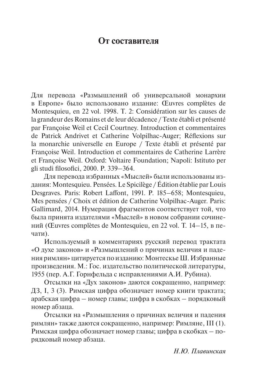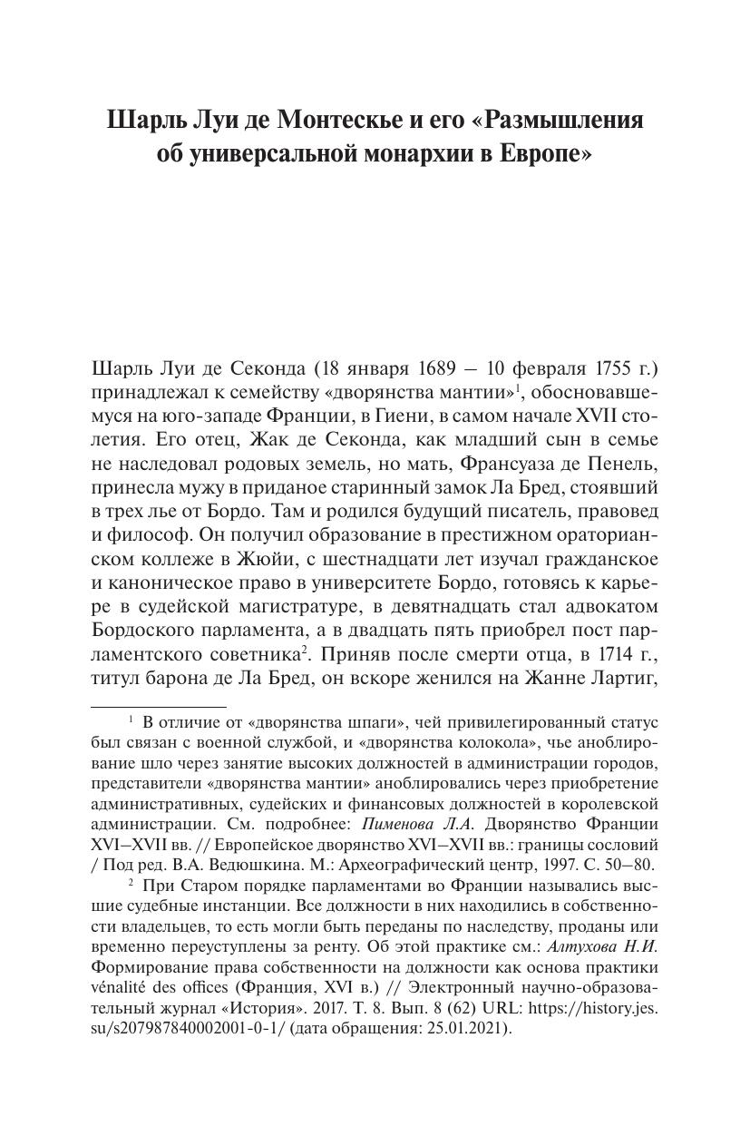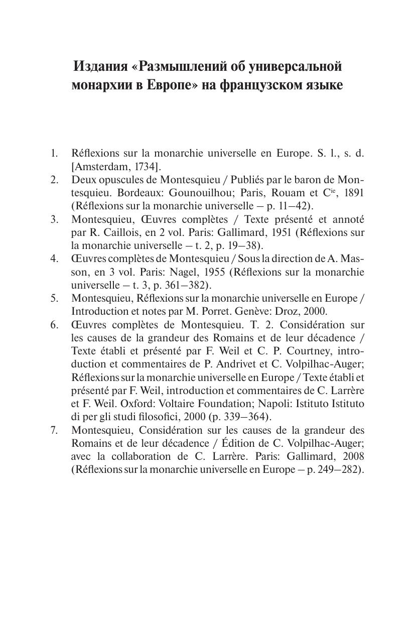 Настоящее издание впервые знакомит российского читателя с малоизвестным в России сочинением Монтескье. В политической лексике XVII–XIX вв. термин «универсальная монархия» обозначал стремление той или иной держа- вы силой утвердить свое превосходство над соседями и играть в европейских делах доминирующую роль. Эти амбиции современники усматривали, в частности, во внешней политике Людовика XIV. Задавшись вопросом, а может ли в современную ему эпоху один из народов Европы, подобно римлянам, действительно добиться прочного владычества над другими, Монтескье в своих «Размышлениях об универсальной монархии в Европе» пришел к отрицательному выводу, предложив целый ряд оригинальных аргументов. В книгу включены также избранные мысли философа о государстве и обществе, о праве и власти, о политике и религии, о себе самом и о человеке вообще. Многие из этих мыслей перекликаются с вопросами, поднятыми в «Размышлениях об универсальной монархии». Издание адресовано широкому кругу читателей и особенно тем, кто профессионально изучает или интересуется идеями французского Просвещения.