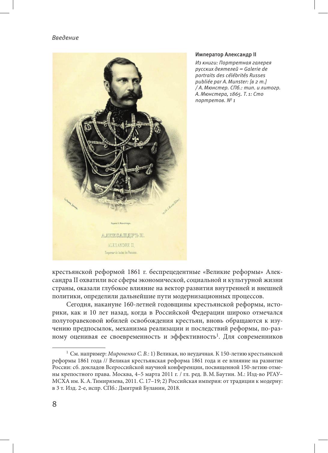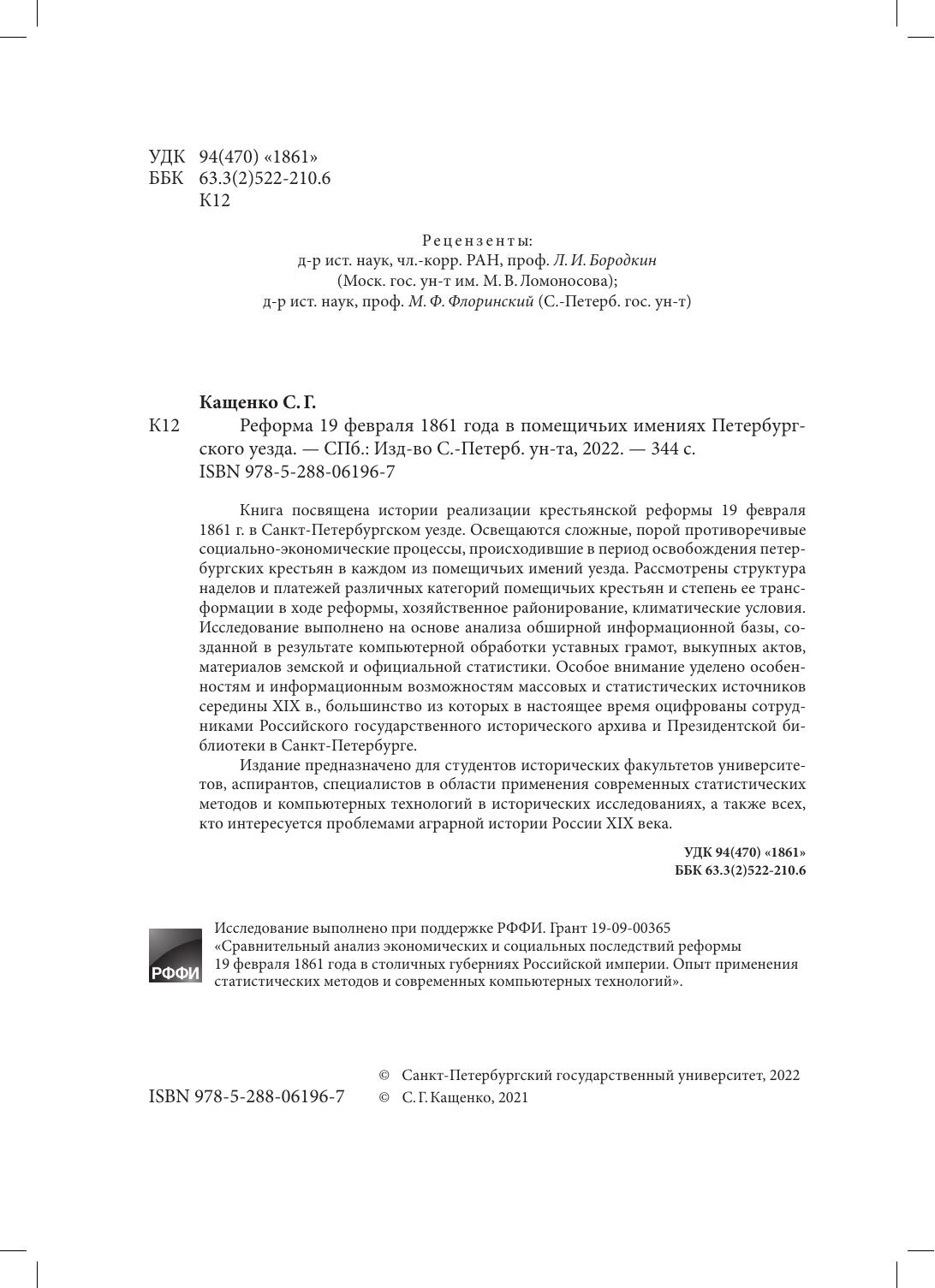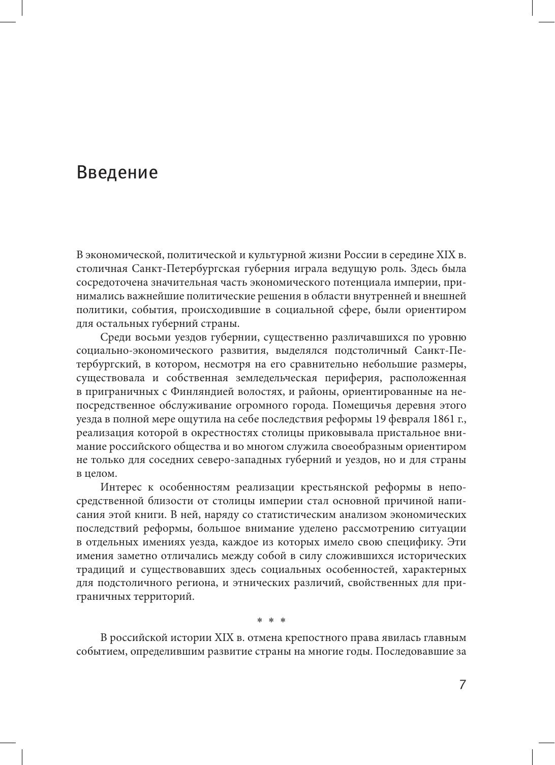 Книга посвящена истории реализации крестьянской реформы 19 февраля 1861 г. в Санкт-Петербургском уезде. Освещаются сложные, порой противоречивые социально-экономические процессы, происходившие в период освобождения петербургских крестьян в каждом из помещичьих имений уезда. Рассмотрены структура наделов и платежей различных категорий помещичьих крестьян и степень ее трансформации в ходе реформы, хозяйственное районирование, климатические условия. Исследование выполнено на основе анализа обширной информационной базы, созданной в результате компьютерной обработки уставных грамот, выкупных актов, материалов земской и официальной статистики. Особое внимание уделено особенностям и информационным возможностям массовых и статистических источников середины XIX в., большинство из которых в настоящее время оцифрованы сотрудниками Российского государственного исторического архива и президентской библиотеки в Санкт-Петербурге.