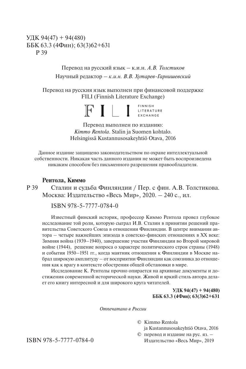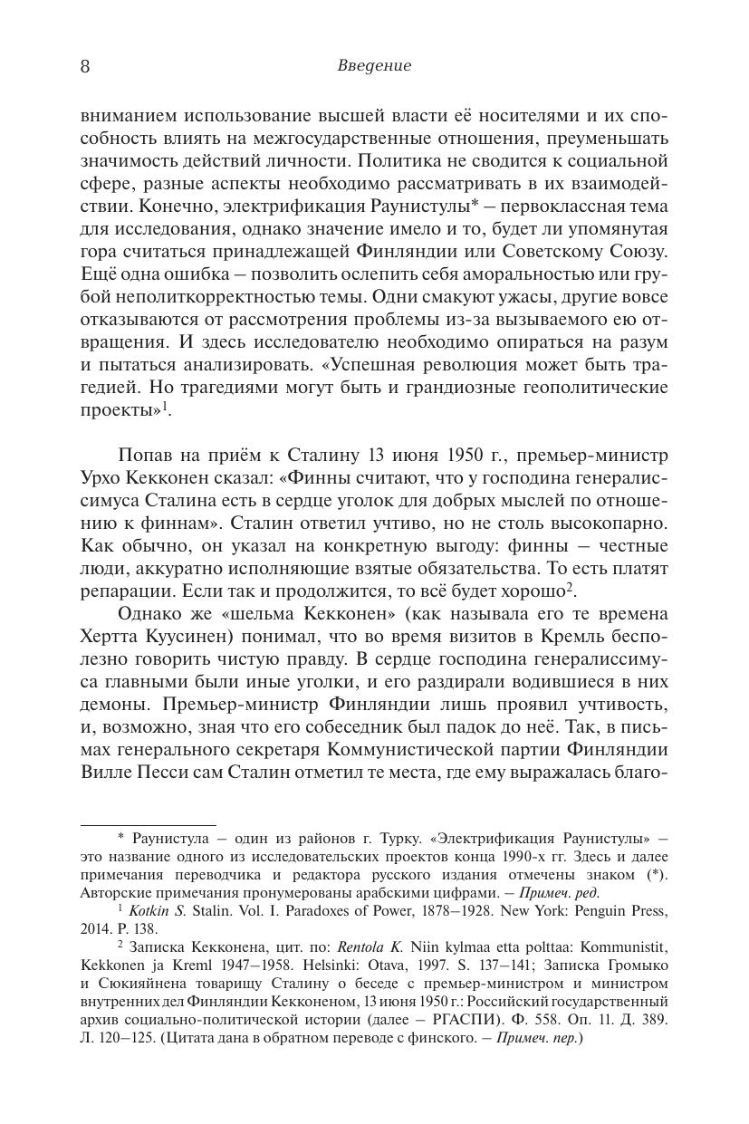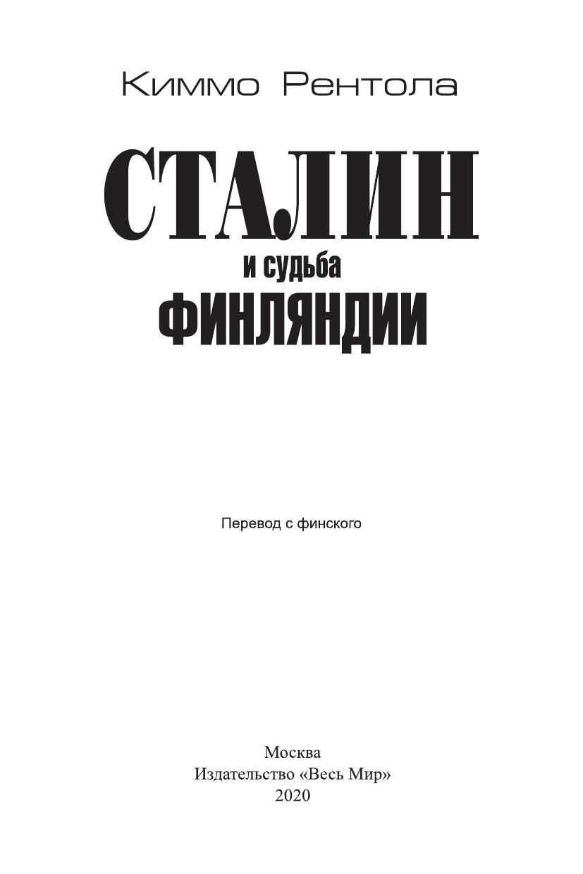 Известный финский историк, профессор Киммо Рентола провел глубокое исследование той роли, которую сыграл И.В. Сталин в принятии решений правительства Советского Союза в отношении Финляндии. В центре внимания автора – четыре важнейших эпизода в советско-финских отношениях в XX веке: Зимняя война (1939–1940), завершение участия Финляндии во Второй мировой войне (1944), решение вопроса о характере политического строя страны (1948) и события 1950–1951 гг., когда маятник отношения к Финляндии в Москве набрал широкую амплитуду – от восприятии Финляндии как союзника до отношения как к врагу в контексте обострения общей обстановки в мире. Исследование К. Рентолы прочно опирается на архивные документы и достижения современной исторической науки. Живой и яркий стиль автора делает его книгу интересной и для широкого круга читателей.