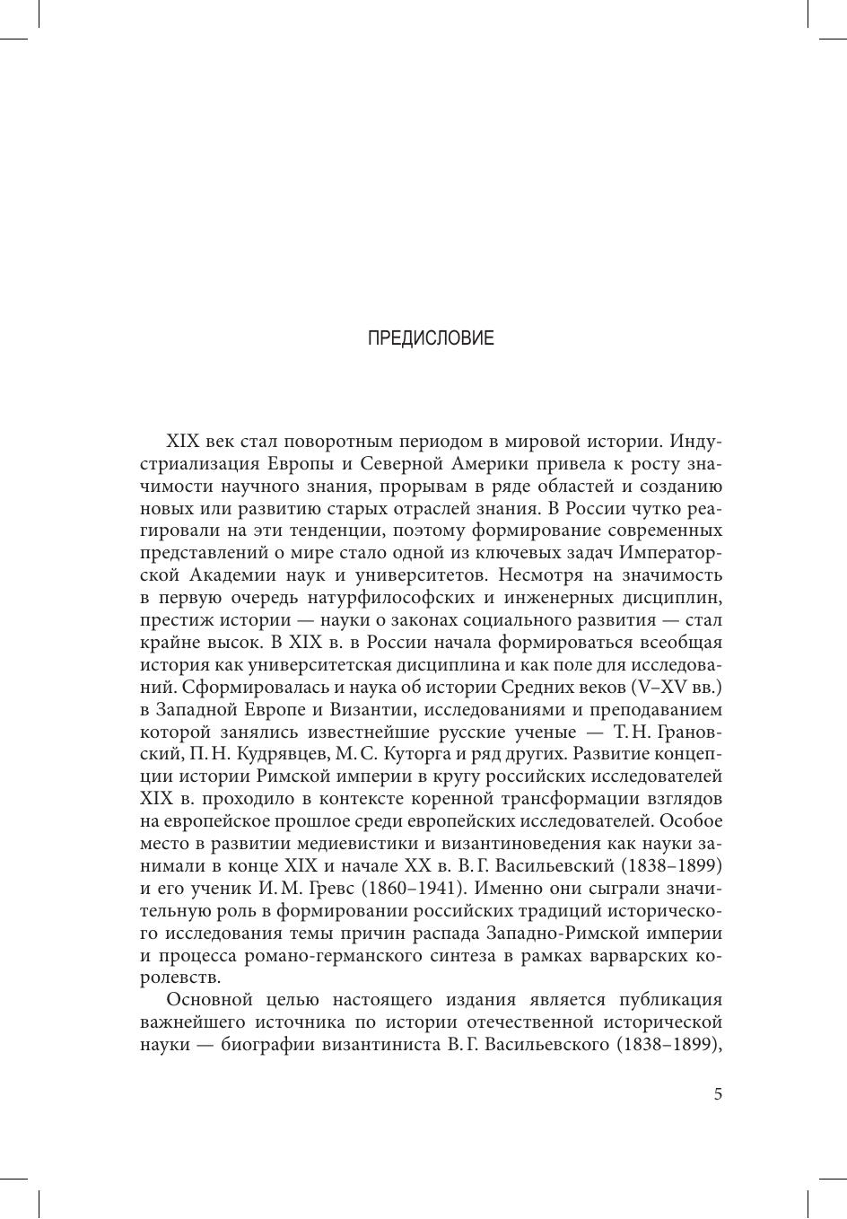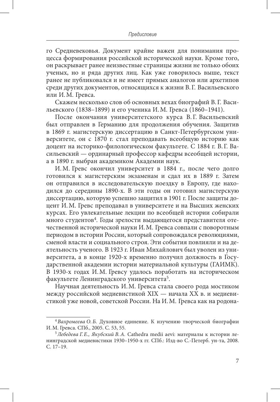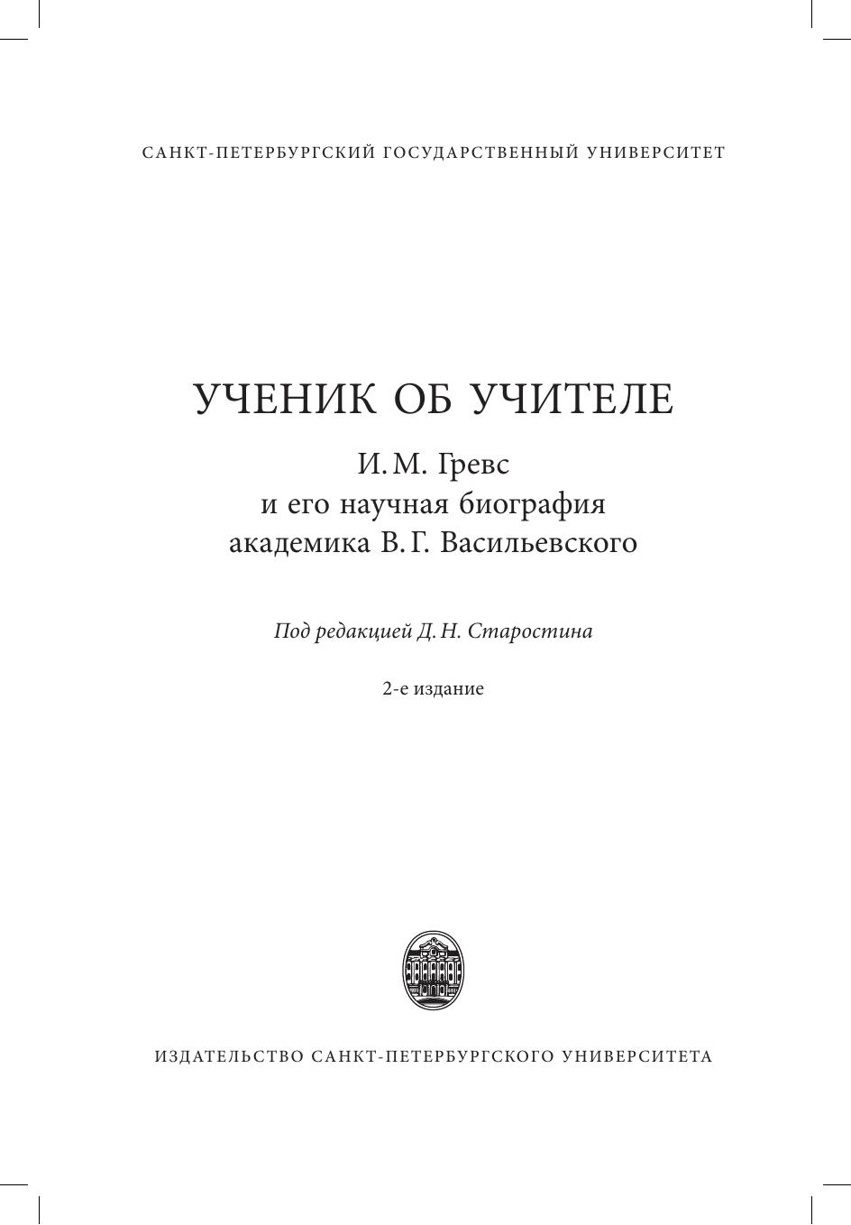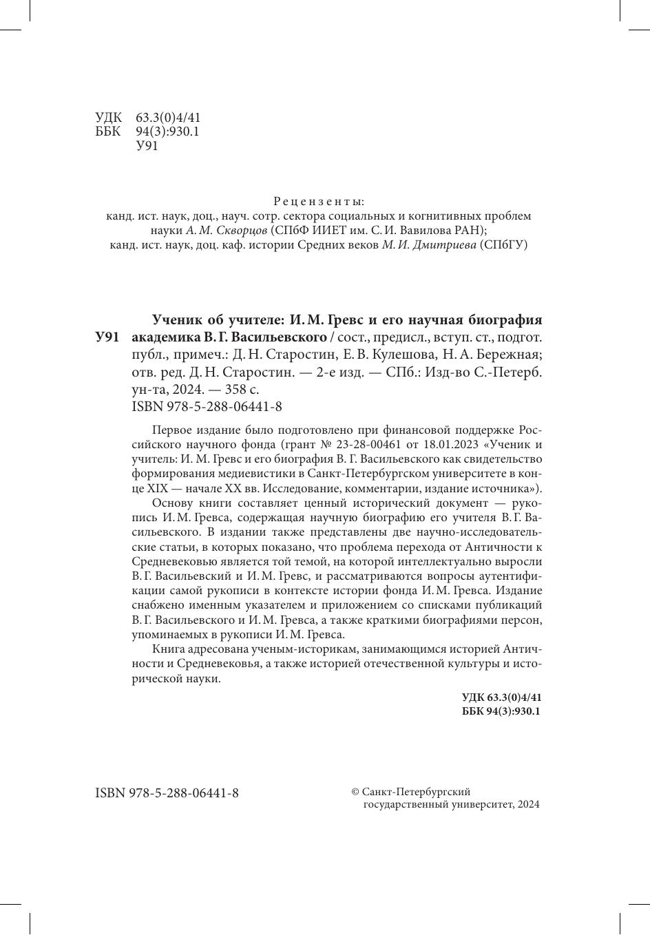 Первое издание было подготовлено при финансовой поддержке Российского научного фонда (грант № 23-28-00461 от 18.01.2023 "Ученик и учитель: И.М. Гревс и его биография В.Г. Васильевского как свидетельство формирования медиевистики в Санкт-Петербургском университете в конце XIX- начале XX вв. Исследование, комментарии, издание источника"). Основу книги составляет ценный исторический документ - рукопись И.М. Гревса, содержащая научную биографию его учителя В.Г. Васильевского. В издании также представлены две научно-исследовательские статьи, в которых показано, что проблема перехода от Античности к Средневековью является той темой, на которой интеллектуально выросли В.Г. Васильевский и И.М. Гревс, и рассматриваются вопросы аутентификации самой рукописи в контексте истории фонда И.М. Гревса. Издание снабжено именным указателем и приложением со списками публикаций В.Г. Васильевского и И.М. Гревса, а также краткими биографиями персон, упоминаемых в рукописи И.М. Гревса. Книга адресована ученым-историкам, занимающимся историей Античности с Средневековья, а также историей отечестченной культуры и исторической науки.