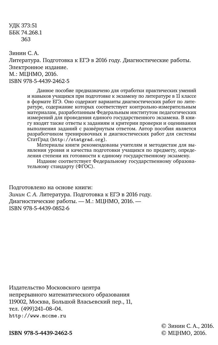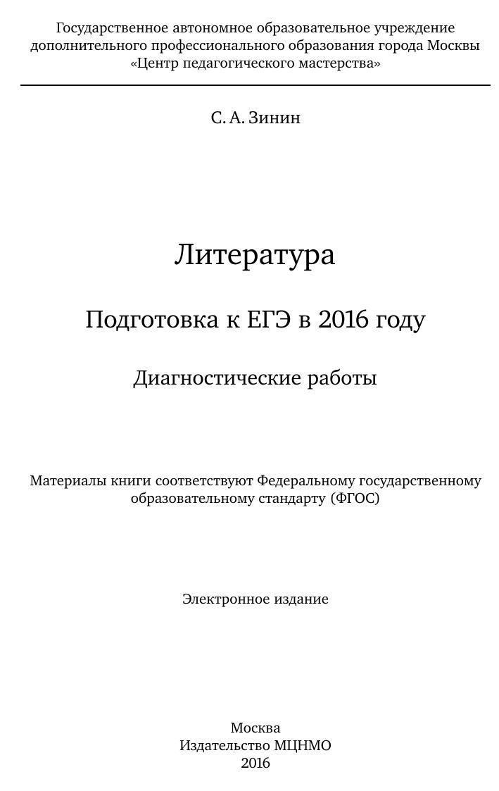 Данное пособие предназначено для отработки практических умений и навыков учащихся при подготовке к экзамену по литературе в 11 классе в формате ЕГЭ. Оно содержит варианты диагностических работ по литературе, содержание которых соответствует контрольно-измерительным материалам, разработанным Федеральным институтом педагогических измерений для проведения единого государственного экзамена. В книгу входят также ответы к заданиям и критерии проверки и оценивания выполнения заданий с развёрнутым ответом. Автор пособия является разработчиком тренировочных и диагностических работ для системы СтатГрад (http://statgrad.org). Материалы книги рекомендованы учителям и методистам для выявления уровня и качества подготовки учащихся по предмету, определения степени их готовности к единому государственному экзамену. Издание соответствует Федеральному государственному образовательному стандарту (ФГОС).