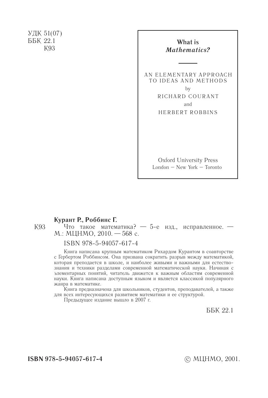 Книга написана крупным математиком Рихардом Курантом в соавторстве с Гербертом Роббинсом. Она призвана сократить разрыв между математикой, которая преподается в школе, и наиболее живыми и важными для естествознания и техники разделами современной математической науки. Начиная с элементарных понятий, читатель движется к важным областям современной науки. Книга написана доступным языком и является классикой популярного жанра в математике.Книга предназначена для школьников, студентов, преподавателей, а также для всех интересующихся развитием математики и ее структурой.