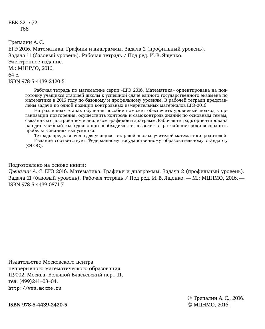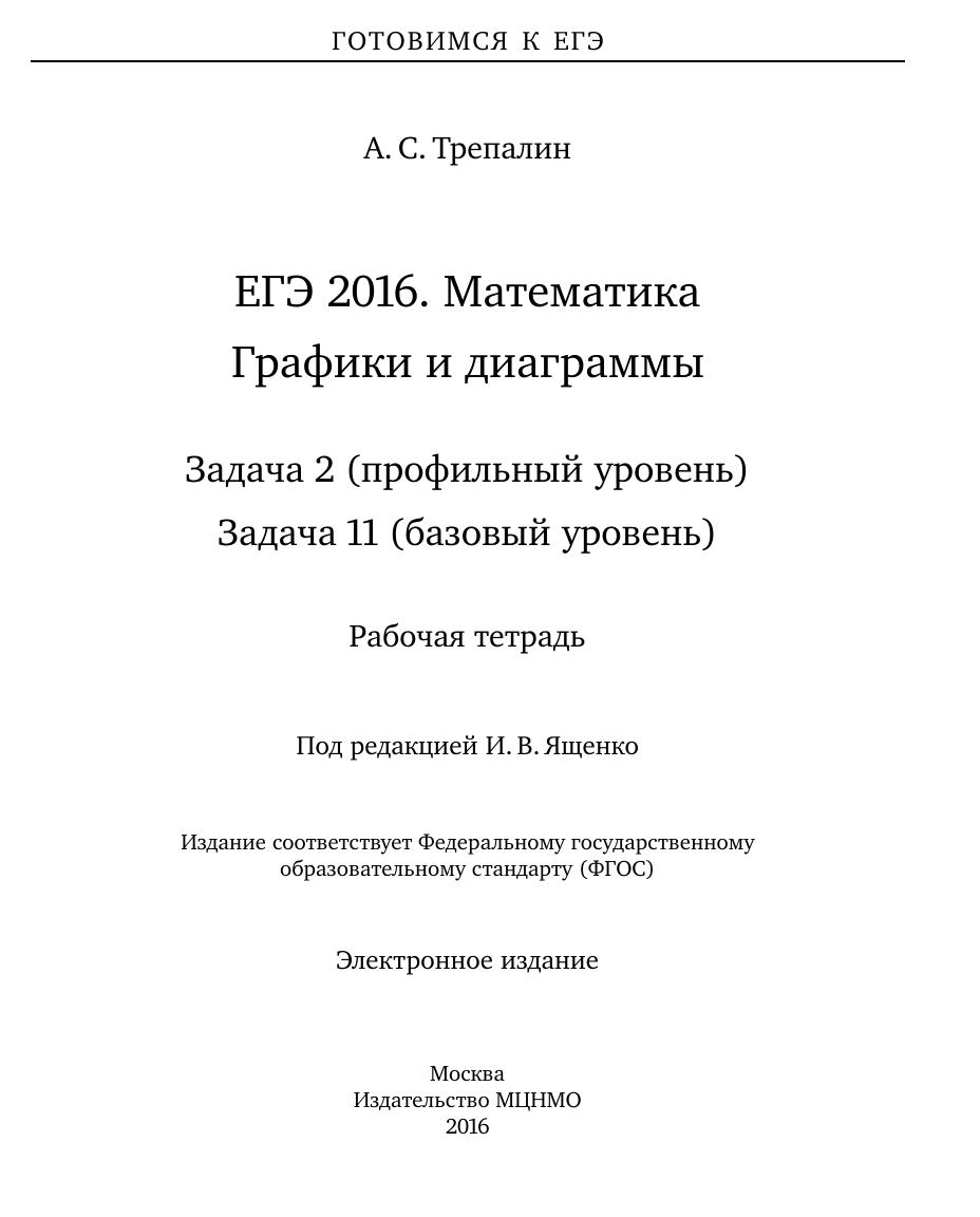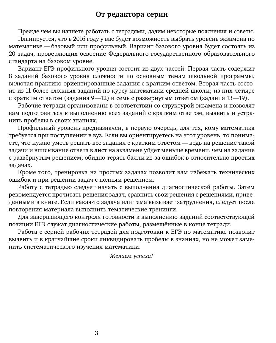 Рабочая тетрадь по математике серии «ЕГЭ 2016. Математика» ориентирована на подготовку учащихся старшей школы к успешной сдаче единого государственного экзамена по математике в 2016 году по базовому и профильному уровням. В рабочей тетради представлены задачи по одной позиции контрольных измерительных материалов ЕГЭ-2016. На различных этапах обучения пособие поможет обеспечить уровневый подход к организации повторения, осуществить контроль и самоконтроль знаний по основным темам, связанным с построением и анализом графиков и диаграмм. Рабочая тетрадь ориентирована на один учебный год, однако при необходимости позволит в кратчайшие сроки восполнить пробелы в знаниях выпускника. Тетрадь предназначена для учащихся старшей школы, учителей математики, родителей. Издание соответствует Федеральному государственному образовательному стандарту (ФГОС).