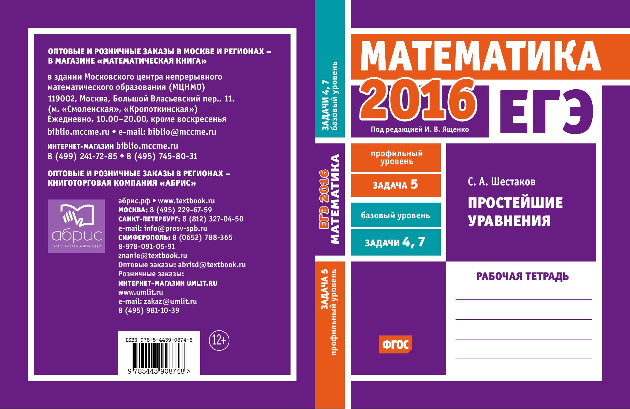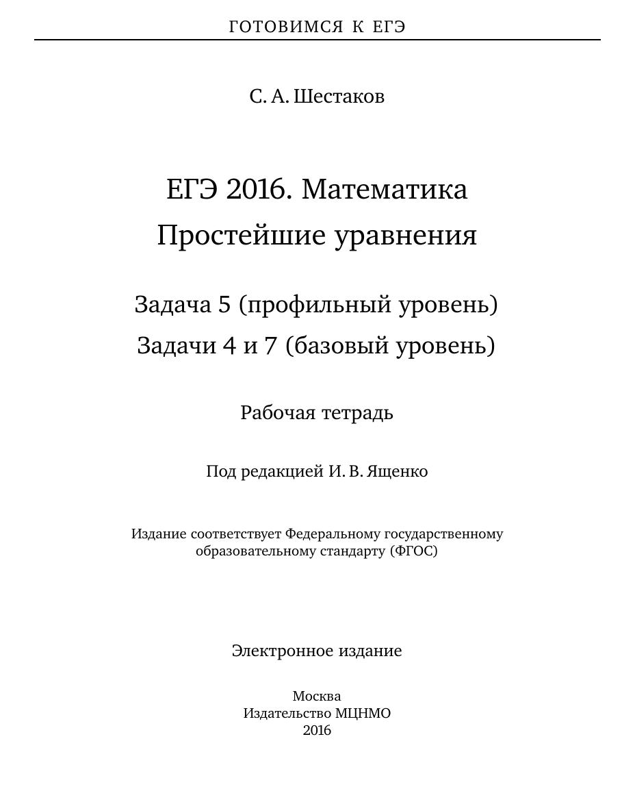 Рабочая тетрадь по математике серии «ЕГЭ 2016. Математика» ориентирована на подготовку учащихся старшей школы к успешной сдаче единого государственного экзамена по математике в 2016 году по базовому и профильному уровням. В рабочей тетради представлены задачи по одной позиции контрольных измерительных материалов ЕГЭ-2016. На различных этапах обучения пособие поможет обеспечить уровневый подход к организации повторения, осуществить контроль и самоконтроль знаний по теме «Простейшие уравнения». Рабочая тетрадь ориентирована на один учебный год, однако при необходимости позволит в кратчайшие сроки восполнить пробелы в знаниях выпускника. Тетрадь предназначена для учащихся старшей школы, учителей математики, родителей. Издание соответствует Федеральному государственному образовательному стандарту (ФГОС).