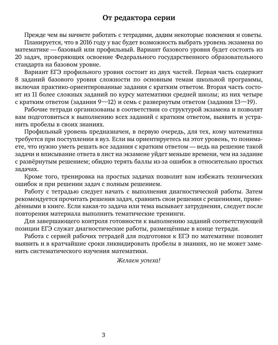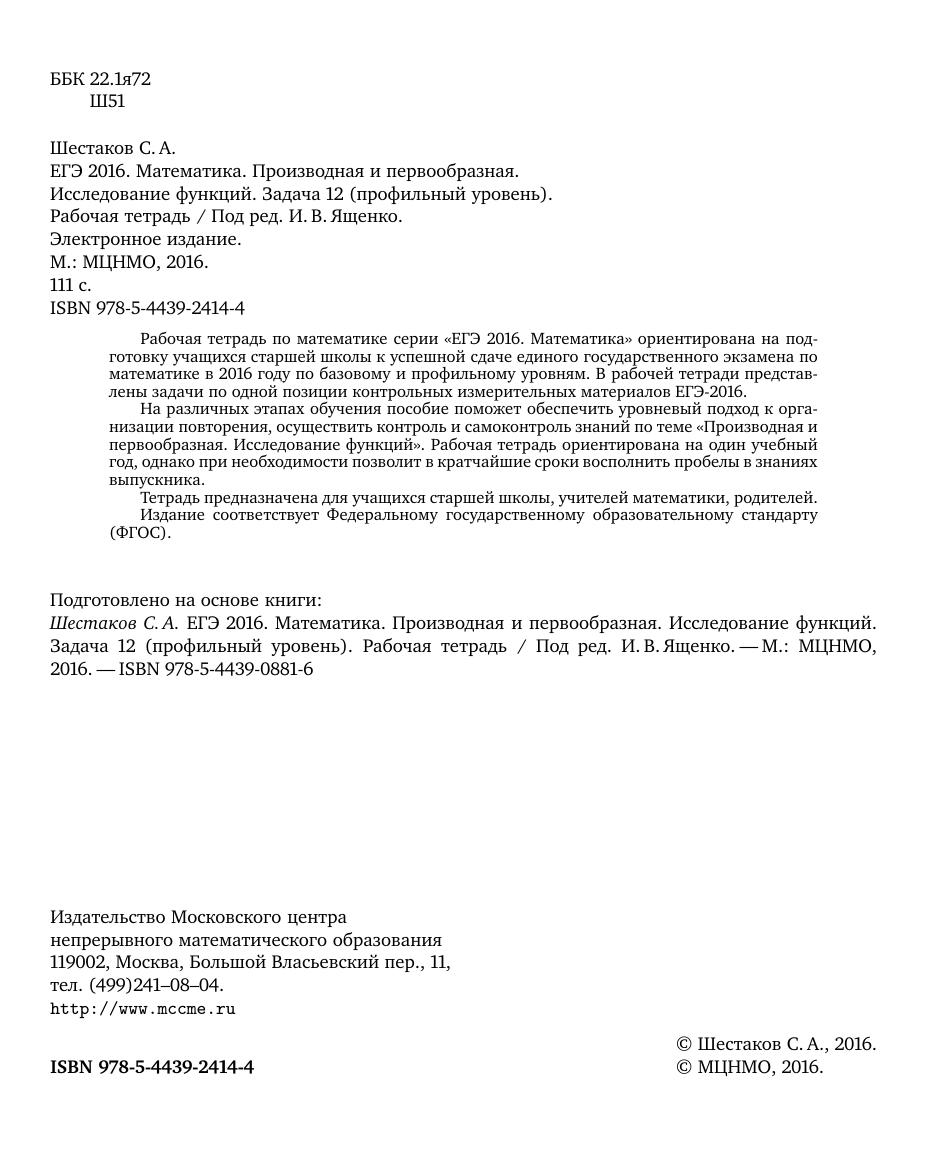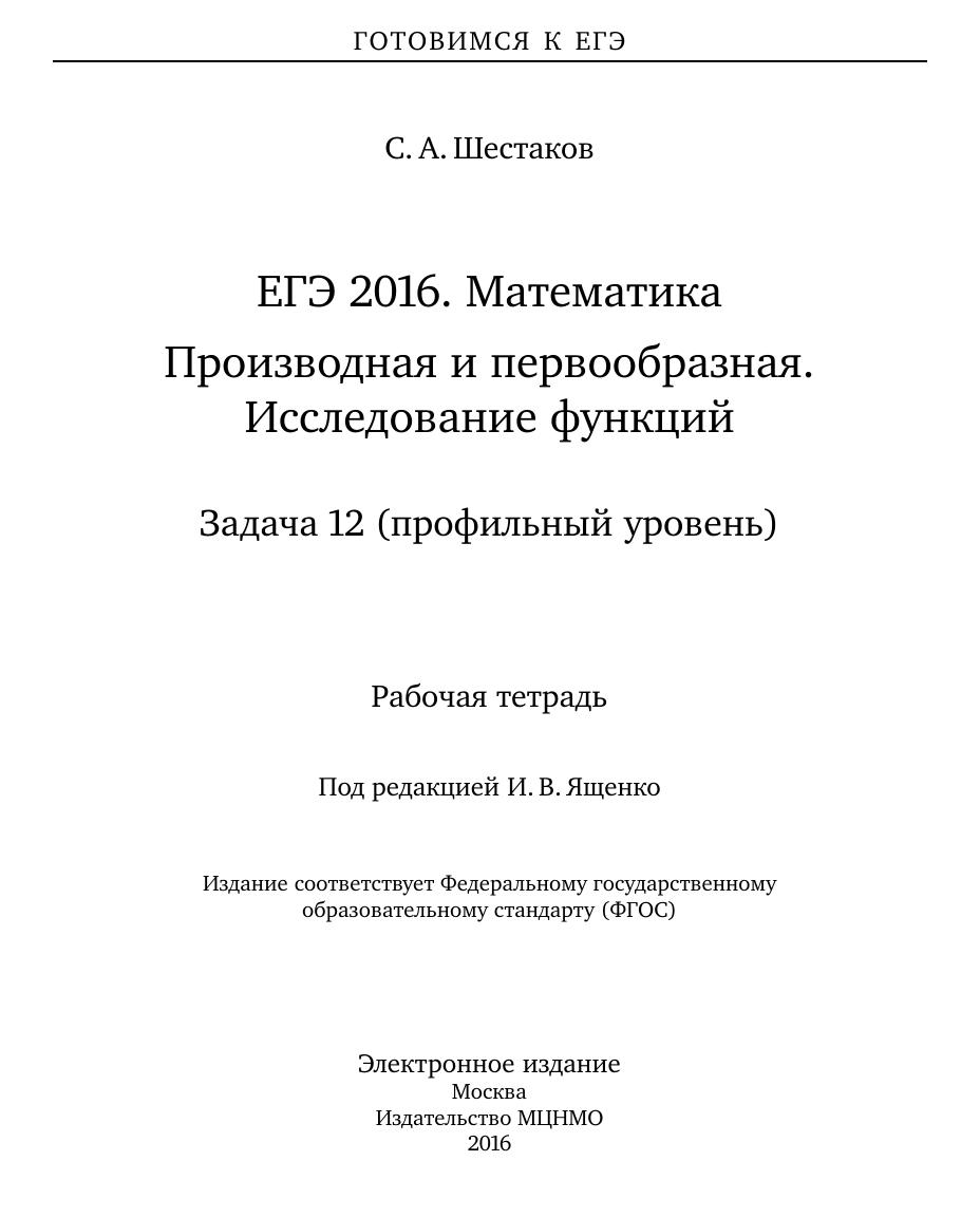 Рабочая тетрадь по математике серии «ЕГЭ 2016. Математика» ориентирована на подготовку учащихся старшей школы к успешной сдаче единого государственного экзамена по математике в 2016 году по базовому и профильному уровням. В рабочей тетради представлены задачи по одной позиции контрольных измерительных материалов ЕГЭ-2016. На различных этапах обучения пособие поможет обеспечить уровневый подход к организации повторения, осуществить контроль и самоконтроль знаний по теме «Производная и первообразная. Исследование функций». Рабочая тетрадь ориентирована на один учебный год, однако при необходимости позволит в кратчайшие сроки восполнить пробелы в знаниях выпускника. Тетрадь предназначена для учащихся старшей школы, учителей математики, родителей. Издание соответствует Федеральному государственному образовательному стандарту (ФГОС).