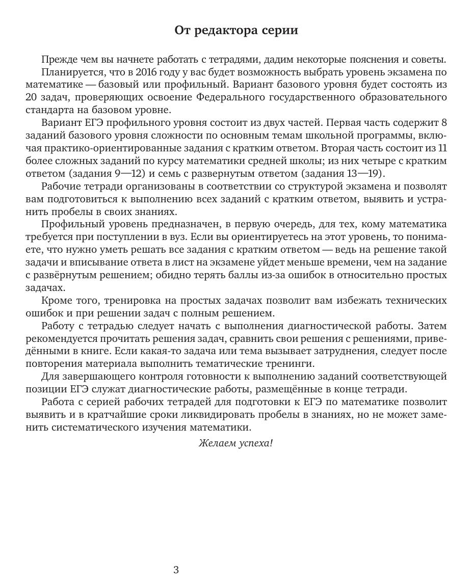 Рабочая тетрадь по математике серии «ЕГЭ 2016. Математика» ориентирована на подготовку учащихся старшей школы к успешной сдаче единого государственного экзамена по математике в 2016 году по базовому и профильному уровням. В рабочей тетради представлены задачи по одной позиции контрольных измерительных материалов ЕГЭ-2016. На различных этапах обучения пособие поможет обеспечить уровневый подход к организации повторения, осуществить контроль и самоконтроль знаний по основным темам, связанным с решением задач на составление уравнений. Рабочая тетрадь ориентирована на один учебный год, однако при необходимости позволит в кратчайшие сроки восполнить пробелы в знаниях выпускника. Тетрадь предназначена для учащихся старшей школы, учителей математики, родителей. Издание соответствует Федеральному государственному образовательному стандарту (ФГОС).
