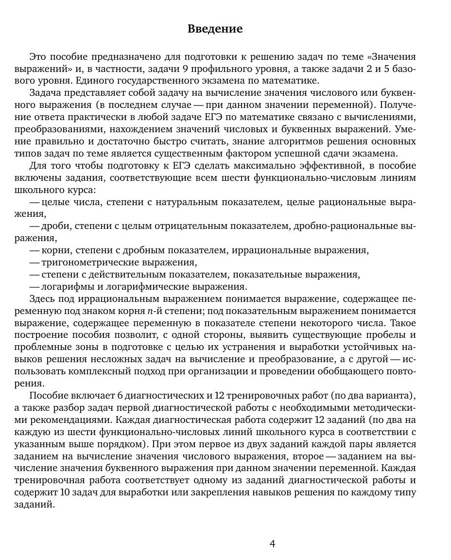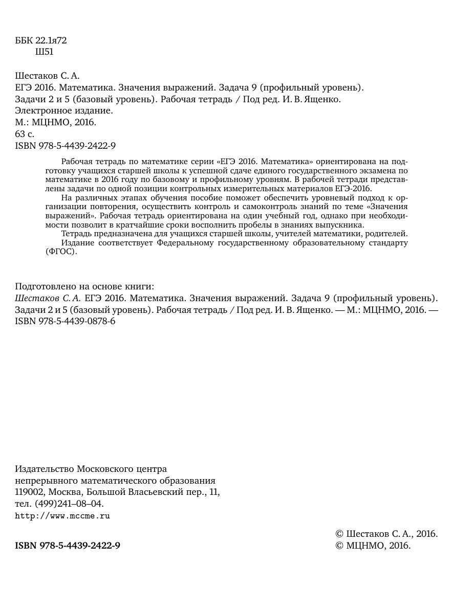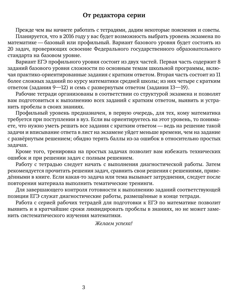 Рабочая тетрадь по математике серии «ЕГЭ 2016. Математика» ориентирована на подготовку учащихся старшей школы к успешной сдаче единого государственного экзамена по математике в 2016 году по базовому и профильному уровням. В рабочей тетради представлены задачи по одной позиции контрольных измерительных материалов ЕГЭ-2016. На различных этапах обучения пособие поможет обеспечить уровневый подход к организации повторения, осуществить контроль и самоконтроль знаний по теме «Значения выражений». Рабочая тетрадь ориентирована на один учебный год, однако при необходимости позволит в кратчайшие сроки восполнить пробелы в знаниях выпускника. Тетрадь предназначена для учащихся старшей школы, учителей математики, родителей. Издание соответствует Федеральному государственному образовательному стандарту (ФГОС).