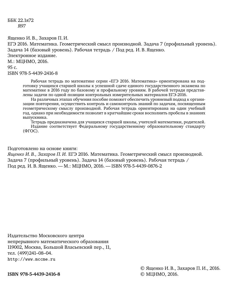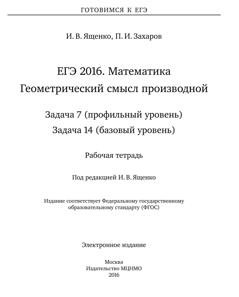 Рабочая тетрадь по математике серии «ЕГЭ 2016. Математика» ориентирована на подготовку учащихся старшей школы к успешной сдаче единого государственного экзамена по математике в 2016 году по базовому и профильному уровням. В рабочей тетради представлены задачи по одной позиции контрольных измерительных материалов ЕГЭ-2016. На различных этапах обучения пособие поможет обеспечить уровневый подход к организации повторения, осуществить контроль и самоконтроль знаний по задачам, посвященным геометрическому смыслу производной. Рабочая тетрадь ориентирована на один учебный год, однако при необходимости позволит в кратчайшие сроки восполнить пробелы в знаниях выпускника. Тетрадь предназначена для учащихся старшей школы, учителей математики, родителей. Издание соответствует Федеральному государственному образовательному стандарту (ФГОС).