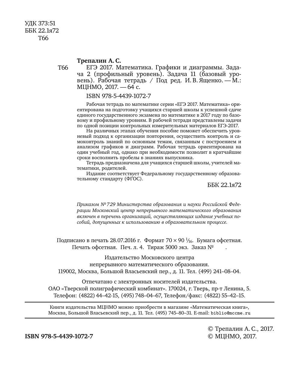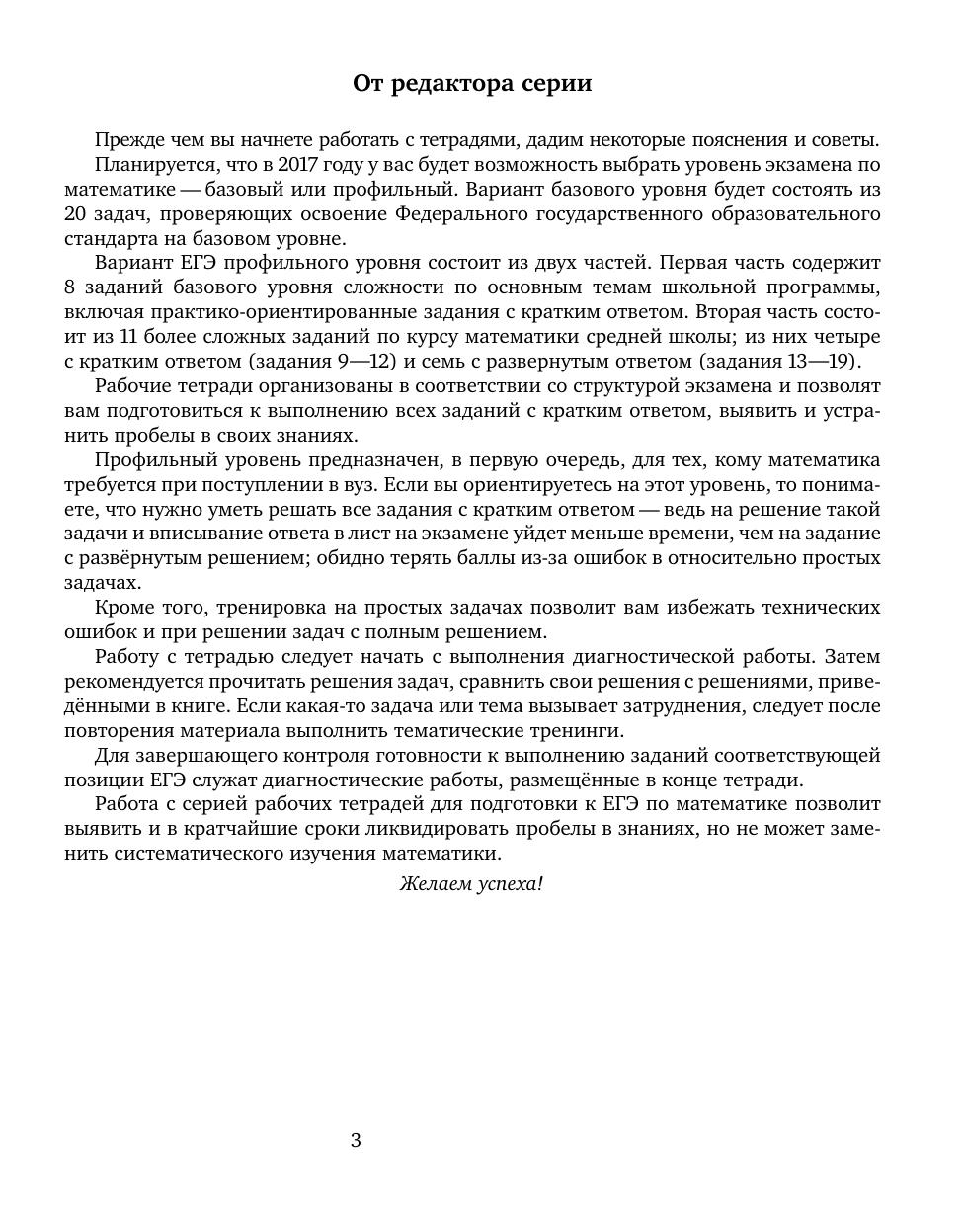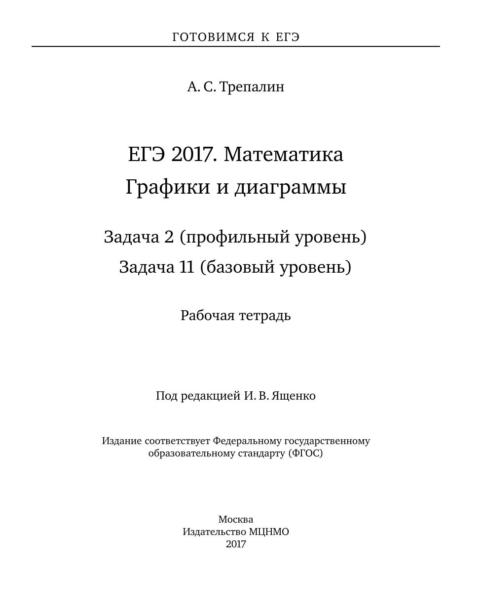 Рабочая тетрадь по математике серии «ЕГЭ 2017. Математика» ориентирована на подготовку учащихся старшей школы к успешной сдаче единого государственного экзамена по математике в 2017 году по базовому и профильному уровням. В рабочей тетради представлены задачи по одной позиции контрольных измерительных материалов ЕГЭ-2017. На различных этапах обучения пособие поможет обеспечить уровневый подход к организации повторения, осуществить контроль и самоконтроль знаний по основным темам, связанным с построением и анализом графиков и диаграмм. Рабочая тетрадь ориентирована на один учебный год, однако при необходимости позволит в кратчайшие сроки восполнить пробелы в знаниях выпускника.