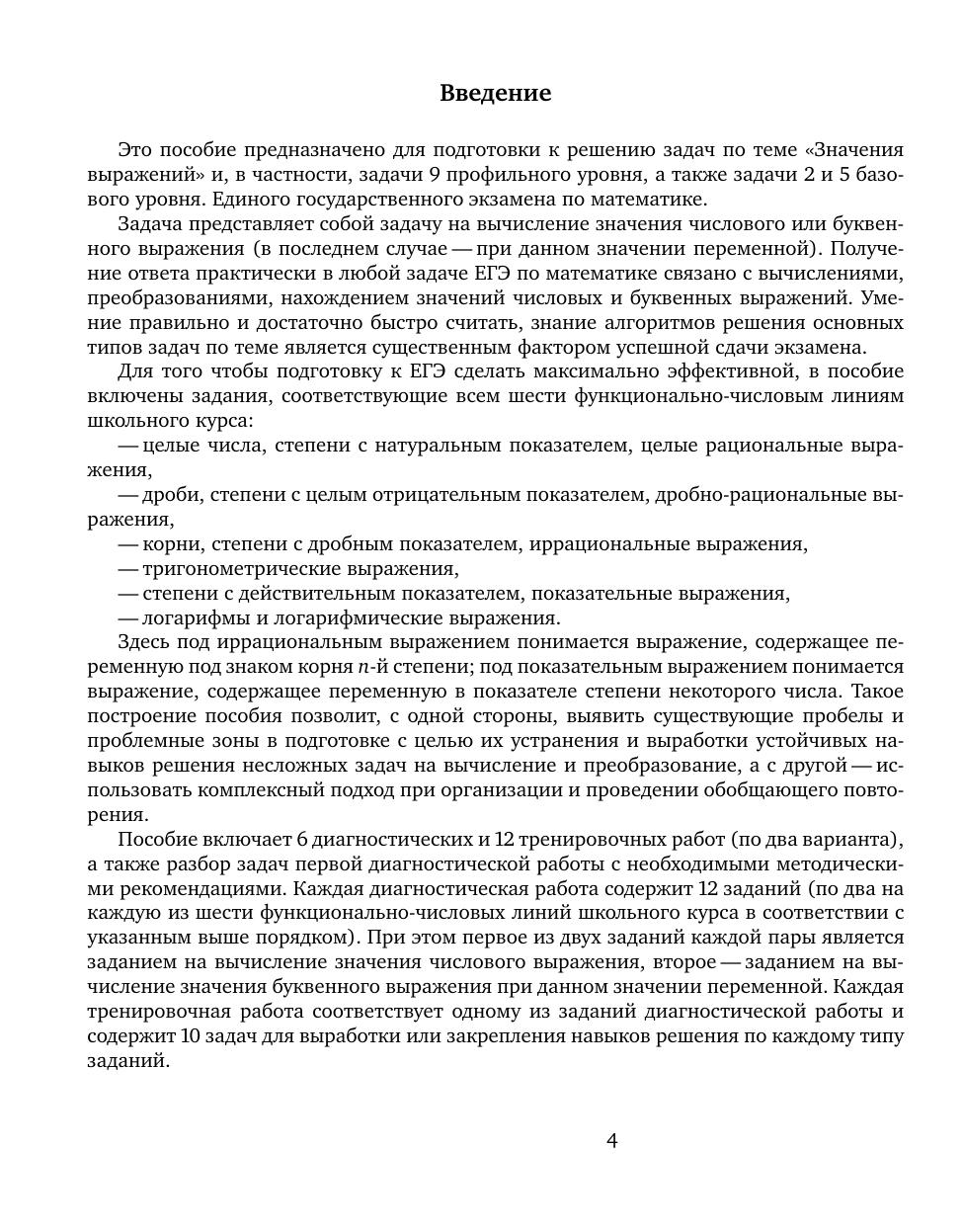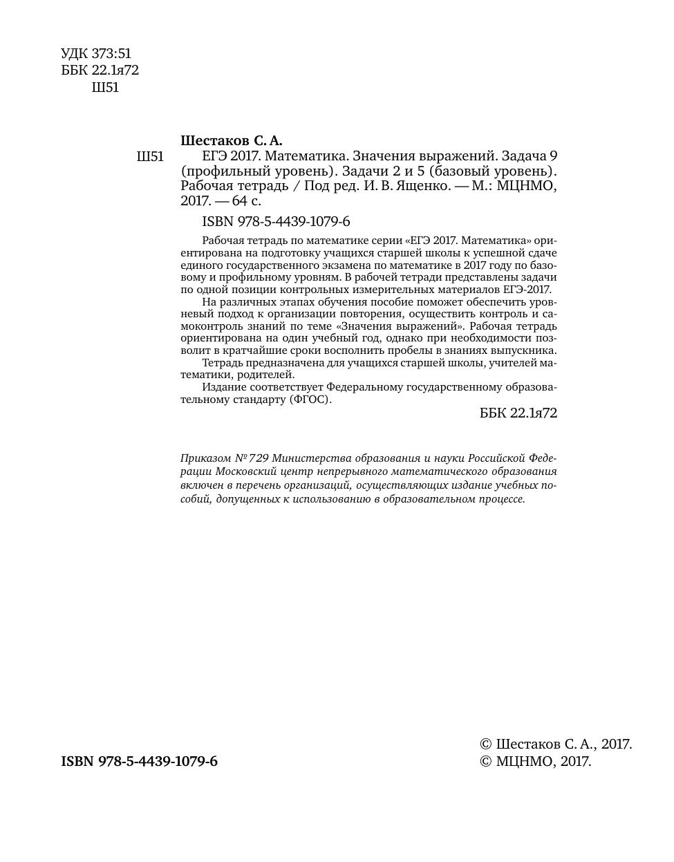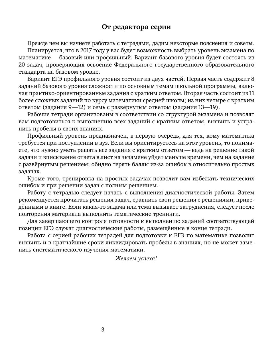 Рабочая тетрадь по математике серии «ЕГЭ 2017. Математика» ориентирована на подготовку учащихся старшей школы к успешной сдаче единого государственного экзамена по математике в 2017 году по базовому и профильному уровням. В рабочей тетради представлены задачи по одной позиции контрольных измерительных материалов ЕГЭ-2017. На различных этапах обучения пособие поможет обеспечить уровневый подход к организации повторения, осуществить контроль и самоконтроль знаний по теме «Значения выражений». Рабочая тетрадь ориентирована на один учебный год, однако при необходимости позволит в кратчайшие сроки восполнить пробелы в знаниях выпускника.