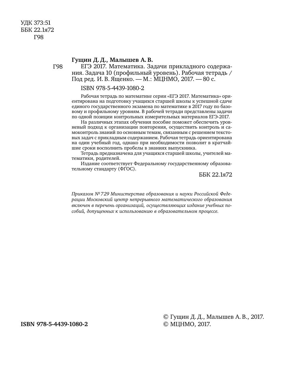 Рабочая тетрадь по математике серии «ЕГЭ 2017. Математика» ориентирована на подготовку учащихся старшей школы к успешной сдаче единого государственного экзамена по математике в 2017 году по базовому и профильному уровням. В рабочей тетради представлены задачи по одной позиции контрольных измерительных материалов ЕГЭ-2017. На различных этапах обучения пособие поможет обеспечить уровневый подход к организации повторения, осуществить контроль и самоконтрользнаний поосновным темам, связанным с решением текстовых задач с прикладным содержанием. Рабочая тетрадь ориентирована на один учебный год, однако при необходимости позволит в кратчайшие сроки восполнить пробелы в знаниях выпускника.