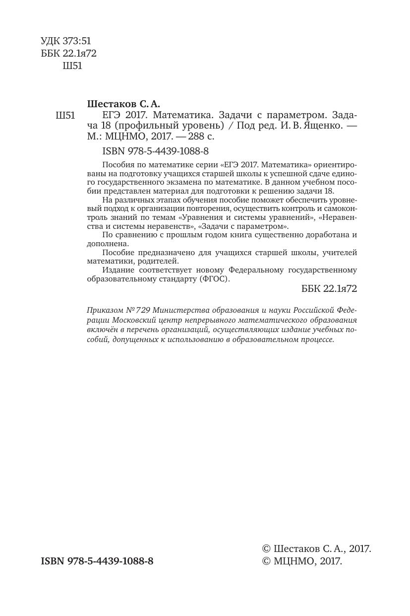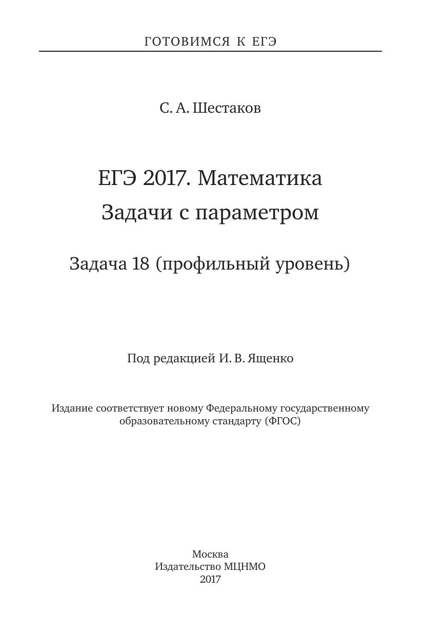 Пособия по математике серии «ЕГЭ 2017. Математика» ориентированы на подготовку учащихся старшей школы к успешной сдаче единого государственного экзамена по математике. В данном учебном пособии представлен материал для подготовки к решению задачи 18. На различных этапах обучения пособие поможет обеспечить уровневый подход к организацииповторения,осуществитьконтроль и самоконтроль знаний по темам «Уравнения и системы уравнений», «Неравенства и системы неравенств», «Задачи с параметром». По сравнению с прошлым годом книга существенно доработана и дополнена.