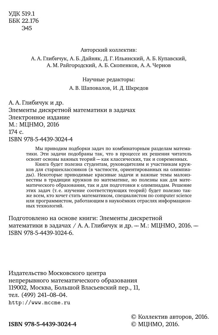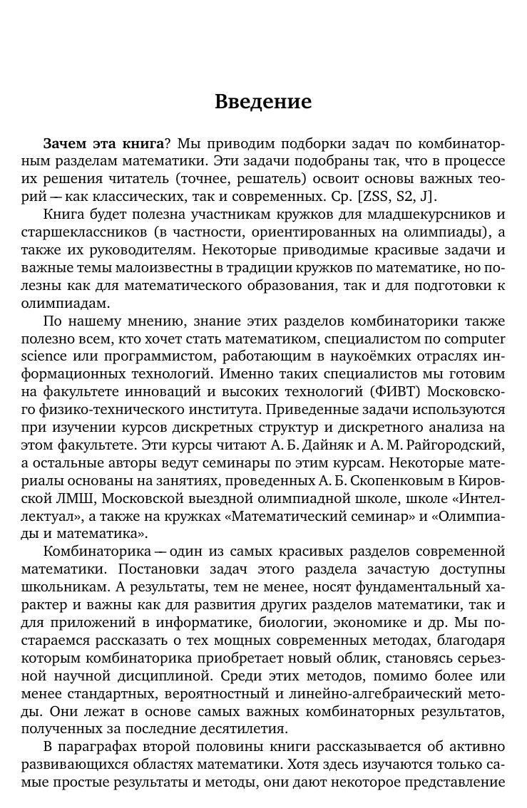 Мы приводим подборки задач по комбинаторным разделам математики. Эти задачи подобраны так, что в процессе их решения читатель освоит основы важных теорий––как классических, так и современных. Книга будет полезна студентам, руководителям и участникам кружков для старшеклассников (в частности, ориентированных на олимпиады). Некоторые приводимые красивые задачи и важные темы малоизвестны в традиции кружков по математике, но полезны как для математического образования, так и для подготовки к олимпиадам. Решение этих задач (т.е. изучение соответствующих теорий) будет полезно также всем, кто хочет стать математиком, специалистом по computer science или программистом, работающим в наукоёмких отраслях информационных технологий.